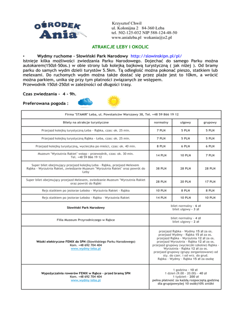 Krzysztof Chwil ul. Kolonijna 2 84-360 Łeba tel. 502-125-032 NIP 588-124-48-50 www.anialeba.pl [email protected] ATRAKCJE ŁEBY I OKOLIC • Wydmy ruchome – Słowiński Park Narodowy http://slowinskipn.pl/pl/ Istnieje kilka możliwości zwiedzania Parku Narodowego. Dojechać do samego Parku można autokarem(150zł-50os.) w obie strony lub kolejką bajkową turystyczną ( jak niżej ). Od bramy parku do samych wydm dzieli turystów 5.5km. Tą odległość można pokonać pieszo, statkiem lub melexami. Do ruchomych wydm można także dostać się przez plaże jest to 10km, a wrócić można parkiem, unika się przy tym płatności związanych ze wstępem. Przewodnik 150zł-250zł w zależności od długości trasy. Czas zwiedzania - 4 - 9h. Preferowana pogoda : Firma "STAMIR" Łeba, ul. Powstańców Warszawy 38, Tel. +48 59 866 19 12 Bilety na atrakcje turystyczne normalny ulgowy grupowy Przejazd kolejką turystyczną Łeba - Rąbka, czas: ok. 25 min. 7 PLN 5 PLN 5 PLN Przejazd kolejką turystyczną Rąbka - Łeba, czas: ok. 25 min. 7 PLN 5 PLN 5 PLN Przejazd kolejką turystyczną, wycieczka po mieści, czas: ok. 40 min. 8 PLN 6 PLN 6 PLN Muzeum "Wyrzutnia Rakiet" wstęp - przewodnik, czas: ok. 30 min. Tel. +48 59 866 19 12 14 PLN 10 PLN 7 PLN Super bilet obejmujący przejazd kolejką Łeba - Rąbka, przejazd Melexem Rąbka - Wyrzutnia Rakiet, zwiedzanie Muzeum "Wyrzutnia Rakiet" oraz powrót do Łeby 38 PLN 28 PLN 28 PLN Super bilet obejmujący przejazd Melexem, zwiedzanie Muzeum "Wyrzutnia Rakiet oraz powrót do Rąbki 28 PLN 20 PLN 17 PLN Rejs statkiem po jeziorze Łebsko - Wyrzutnia Rakiet - Rąbka 10 PLN 8 PLN 8 PLN Rejs statkiem po jeziorze Łebsko - Rąbka – Wyrzutnia Rakiet 14 PLN 10 PLN 10 PLN Słowiński Park Narodowy bilet normalny - 6 zł bilet ulgowy - 3 zł Filia Muzeum Przyrodniczego w Rąbce bilet normalny - 4 zł bilet ulgowy - 2 zł Wózki elektryczne FENIX do SPN (Słowińskiego Parku Narodowego) Kom. +48 692 704 404 www.wydmy-leba.pl przejazd Rąbka - Wydmy 15 zł za os. przejazd Wydmy - Rąbka 15 zł za os. przejazd Rąbka - Wyrzutnia 12 zł za os. przejazd Wyrzutnia - Rąbka 12 zł za os. przejazd grupowy (wycieczki szkolne) Rąbka Wyrzutnia - Rąbka 12 zł za os. przejazd grupowy (grupy zorganizowane) od sty. do czer. i od wrz. do grud. Rąbka - Wydmy - Rąbka 15 zł za osobę Wypożyczalnia rowerów FENIX w Rąbce - przed bramą SPN Kom. +48 692 704 404 www.wydmy-leba.pl 1 godzina - 10 zł 1 dzień (9.00 - 20.00) - 40 zł 1 tydzień - 200 zł pełna płatność za każdą rozpoczętą godzinę dla grup(powyżej 10 osób)10% zniżki • Latarnia morska Stilo tel. +48 58 676 33 06 Odległość od Łeby 12 km Przejazd autokarem w obie strony – 300zł/50os. Czynne: V, VI, IX w godz. 10:00 - 13:00, 14:00 - 17:00 VII, VIII w godz. 10:00 - 14:00, 15:00 - 19:00 Cennik: bilet normalny - 6 zł bilet szkolny - 4 zł Dzieci do lat 4 - gratis Czas zwiedzania - 2 - 3h. Preferowana pogoda : • Park Jurajski – www.lebapark.pl Park Dinozaurów w Łebie to 20ha świat zabawy dla całej rodziny, wspaniałe trasy pełne przygód i atrakcji, mnóstwo świetnej rozrywki. W czasie zwiedzania każdy z rodziców będzie miał niepowtarzalną możliwość obserwowania pociechy w sytuacjach nowych, nie odkrytych, pełnych żywiołowych reakcji. Największe pole do mini golfa w Polsce, Edukacyjna Gra Terenowa Indiana Jones, Dinozaurowe rzemiosło, mistrzostwa Parku w płukaniu złota. Czas zwiedzania - 4 - 6h Preferowana pogoda : Czynne: 23-29.04. w godz. 9.00-17.00 30.04.-03.05. w godz. 9.00-18.00 4.05.-24.06. w godz. 9.00-17.00 25.06.-28.08. w godz. 9.00-19.00 29.08.-4.09. w godz. 9.00-17.00 5.09.-2.10. w godz. 9.00-16.00 Park należy opuścić 1,5h po zamknięciu. Cennik: Bilet wstępu normalny – 40zł Bilet wstępu uglowy – 30zł Bilet wstępu grupowy – 19zł (dla grup powyżej 20 dzieci 1/15 gratis) Dzieci do lat 4 gratis • Power Park Łeba - www.powerpark.pl Power Park Łeba to niezwykły park rozrywki - miejsce szaleństw, spotkań, rywalizacji i zabawy. Wszystko mieści się, na obszarze dwóch hektarów różnorodnego terenu, czeka na Państwa wiele atrakcji, m.in.: wspaniały tor gokartowy, park linowy, wielki skok wahadłowy, pole do gry w paintball, tor off-road, kids park oraz strzelnicę i zaplecze gastronomiczne. Czas zwiedzania - nawet cały dzień Preferowana pogoda : Czynne: w godz. 10.00 - 22.00 • Wystawa motyli - www.muzeummotyli.pl Około 6 tysięcy spreparowanych motyli i owadów z całego świata. Czynne: Maj - Czerwiec: 10:00 - 18:00 Lipiec - Sierpień: 10:00 - 20:00 Wrzesień: 10:00 - 18:00 Cennik: normalny - 9 zł ulgowy -7 zł bilet grupowy - 6 zł (powyżej 10 osób) Opiekunowie grupy gratis Czas zwiedzania - 2 - 3h. Preferowana pogoda : • Ruiny kościoła z XIV wieku, kościół z 1682 roku ul. Turystyczna Czas zwiedzania - 0,5h. Preferowana pogoda : • Kino "Rybak" ul. Morska 1 i Kino 7 D max - ul. Morska 2 http://www.kino7dmax.pl/pl/leba Repertuar dostępny na stronie internetowej kina www.kinorybak.eu Preferowana pogoda : • Stadnina koni w Nowęcinie - www.stajniasenny.pl W naszej stadninie czeka na Państwa 30 koni, 3 kuce oraz nocleg. Wychodząc naprzeciw oczekiwaniom naszych klientów przewidujemy możliwość przyjazdu z własnym koniem. Dysponujemy dziesięcioma boksami do wynajęcia. Preferowana pogoda : Stadnina Koni MACIUKIEWICZ - www.nowecin.com.pl ul. św. Huberta 4 NOWĘCIN(2 km. od Łeby) Tel. +48 59 866 18 74, +48 59 866 10 75 (biuro w sezonie letnim) Przez cały rok (codziennie) w godzinach 8:00-13:00 i 15:00-20:00 Cennik: 0,5 godz. jazdy na ujeżdżalni - 30 zł 1 godz. jazdy na ujeżdżalni - 50 zł 2 godz. jazdy nad morzem - 100 zł 1 godz. jazdy wozem taborowym - 160 zł lekcja jazdy na lonży (15 min) - 30 zł cykl nauki jazdy na lonży dla 1 osoby (3x) - 75 zł oprowadzanie na koniu lub kucu (runda) - 5 zł za osobę (grupy powyżej 20 osób - 4 zł za osobę) trening indywidualny (dla 2 osób 80 zł od osoby) - 100 z