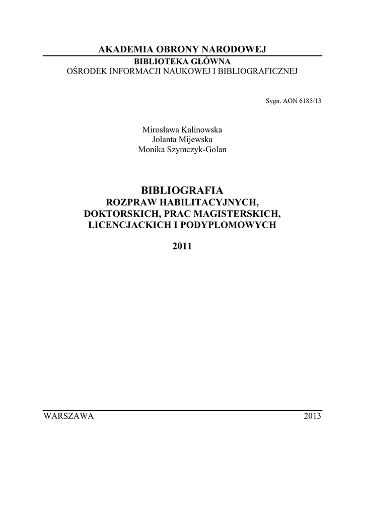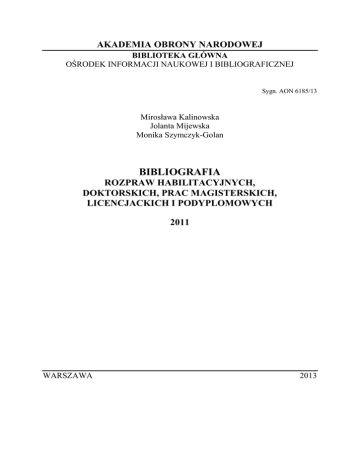 AKADEMIA OBRONY NARODOWEJ BIBLIOTEKA GŁÓWNA OŚRODEK INFORMACJI NAUKOWEJ I BIBLIOGRAFICZNEJ Sygn. AON 6185/13 Mirosława Kalinowska Jolanta Mijewska Monika Szymczyk-Golan BIBLIOGRAFIA ROZPRAW HABILITACYJNYCH, DOKTORSKICH, PRAC MAGISTERSKICH, LICENCJACKICH I PODYPLOMOWYCH 2011 WARSZAWA 2013 SPIS TREŚCI OD REDAKCJI………………………………………………………………………..... 3 ROZPRAWY HABILITACYJNE I DOKTORSKIE………………………………… 4 PRACE MAGISTERSKIE……………………………………………………………… 10 PRACE LICENCJACKIE……………………………………………………………… 74 PRACE PODYPLOMOWE…………………………………………………………… 117 INDEKS AUTORÓW I PROMOTORÓW…………………………………………… 141 INDEKS PRZEDMIOTOWY…………………………………………………………… 169 2 OD REDAKCJI Ośrodek Informacji Naukowej i Bibliograficznej Biblioteki Głównej Akademii Obrony Narodowej prowadzi dokumentację dorobku naukowego i dydaktycznego uczelni. Wyniki tej pracy prezentowane są między innymi w „Bibliografii rozpraw habilitacyjnych, doktorskich, prac magisterskich, licencjackich i podyplomowych”, oraz „Bibliografii publikacji pracowników Akademii Obrony Narodowej”. Niniejsze wydawnictwo prezentuje prace kwalifikacyjne za rok 2011. Bibliografia dostępna jest też w wersji elektronicznej na stronie internetowej biblioteki : www.biblioteka.aon.edu.pl/bibliografie/ Podział na rozprawy habilitacyjne, doktorskie, prace magisterskie, licencjackie i podyplomowe odpowiada strukturze kształcenia w Akademii Obrony Narodowej. „Bibliografia…” zawiera 1014 opisów bibliograficznych uszeregowanych alfabetycznie w obrębie działu przedstawiającego poszczególne rodzaje prac kwalifikacyjnych. Każdy z tych opisów obejmuje nazwisko i imię autora dysertacji, tytuł, nazwę jednostki organizacyjnej (wydział, katedra), imię i nazwisko promotora oraz pozostałe elementy opisu bibliograficznego wraz z sygnaturą. W znalezieniu właściwej informacji pomagają umieszczone na końcu Bibliografii indeksy: autorów prac wraz z promotorami, przedmiotowy, który opracowany został w oparciu o „Słownik Języka Haseł Przedmiotowych Nauk o Bezpieczeństwie i Obronności : polsko-angielski 1 oraz „Słownik Języka Haseł Przedmiotowych Biblioteki Narodowej”2. Oba indeksy kierują do wybranej pozycji poprzez wskaźnik liczbowy. 1 Słownik Języka Haseł Przedmiotowych Nauk o Bezpieczeństwie i Obronności : polsko-angielski / [zespół aut.: Grzegorz Kolek et al.] ; Centralna Biblioteka Wojskowa im. Marszałka Józefa Piłsudskiego, Akademia Obrony Narodowej. - Wyd. popr. i uzup., stan na dzień 30 kwietnia 2012. - Warszawa : Centralna Biblioteka Wojskowa. - 2012. 2 Słownik języka haseł przedmiotowych Biblioteki Narodowej. - Warszawa : BN, 2005. - Wyd. 5. - T. 1-3 3 ROZPRAWY HABILITACYJNE I DOKTORSKIE 1. ABGAROWICZ Grzegorz : Ochrona ludności w warunkach konfliktu zbrojnego w Polsce : rozprawa doktorska / promotor Grzegorz Sobolewski ; Wydział Bezpieczeństwa Narodowego. - Warszawa : AON, 2011. - 315 k. : il. BG AON sygn. S/8252 2. ANSZCZAK Marcin : Zastosowanie metody matrycowania w zarządzaniu systemem bezpieczeństwa dla Państwowej Straży Pożarnej : rozprawa doktorska / promotor Jarosław Wołejszo ; Wydział Zarządzania i Dowodzenia. - Warszawa : AON, 2011. - 157 k. (w tym złoż.) : il. (gł. kolor.) BG AON sygn. S/8141 3. BANASIK Mirosław : Transformacja zdolności Sił Zbrojnych NATO do działań ekspedycyjnych : rozprawa doktorska / promotor Maciej Marszałek ; Wydział Bezpieczeństwa Narodowego. - Warszawa : AON, 2011. - 287 s. BG AON sygn. S/8150 4. BORYN Paweł : Zastosowanie symulacyjnych modeli walki w procesie dowodzenia na szczeblu taktycznym wojsk lądowych Sił Zbrojnych RP : rozprawa doktorska / promotor Jarosław Wołejszo ; Wydział Zarządzania i Dowodzenia. Warszawa : AON, 2011. - 150 k. : il. kolor. BG AON sygn. S/8175 5. CHODAK Paweł : Korupcja w Siłach Zbrojnych Rzeczypospolitej Polskiej : rozprawa doktorska / promotor Witold Pokruszyński ; Wydział Bezpieczeństwa Narodowego. - Warszawa : AON, 2011. - 272 k. : il. (gł. kolor.) BG AON sygn. S/8259 6. CZEKAJ Grzegorz : Zarządzanie zasobami rezerw osobowych w kontekście kryzysowego uzupełniania Sił Zbrojnych Rzeczypospolitej Polskiej : rozprawa doktorska / promotor Jan Wojnarowski ; Wydział Bezpieczeństwa Narodowego. - Warszawa : AON, 2011. - 171 k. wiele liczb. : il. kolor. BG AON sygn. S/8075 7. DACHOWICZ Dariusz : Wojska Specjalne Rzeczypospolitej Polskiej w operacjach poza granicami kraju : rozprawa doktorska / promotor Marian Kozub. Warszawa : AON, 2011. - 257 k. : il. (gł. kolor.) BG AON sygn. S/7983 4 8. DELA Piotr : Sieci teleinformatyczne w procesie dowodzenia komponentem wojsk lądowych : rozprawa habilitacyjna / Piotr Dela. - Warszawa : AON, 2011. - 307, [1], 20 s. : rys., tab., zał. BG AON sygn. S/8227 BG AON Arch. sygn. 68512 9. DYMANOWSKI Karol : Walka elektroniczna Sił Powietrznych Rzeczypospolitej Polskiej w operacjach reagowania kryzysowego : rozprawa doktorska / promotor Zbigniew Groszek ; Wydział Zarządzania i Dowodzenia. - Warszawa : AON, 2011. - [1] k., 365 s. : il. BG AON sygn. S/8033 10. DZIURNY Anna : Model bezpieczeństwa ekonomicznego Rzeczypospolitej Polskiej w warunkach globalnych i regionalnych zagrożeń oraz wyzwań cywilizacyjnych : rozprawa doktorska / promotor Piotr Sienkiewicz ; Wydział Bezpieczeństwa. - Warszawa : AON, 2011. - 545 s. : il. (w tym kolor.) BG AON sygn. S/8250 11. FRĄCIK Krystian : Kontrola jako funkcja dowodzenia realizowana w środowisku sieciocentrycznym : rozprawa doktorska / promotor Jarosław Wołejszo. - Warszawa : AON, 2011. - 287 s. : il. (gł. kolor.) BG AON sygn. S/8180 12. GÓRALCZYK Katarzyna : Ochrona dóbr kultury przez polski kontyngent wojskowy podczas międzynarodowyc