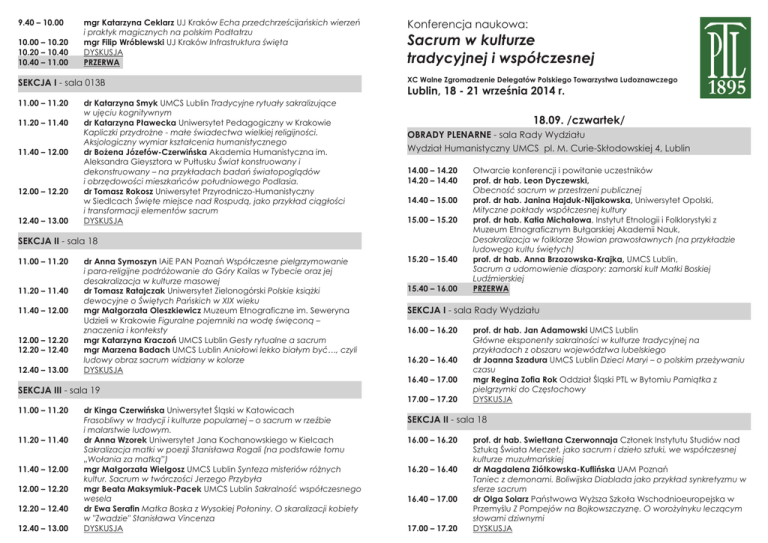 9.40 – 10.00 10.00 – 10.20 10.20 – 10.40 10.40 – 11.00 mgr Katarzyna Ceklarz UJ Kraków Echa przedchrześcijańskich wierzeń i praktyk magicznych na polskim Podtatrzu mgr Filip Wróblewski UJ Kraków Infrastruktura święta DYSKUSJA PRZERWA SEKCJA I - sala 013B 11.00 – 11.20 11.20 – 11.40 11.40 – 12.00 12.00 – 12.20 12.40 – 13.00 dr Katarzyna Smyk UMCS Lublin Tradycyjne rytuały sakralizujące w ujęciu kognitywnym dr Katarzyna Pławecka Uniwersytet Pedagogiczny w Krakowie Kapliczki przydrożne - małe świadectwa wielkiej religijności. Aksjologiczny wymiar kształcenia humanistycznego dr Bożena Józefów-Czerwińska Akademia Humanistyczna im. Aleksandra Gieysztora w Pułtusku Świat konstruowany i dekonstruowany – na przykładach badań światopoglądów i obrzędowości mieszkańców południowego Podlasia. dr Tomasz Rokosz Uniwersytet Przyrodniczo-Humanistyczny w Siedlcach Święte miejsce nad Rospudą, jako przykład ciągłości i transformacji elementów sacrum DYSKUSJA Konferencja naukowa: Sacrum w kulturze tradycyjnej i współczesnej XC Walne Zgromadzenie Delegatów Polskiego Towarzystwa Ludoznawczego Lublin, 18 - 21 września 2014 r. 18.09. /czwartek/ OBRADY PLENARNE - sala Rady Wydziału Wydział Humanistyczny UMCS pl. M. Curie-Skłodowskiej 4, Lublin 14.00 – 14.20 14.20 – 14.40 14.40 – 15.00 15.00 – 15.20 SEKCJA II - sala 18 11.00 – 11.20 11.20 – 11.40 11.40 – 12.00 12.00 – 12.20 12.20 – 12.40 12.40 – 13.00 dr Anna Symoszyn IAiE PAN Poznań Współczesne pielgrzymowanie i para-religijne podróżowanie do Góry Kailas w Tybecie oraz jej desakralizacja w kulturze masowej dr Tomasz Ratajczak Uniwersytet Zielonogórski Polskie książki dewocyjne o Świętych Pańskich w XIX wieku mgr Małgorzata Oleszkiewicz Muzeum Etnograficzne im. Seweryna Udzieli w Krakowie Figuralne pojemniki na wodę święconą – znaczenia i konteksty mgr Katarzyna Kraczoń UMCS Lublin Gesty rytualne a sacrum mgr Marzena Badach UMCS Lublin Aniołowi lekko białym być…, czyli ludowy obraz sacrum widziany w kolorze DYSKUSJA 15.20 – 15.40 15.40 – 16.00 SEKCJA I - sala Rady Wydziału 16.00 – 16.20 16.20 – 16.40 16.40 – 17.00 SEKCJA III - sala 19 17.00 – 17.20 11.00 – 11.20 11.20 – 11.40 11.40 – 12.00 12.00 – 12.20 12.20 – 12.40 12.40 – 13.00 dr Kinga Czerwińska Uniwersytet Śląski w Katowicach Frasobliwy w tradycji i kulturze popularnej – o sacrum w rzeźbie i malarstwie ludowym. dr Anna Wzorek Uniwersytet Jana Kochanowskiego w Kielcach Sakralizacja matki w poezji Stanisława Rogali (na podstawie tomu „Wołania za matką”) mgr Małgorzata Wielgosz UMCS Lublin Synteza misteriów różnych kultur. Sacrum w twórczości Jerzego Przybyła mgr Beata Maksymiuk-Pacek UMCS Lublin Sakralność współczesnego wesela dr Ewa Serafin Matka Boska z Wysokiej Połoniny. O skaralizacji kobiety w "Zwadzie" Stanisława Vincenza DYSKUSJA Otwarcie konferencji i powitanie uczestników prof. dr hab. Leon Dyczewski, Obecność sacrum w przestrzeni publicznej prof. dr hab. Janina Hajduk-Nijakowska, Uniwersytet Opolski, Mityczne pokłady współczesnej kultury prof. dr hab. Katia Michałowa, Instytut Etnologii i Folklorystyki z Muzeum Etnograficznym Bułgarskiej Akademii Nauk, Desakralizacja w folklorze Słowian prawosławnych (na przykładzie ludowego kultu świętych) prof. dr hab. Anna Brzozowska-Krajka, UMCS Lublin, Sacrum a udomowienie diaspory: zamorski kult Matki Boskiej Ludźmierskiej PRZERWA prof. dr hab. Jan Adamowski UMCS Lublin Główne eksponenty sakralności w kulturze tradycyjnej na przykładach z obszaru województwa lubelskiego dr Joanna Szadura UMCS Lublin Dzieci Maryi – o polskim przeżywaniu czasu mgr Regina Zofia Rok Oddział Śląski PTL w Bytomiu Pamiątka z pielgrzymki do Częstochowy DYSKUSJA SEKCJA II - sala 18 16.00 – 16.20 16.20 – 16.40 16.40 – 17.00 17.00 – 17.20 prof. dr hab. Swietłana Czerwonnaja Członek Instytutu Studiów nad Sztuką Świata Meczet, jako sacrum i dzieło sztuki, we współczesnej kulturze muzułmańskiej dr Magdalena Ziółkowska-Kuflińska UAM Poznań Taniec z demonami. Boliwijska Diablada jako przykład synkretyzmu w sferze sacrum dr Olga Solarz Państwowa Wyższa Szkoła Wschodnioeuropejska w Przemyślu Z Pompejów na Bojkowszczyznę. O worożylnyku leczącym słowami dziwnymi DYSKUSJA SEKCJA III - sala 19 16.00 – 16.20 16.20 – 16.40 16.40 – 17.00 17.00 – 17.20 dr hab. Piotr Grochowski UMK Toruń Sacrum a technologie cyfrowe. Przypadek fotografii cudownych dr Anna Weronika Brzezińska UAM w Poznaniu Desakralizacje miejskie pomiędzy zapomnieniem a komercjalizacją przestrzeni dr Adrian Mianecki UMK Toruń Przesąd i sacrum. Zaślubiny we współczesnym folklorze Polaków? DYSKUSJA 18.20 – 18.40 18.40 – 19.00 19.09. /piątek/ SEKCJA I - sala 013B 9.00 – 9.20 SEKCJA IV - sala 29B 9.20 – 9.40 16.00 – 16.20 16.20 – 16.40 16.40 – 17.00 17.00 – 17.20 17.20 – 17.40 dr Katarzyna Marcol Uniwersytet Śląski w Katowicach Sacrum jako wyznacznik tożsamości (rola księgi na Śląsku Cieszyńskim) prof. dr hab. Inna Szwed Uniwersytet w Brześciu Sacrum w kulturze tradycyjnej Białorusinów: noc dr Katarzyna Kość-Ryżko IAiE PAN Warszawa Śmierć zdesakralizowana. Obrazy umierania w narracjach zesłańczych DYSKUSJA PRZERWA mgr Joanna Paczos UMCS Lublin Nunc dimittis. Analiza ikonograficzno-ikonologiczna rzeźby ludowej z Muzeum Lubelskiego w Lublinie. DYSKUSJA 9.40 – 10.00 10.00 – 10.20 10.20 – 10.40 dr hab. Jan Kajfosz Uniwersytet Śląski w Katowicach Sacrum, magia i legitymizacja wykładni świata. O retorycznym wymiarze doznania świętości mgr Magdalena Wojtowicz UMCS Lublin Liczby a sacrum w folklorze polskim dr Małgorzata Michalska Uniwersytet Wrocławski Zmieniająca się rzeczywistość społeczno-polityczna a funkcjonowanie sanktuarium maryjnego we Frydku (obecnie Republika Czeska). mgr Piotr Kaszubowski Oddział Północno-Mazowiecki PTL w Ciechanowie Sanktua
