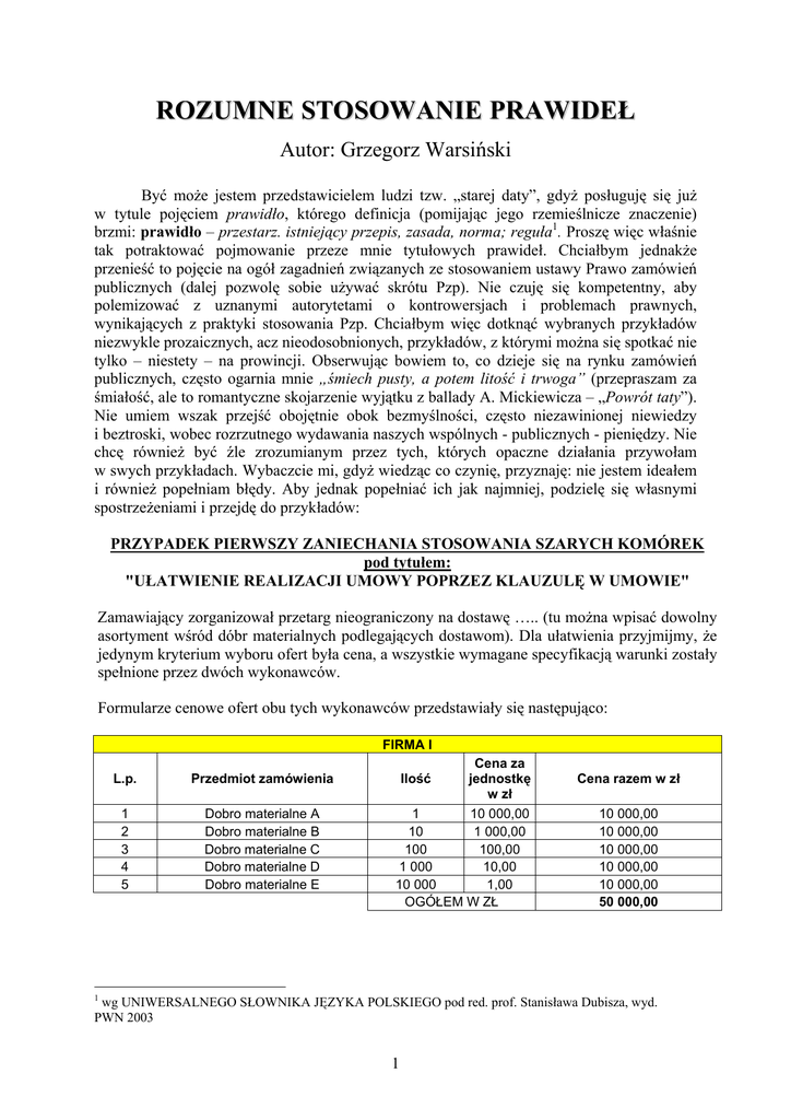 ROZUMNE STOSOWANIE PRAWIDEŁ Autor: Grzegorz Warsiński Być może jestem przedstawicielem ludzi tzw. „starej daty”, gdyż posługuję się już w tytule pojęciem prawidło, którego definicja (pomijając jego rzemieślnicze znaczenie) brzmi: prawidło – przestarz. istniejący przepis, zasada, norma; reguła1. Proszę więc właśnie tak potraktować pojmowanie przeze mnie tytułowych prawideł. Chciałbym jednakże przenieść to pojęcie na ogół zagadnień związanych ze stosowaniem ustawy Prawo zamówień publicznych (dalej pozwolę sobie używać skrótu Pzp). Nie czuję się kompetentny, aby polemizować z uznanymi autorytetami o kontrowersjach i problemach prawnych, wynikających z praktyki stosowania Pzp. Chciałbym więc dotknąć wybranych przykładów niezwykle prozaicznych, acz nieodosobnionych, przykładów, z którymi można się spotkać nie tylko – niestety – na prowincji. Obserwując bowiem to, co dzieje się na rynku zamówień publicznych, często ogarnia mnie „śmiech pusty, a potem litość i trwoga” (przepraszam za śmiałość, ale to romantyczne skojarzenie wyjątku z ballady A. Mickiewicza – „Powrót taty”). Nie umiem wszak przejść obojętnie obok bezmyślności, często niezawinionej niewiedzy i beztroski, wobec rozrzutnego wydawania naszych wspólnych - publicznych - pieniędzy. Nie chcę również być źle zrozumianym przez tych, których opaczne działania przywołam w swych przykładach. Wybaczcie mi, gdyż wiedząc co czynię, przyznaję: nie jestem ideałem i również popełniam błędy. Aby jednak popełniać ich jak najmniej, podzielę się własnymi spostrzeżeniami i przejdę do przykładów: PRZYPADEK PIERWSZY ZANIECHANIA STOSOWANIA SZARYCH KOMÓREK pod tytułem: "UŁATWIENIE REALIZACJI UMOWY POPRZEZ KLAUZULĘ W UMOWIE" Zamawiający zorganizował przetarg nieograniczony na dostawę ….. (tu można wpisać dowolny asortyment wśród dóbr materialnych podlegających dostawom). Dla ułatwienia przyjmijmy, że jedynym kryterium wyboru ofert była cena, a wszystkie wymagane specyfikacją warunki zostały spełnione przez dwóch wykonawców. Formularze cenowe ofert obu tych wykonawców przedstawiały się następująco: FIRMA I L.p. Przedmiot zamówienia 1 2 3 4 5 Dobro materialne A Dobro materialne B Dobro materialne C Dobro materialne D Dobro materialne E Ilość Cena za jednostkę w zł 1 10 000,00 10 1 000,00 100 100,00 1 000 10,00 10 000 1,00 OGÓŁEM W ZŁ 1 Cena razem w zł 10 000,00 10 000,00 10 000,00 10 000,00 10 000,00 50 000,00 wg UNIWERSALNEGO SŁOWNIKA JĘZYKA POLSKIEGO pod red. prof. Stanisława Dubisza, wyd. PWN 2003 1 FIRMA II L.p. Przedmiot zamówienia 1 2 3 4 5 Dobro materialne A Dobro materialne B Dobro materialne C Dobro materialne D Dobro materialne E Ilość Cena za jednostkę w zł 1 9 000,00 10 1 000,00 100 100,00 1 000 10,00 10 000 2,00 OGÓŁEM Cena razem 9 000,00 10 000,00 10 000,00 10 000,00 20 000,00 59 000,00 Wobec takiego dictum wygrała „FIRMA I” z ceną 50 000,00 zł. Dla jasności sprawy trzeba dodać, że zamawiający do wzoru umowy wstawił klauzulę: "zastrzega się możliwość zmiany ilości nabywanych dóbr materialnych w poszczególnych asortymentach, zachowując ich ceny jednostkowe i nie przekraczając ogólnej wartości umowy". Na pierwszy rzut oka całkiem zwyczajny i nieszkodliwy zapis. Proszę jednak zauważyć, co nastąpiło dalej. Realizacja umowy w oparciu o wynik przetargu miała się do rzeczywistości na podstawie analizowanego przykładu jak następuje: FIRMA I L.p. Przedmiot zamówienia 1 2 3 4 5 Dobro materialne A Dobro materialne B Dobro materialne C Dobro materialne D Dobro materialne E Cena za Ilości jednostkę wykorzystane w zł 4,00 10 000,00 1,00 1 000,00 40,00 100,00 400,00 10,00 1 000,00 1,00 OGÓŁEM Cena razem 40 000,00 1 000,00 4 000,00 4 000,00 1 000,00 50 000,00 I umowa wyczerpała się ze względu na osiągnięcie granicznej swej wartości. A gdyby tak wstawić te " ilości wykorzystane " do formularza ofertowego „FIRMY II”? FIRMA II L.p. Przedmiot zamówienia 1 2 3 4 5 Dobro materialne A Dobro materialne B Dobro materialne C Dobro materialne D Dobro materialne E Cena za Ilości jednostkę wykorzystane w zł 4,00 9 000,00 1,00 1 000,00 40,00 100,00 400,00 10,00 1 000,00 2,00 OGÓŁEM Cena razem 36 000,00 1 000,00 4 000,00 4 000,00 2 000,00 47 000,00 No cóż… Widać wyraźnie, że zamawiający nie wybrał najkorzystniejszej oferty przy zastosowaniu „ilości wykorzystanych”. A szkoda, bo rzeczywistość pokazuje, że przegrywająca oferta przy takiej realizacji umowy byłaby tańsza i co może się stać jak „namierzy to” kontrola zewnętrzna, udowadniając zamawiającemu marnowanie publicznych pieniędzy? 2 PRZYPADEK DRUGI ZANIECHANIA STOSOWANIA SZARYCH KOMÓREK pod tytułem: "UŁATWIENIE REALIZACJI ZADANIA POPRZEZ ZASTOSOWANIE WYŁĄCZNIE CEN JEDNOSTKOWYCH W FORMULARZU CENOWYM OFERTY" Zamawiający zorganizował przetarg nieograniczony na usługi pralnicze (mogłyby to być również inne usługi typu sprzątanie różnorodnych powierzchni czy przygotowanie zróżnicowanego kalorycznie asortymentu posiłków itd. itp.). Formularz cenowy oferty przedstawiał się następująco: L.p. Asortyment do prania 1 2 3 4 5 Koc Powłoka Powłoczka Prześcieradło Podkład OGÓŁEM CENA W ZŁ Cena za jednostkę w zł I do tak „spreparowanego” formularza złożone zostały dwie oferty: FIRMA I L.p. 1 2 3 4 5 Asortyment do prania Koc Powłoka Prześcieradło Podkład Powłoczka OGÓŁEM CENA W ZŁ L.p. 1 2 3 4 5 Asortyment do prania Koc Powłoka Prześcieradło Podkład Powłoczka OGÓŁEM CENA W ZŁ Cena za jednostkę w zł 5,00 4,00 3,00 2,00 1,00 15,00 FIRMA II Cena za jednostkę w zł 0,50 5,00 4,50 3,50 1,00 14,50 Jak widać wygrała „FIRMA II”. Zamawiający nie ustalił precyzyjnie kwoty, którą ma na realizację przedmiotu zamówienia, bo któryś z jego pracowników „p o m y ś l a ł”: „nie da się tego precyzyjnie ustalić, a 50 0