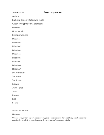 Jasełka 2007 „Święci przy Ŝłóbku” Autorzy: Barbara Grajcar i Katarzyna Matla Osoby występujące w jasełkach: Narrator Nauczycielka Ksiądz proboszcz Dziecko 1 Dziecko 2 Dziecko 3 Dziecko 4 Dziecko 5 Dziecko 6 Dziecko 7 Dziecko 8 Dziecko 9 Św. Franciszek Św. Kamil Św. Jacek Maryja Jezus - głos Józef Pasterz Król Scena I Wchodzi narrator. Narrator Witam wszystkich zgromadzonych gości i zapraszam do wspólnego zobaczenia i przeŜycia jasełek przygotowanych przez uczniów naszej szkoły. Słychać głos Jezusa. Podkład muzyczny. Jezus Narodziłem się nagi, abyś ty potrafił wyrzekać się samego siebie. Narodziłem się ubogi, abyś ty mógł uznać mnie za jedyne bogactwo. Narodziłem się w stajni, abyś ty nauczył się uświęcać kaŜde miejsce. Narodziłem się bezsilny, abyś ty nigdy mnie się nie lękał. Narodziłem się z miłości, abyś ty nigdy nie zwątpił w moją miłość. Narodziłem się w ludzkiej postaci, abyś ty nigdy nie wstydził się być sobą. Narodziłem się prześladowany od początku, abyś ty nauczył się przyjmować wszelkie trudności. Narodziłem się w prostocie, abyś ty nie był wewnętrznie zagmatwany. Narodziłem się w twoim ludzkim Ŝyciu, aby wszystkich ludzi zaprowadzić do domu Ojca. Wnętrze kościoła św. Franciszka. Do kościoła wchodzi klasa z nauczycielką, siadają w ławkach i śpiewają kolędę “PrzybieŜeli do Betlejem”. wychodzi ksiądz proboszcz. Ksiądz Szczęść BoŜe kochane dzieci. Dzieci (razem) Szczęść BoŜe. Ksiądz Witam Was serdecznie w naszym kościele. Skąd przybyliście i co Was tu sprowadza? Dziecko 1 Jesteśmy ze Szkoły Podstawowej numer 18, z klasy 5. Wstaje dziecko 2. Dziecko 2 Przyszliśmy zobaczyć stajenkę, pomodlić się i pośpiewać kolędy. Ksiądz Bardzo się cieszę. Czy pozwolicie, Ŝe się do Was przyłączę? Dziecko 2 Oczywiście!!! Zapraszamy księdza do nas. Ksiądz wraca do zakrystii i po chwili wychodzi z akordeonem i zaczyna grać kolędę. “Dzisiaj w Betlejem” Nauczycielka W tym roku zauwaŜyliśmy, Ŝe nasza stajenka trochę się zmieniła, pojawiły się 3 nowe postacie. Chcielibyśmy się od księdza dowiedzieć dlaczego? Ksiądz Z miłą chęcią powiem Wam dlaczego w tym roku wzbogaciliśmy stajenkę dodając te postacie świętych. Ale najpierw Was o coś zapytam. MoŜe ktoś wie, kim są ci święci? Zgłasza się dziecko 3. Ksiądz wskazuje dziecko, które ma odpowiedzieć. Dziecko 3 Pierwszą postacią jest św. Franciszek z AsyŜu, patron naszej parafii. Ksiądz Skąd wiesz, Ŝe to św. Franciszek? Dziecko 3 Pani na lekcji religii powiedziała nam, Ŝe kaŜdego świętego moŜna rozpoznać po stroju, po przedmiotach, z którymi jest przedstawiony. Św. Franciszek ma brązowy habit i są obok niego zwierzęta, które bardzo kochał. Ksiądz Świetnie. A kto powie kim jest drugi święty? Zgłasza się dziecko 4. Ksiądz wskazuje kolejne dziecko. Dziecko 4 Kolejna postać to św. Kamil, którego, moŜna poznać po czerwonym krzyŜu na habicie, w ręce trzyma księgę i róŜaniec. Ksiądz Zgadza się. I pozostał nam ostatni święty. Zgłasza się dziecko 5. Dziecko 5 Ostatnim świętym jest Jacek, który trzyma monstrancję i figurę Matki BoŜej z Dzieciątkiem. Ksiądz Wszyscy bardzo dobrze rozpoznaliście świętych z naszej stajenki. Umieściliśmy ich w tym roku, ze względu na to, Ŝeby przybliŜyć świętych związanych z naszą parafią, naszym miastem i regionem. Ksiądz podchodzi do obrazu przedstawiającego św. Franciszka, wskazuje na niego ręką i mówi przerywając w pół zdania. Ksiądz jest zdziwiony. Św. Franciszek urodził się w … W tym samym czasie wychodzi z ramy św. Franciszek i robi mały ukłon w kierunku zgromadzonych w kościele i mówi. Św. Franciszek To moŜe sam powiem coś o sobie. Przyszedłem na świat w XII wieku we włoskim mieście AsyŜ. Moi rodzice Joanna Pika i Piotr Bernardone mieli sklep ze suknem, i naleŜeli do zamoŜniejszych obywateli miasta. Moja mama ochrzciła mnie, nadając imię Jan Chrzciciel. Jednak ze względu, Ŝe pochodziła z francuskiej prowincji, Prowansji otrzymałem przydomek Franciszek. Jako chłopiec chciałem zostać rycerzem, mieć swój miecz, tarczę i walczyć. Jednak Pan Bóg miał wobec mnie inny plan, chciał, Ŝebym został Jego rycerzem i walczył w obronie biednych, posługując się słowem BoŜym, dobrym czynem, a nie mieczem. Na pewno nie wiecie, Ŝe to ja kazałem zbudować pierwszą stajenkę, umieszczając w niej obok ludzi Ŝywe zwierzątka, które są naszymi braćmi. Chciałem w ten sposób uczcić pamięć o Dzieciątku i pokazać Jego niewygody i wyrzeczenia jakie musiało znosić złoŜone w Ŝłobie, leŜąc w sianie w obecności wołu i osła. Dałem początek wszystkim późniejszym szopkom, stajenkom, a takŜe jasełkom, przedstawiającym narodziny Dzieciątka Jezus. Zwyczaj ten dotarł do Polski juŜ w roku 1236, kiedy do Opola przybyli pierwsi franciszkanie. Dziś trudno byłoby znaleźć kościół, w którym w czasie świąt BoŜego Narodzenia nie ma betlejemskiej stajenki. Cieszę się, Ŝe w tym roku znalazło się dla mnie miejsce w stajence. Św. Franciszek wraca do ramy obrazu i stoi nieruchomo. Zgłasza się dziecko 6. Dziecko 6 Proszę pani, a my znamy piosenkę o wołku i osiołku. Nauczycielka To zaśpiewajmy ją wspólnie. Dzieci śpiewają piosenkę “Wołek i osiołek”. Scena 2 Ksiądz proboszcz podchodzi do kolejnego obrazu, na którym jest postać św. Kamila, wskazuje na niego i zaczyna opowiadać. Ksiądz Na drugim obrazie rozpoznaliście św. Kamila. Jest on w naszej stajence, gdyŜ jest związany z Zabrzem. W 1996 roku został wybrany patronem naszego miasta, w zeszłym roku obchodziliśmy dziesięciolecie tego wydarzenia. MoŜe pamiętacie najwaŜniejsze wydarzenie z tych obchodów Zgłasza się dziecko 7. Dziecko 7 Oczywiście!! Pamiętam. W tamtym roku we wrześniu do naszego miasta przywieziono relikwie serca św. Kamila. Pani