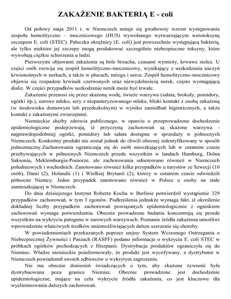 ZAKAŻENIE BAKTERIĄ E - coli Od połowy maja 2011 r. w Niemczech notuje się gwałtowny wzrost występowania zespołu hemolityczno – mocznicowego (HUS) wywołanego wytwarzającym werotoksynę szczepem E. coli (STEC). Pałeczka okrężnicy (E. coli) jest powszechnie występującą bakterią, ale tylko niektóre jej szczepy mogą produkować szczególnie niebezpieczne toksyny, które wywołują ciężkie schorzenia u ludzi. Pierwszymi objawami zakażenia są bóle brzucha, czasami wymioty, krwawe stolce. U części osób rozwija się zespół hemolityczno-mocznicowy, wynikający z uszkodzenia naczyń krwionośnych w nerkach, a także w płucach, mózgu i sercu. Zespół hemolityczno-mocznicowy objawia się rozpadem krwinek czerwonych oraz niewydolnością nerek, często wymagającą dializ. W części przypadków uszkodzenie nerek może być trwałe. Zakażenie przenosi się przez skażoną wodę, świeże warzywa (sałata, brokuły, pomidory, ogórki itp.), surowe mleko, sery z niepasteryzowanego mleka, bliski kontakt z osobą zakażoną (w środowisku domowym lub przedszkolnym) w wyniku zaniedbań higienicznych, a także kontakt z zakażonymi zwierzętami. Niemieckie służby zdrowia publicznego, w oparciu o przeprowadzone dochodzenie epidemiologiczne podejrzewają, iż przyczyną zachorowań są skażone warzywa najprawdopodobniej ogórki, pomidory lub sałata dostępne w sprzedaży w północnych Niemczech. Konkretny produkt nie został jednak do chwili obecnej zidentyfikowany w sposób jednoznaczny.Zachorowania ograniczają się do osób mieszkających lub w ostatnim czasie przebywających w północnych Niemczech przede wszystkim w landach Hamburg, Dolna Saksonia, Meklemburgia-Pomorze, ale zachorowania odnotowano również w Niemczech południowych i wschodnich. Zanotowano również kilka przypadków u turystów ze Szwecji (10 osób), Danii (2), Holandii (1) i Wielkiej Brytanii (2), którzy w ostatnim czasie odwiedzili północne Niemcy. Jeden przypadek zanotowano również w Polsce u osoby na stałe zamieszkującej w Niemczech. Do dnia dzisiejszego Instytut Roberta Kocha w Berlinie potwierdził wystąpienie 329 przypadków zachorowań, w tym 3 zgonów. Podkreślenia jednakże wymaga fakt, iż określenie dokładnej liczby przypadków zachorowań powiązanych epidemiologicznie z ogniskiem zachorowań wymaga potwierdzenia. Obecnie prowadzone badania koncentrują się przede wszystkim na wykryciu patogenu w surowych warzywach. Poznanie źródła zakażenia umożliwi wprowadzenie właściwych środków uniemożliwiających dalsze szerzenie się choroby. W powiadomieniach przekazanych poprzez unijny System Wczesnego Ostrzegania o Niebezpiecznej Żywności i Paszach (RASFF) podano informacje o wykryciu E. coli STEC w próbkach ogórków pochodzących z Hiszpanii. Dystrybucja produktów ograniczyła się do Niemiec. Władze niemieckie poinformowały, że produkt jest wycofywany, a dystrybutor w Niemczech powiadomił swoich odbiorców o wykrytym zagrożeniu. Nie ma obecnie doniesień świadczących o tym, aby skażona żywność była dystrybuowana poza granice Niemiec. Obecnie prowadzone jest dochodzenie epidemiologiczne, mające na celu wykrycie źródła zakażenia, co jest kluczowe dla wyeliminowania dalszych zachorowań. Do zakończenia prowadzonego w Niemczech dochodzenia epidemiologicznego, które pozwoli na ostateczne ustalenie skażonego produktu i całkowite wycofanie go z rynku, osobom odwiedzającym Niemcy zaleca się unikanie spożywania warzyw (ogórków, pomidorów i sałaty). Obecnie na terenie Polski nie zanotowano zachorowań wywołanych werocytotoksycznym szczepem E. coli, które wskazywałyby na obecność skażonych partii hiszpańskich ogórków importowanych poprzez Niemcy na terenie naszego kraju, zaleca się jednak szczególną ostrożność w szczególności w spożywaniu warzyw importowanych z obszarów dotkniętych zachorowaniami lub z krajów wskazywanych jako możliwe źródło zakażenia.Główny Inspektor Sanitarny przypomina o konieczności zachowania zasad higieny podczas przygotowywania i spożywania żywności, w szczególności świeżych owoców i warzyw, które będą spożywane na surowo. Przed poddaniem ich myciu powinny być namoczone, a następnie każda ich część powinna być dokładnie i wielokrotnego umyta. Szczegółowe informacje dotyczące zasad postępowania z żywnością wskazuje wydana przez Światową Organizację Zdrowia (WHO) ulotka informacyjna „Pięć kroków do bezpieczniejszej żywności” zamieszczona na stronie internetowej GIS oraz WHO.Ponadto, biorąc pod uwagę możliwość przeniesienia się zakażenia człowiek-człowiek drogą pokarmową, zwłaszcza między osobami mającymi ze sobą bliski kontakt, szczególnie w środowisku domowym, istotne jest również zachowanie zasad higieny osobistej.