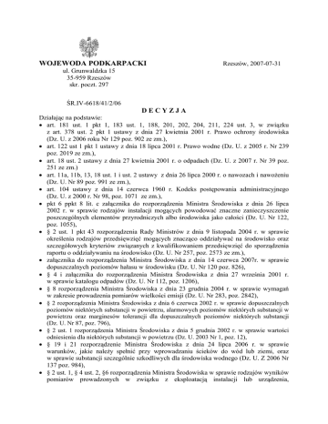 WOJEWODA PODKARPACKI Rzeszów, 2007-07-31 ul. Grunwaldzka 15 35-959 Rzeszów skr. poczt. 297 ŚR.IV-6618/41/2/06 DECYZJA Działając na podstawie: • art. 181 ust. 1 pkt 1, 183 ust. 1, 188, 201, 202, 204, 211, 224 ust. 3, w związku z art. 378 ust. 2 pkt 1 ustawy z dnia 27 kwietnia 2001 r. Prawo ochrony środowiska (Dz. U. z 2006 roku Nr 129 poz. 902 ze zm.), • art. 122 ust 1 pkt 1 ustawy z dnia 18 lipca 2001 r. Prawo wodne (Dz. U. z 2005 r. Nr 239 poz. 2019 ze zm.), • art. 18 ust. 2 ustawy z dnia 27 kwietnia 2001 r. o odpadach (Dz. U. z 2007 r. Nr 39 poz. 251 ze zm.) • art. 11a, 11b, 13, 18 ust. 1 i ust. 2 ustawy z dnia 26 lipca 2000 r. o nawozach i nawożeniu (Dz. U. Nr 89 poz. 991 ze zm.), • art. 104 ustawy z dnia 14 czerwca 1960 r. Kodeks postępowania administracyjnego (Dz. U. z 2000 r. Nr 98, poz. 1071 ze zm.), • pkt 6 ppkt 8 lit. c załącznika do rozporządzenia Ministra Środowiska z dnia 26 lipca 2002 r. w sprawie rodzajów instalacji mogących powodować znaczne zanieczyszczenie poszczególnych elementów przyrodniczych albo środowiska jako całości (Dz. U. Nr 122, poz. 1055), • § 2 ust. 1 pkt 43 rozporządzenia Rady Ministrów z dnia 9 listopada 2004 r. w sprawie określenia rodzajów przedsięwzięć mogących znacząco oddziaływać na środowisko oraz szczegółowych kryteriów związanych z kwalifikowaniem przedsięwzięć do sporządzenia raportu o oddziaływaniu na środowisko (Dz. U. Nr 257, poz. 2573 ze zm.), • załącznika do rozporządzenia Ministra Środowiska z dnia 14 czerwca 2007r. w sprawie dopuszczalnych poziomów hałasu w środowisku (Dz. U. Nr 120 poz. 826), • § 4 i załącznika do rozporządzenia Ministra Środowiska z dnia 27 września 2001 r. w sprawie katalogu odpadów (Dz. U. Nr 112, poz. 1206), • § 8 rozporządzenia Ministra Środowiska z dnia 23 grudnia 2004 r. w sprawie wymagań w zakresie prowadzenia pomiarów wielkości emisji (Dz. U. Nr 283, poz. 2842), • § 2 rozporządzenia Ministra Środowiska z dnia 6 czerwca 2002 r. w sprawie dopuszczalnych poziomów niektórych substancji w powietrzu, alarmowych poziomów niektórych substancji w powietrzu oraz marginesów tolerancji dla dopuszczalnych poziomów niektórych substancji (Dz. U. Nr 87, poz. 796), • § 2 ust. 1 rozporządzenia Ministra Środowiska z dnia 5 grudnia 2002 r. w sprawie wartości odniesienia dla niektórych substancji w powietrzu (Dz. U. 2003 Nr 1, poz. 12), • § 19 i 21 rozporządzenie Ministra Środowiska z dnia 24 lipca 2006 r. w sprawie warunków, jakie należy spełnić przy wprowadzaniu ścieków do wód lub ziemi, oraz w sprawie substancji szczególnie szkodliwych dla środowiska wodnego (Dz. U. Z 2006 Nr 137 poz. 984), • § 2 ust. 1, § 4 ust. 2, §6 rozporządzenia Ministra Środowiska w sprawie rodzajów wyników pomiarów prowadzonych w związku z eksploatacją instalacji lub urządzenia, przekazywanych właściwym organom ochrony środowiska oraz terminów i sposobów ich prezentacji (Nr 59 poz. 529) • § 3 - § 8, §13 ust. 2, §14, § 25 - §33 rozporządzenia Ministra Rolnictwa i Rozwoju Wsi z dnia 2 września 2003r. w sprawie minimalnych warunków utrzymywania poszczególnych gatunków zwierząt gospodarskich (Dz. U. Nr 167 poz. 1629 ze zm.). po rozpatrzeniu wniosku A.P.S. Sp. z o.o., ul. Wiejska 8, 27-400 Ostrowiec Świętokrzyski, regon 260013509 przesłanego wraz z pismem z dnia 22.11.2006r., w sprawie wydania pozwolenia zintegrowanego dla instalacji do chowu i hodowli świń na więcej niż 750 stanowiskach dla macior w Fermie Trzody Chlewnej w miejscowości Kuryłówka, 37-303 Kuryłówka, pow. leżajski orzekam Udzielam dla A.P.S. Sp. z o.o., ul. Wiejska 8, 27-400 Ostrowiec Świętokrzyski, regon 260013509 pozwolenia zintegrowanego na prowadzenie instalacji do chowu świń na 2422 stanowiskach dla macior w Fermie Trzody Chlewnej w miejscowości Kuryłówka, 37-303 Kuryłówka, pow. leżajski, zwanej dalej instalacją, i określam: I. Rodzaj i parametry instalacji oraz rodzaj prowadzonej działalności I.1. Rodzaj instalacji Instalacja do chowu i hodowli świń na więcej niż 750 stanowiskach dla macior. I.2. Parametry urządzeń i instalacji istotne z punktu widzenia przeciwdziałania zanieczyszczeniom: I.2.1. W skład instalacji wchodzić będzie: I.2.1.1. Siedem budynków inwentarskich wraz z urządzeniami towarzyszącymi, w których prowadzony będzie chów trzody chlewnej, dostosowanych do poszczególnych etapów produkcji, od momentu inseminacji loch do finalnego odchowu prosiąt. Poszczególne budynki inwentarskie połączone będą ze sobą zadaszonymi korytarzami komunikacyjnymi dla pracowników oraz dla zwierząt. Wszystkie budynki przystosowane będą do bezściołowego chowu zwierząt i wyposażone w system pojenia, system wentylacji mechanicznej i sterowania temperaturą oraz oświetlenie i nagrzewnice gazowe. Ściany budynków wykonane będą z płyty warstwowej (beton-styropian-beton) a całość przykryta dachem dwuspadowym z paneli warstwowych. a/ Budynek nr 101 (sektor inseminacji) i budynek nr 301 (sektor porodowy) Budynek o wymiarach: dł. ok 94,00 m, szer. 16,20 m, wys. przy ścianie 2,70 m, wys. w szczycie 5,30 m i powierzchni ogólnej 237,69 m2. Budynek podzielony będzie na dwa sektory: inseminacji i porodowy. W budynku znajdować się będą kojce pojedyncze służące do inseminacji oraz kojce zbiorowe i porodowe. W sektorze inseminacji w budynku nr 101 podłoga wykonana będzie z rusztów betonowych, pod którymi znajdować się będą cztery kanały gnojowe z żelbetonu, uszczelnione izobetem, o wys. 1,0 m, szerokości 285,0 cm. Na dachu usytuowane będą dwa wentylatory dachowe o wydajności 12500 m3/h każdy. Budynek ogrzewany będzie dwoma nagrzewnicami na gaz ziemny, o mocy 33 kW każda. ŚR.IV-6618/41/2/06 Strona 2 z 48 W sektorze porodowym w budynku nr 301 podłoga wykonana będzie z rusztu z tworzywa sztucznego na całości budynku, pod którym znajdować się będzie sześć kanałów gnojowy