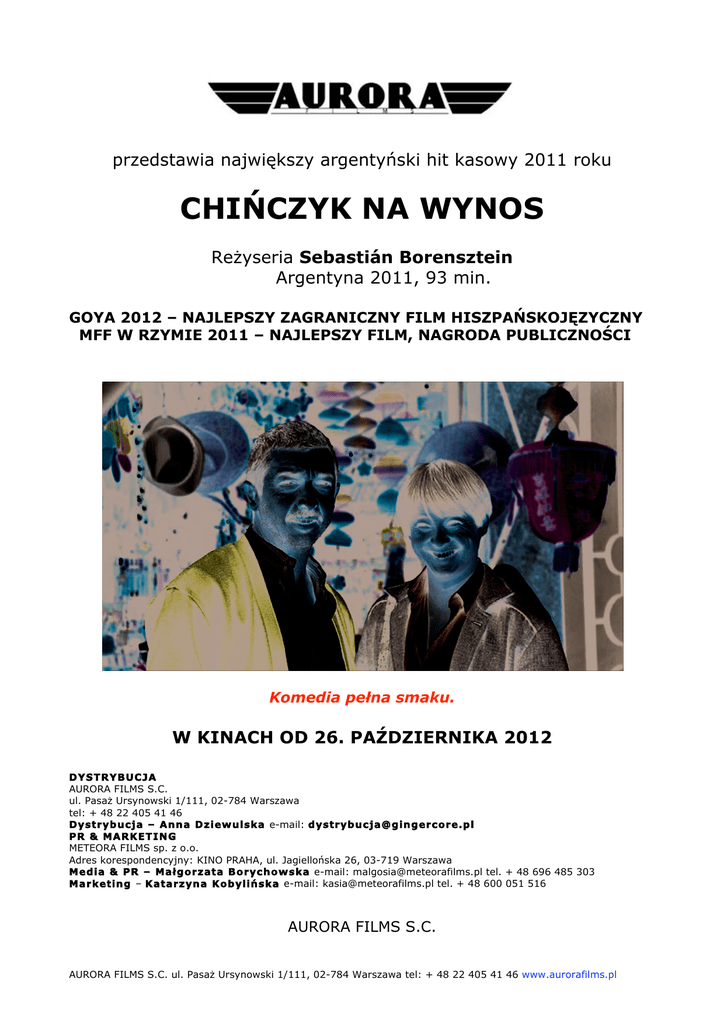 przedstawia największy argentyński hit kasowy 2011 roku CHIŃCZYK NA WYNOS Reżyseria Sebastián Borensztein Argentyna 2011, 93 min. GOYA 2012 – NAJLEPSZY ZAGRANICZNY FILM HISZPAŃSKOJĘZYCZNY MFF W RZYMIE 2011 – NAJLEPSZY FILM, NAGRODA PUBLICZNOŚCI Komedia pełna smaku. W KINACH OD 26. PAŹDZIERNIKA 2012 DYSTRYBUCJA AURORA FILMS S.C. ul. Pasaż Ursynowski 1/111, 02-784 Warszawa tel: + 48 22 405 41 46 Dystrybucja – Anna Dziewulska e-mail: [email protected] PR & MARKETING METEORA FILMS sp. z o.o. Adres korespondencyjny: KINO PRAHA, ul. Jagiellońska 26, 03-719 Warszawa Media & PR – Małgorzata Borychowska e-mail: [email protected] tel. + 48 696 485 303 Marketing – Katarzyna Kobylińska e-mail: [email protected] tel. + 48 600 051 516 AURORA FILMS S.C. AURORA FILMS S.C. ul. Pasaż Ursynowski 1/111, 02-784 Warszawa tel: + 48 22 405 41 46 www.aurorafilms.pl przedstawia produkcję Pampa Films, Tornasol Films i Telefé we współpracy z Castafiore Films, Aliwood Mediterraneo Producciones, Royal Cinema Group, Gloriamundi i Cooperativa de trabajo 2001 Chińczyk na wynos Tytuł oryginalny: Un cuento chino Tytuł angielski: Chinese take-away Twórcy filmu: Reżyseria Sebastián Borensztein Scenariusz Sebastián Borensztein Produkcja Pablo Bossi, Juan Pablo Buscarini, Gerardo Herrero, Mariela Besuievsky, Isabel García Peralta, Benjamín Odell i Axel Kuschevatzky Kierownik produkcji Josean Gómez / Marcelo LaTorre Zdjęcia Rodrigo Pulpeiro Montaż Fernando Pardo Muzyka Lucio Godoy Scenografia Laura Musso, Valeria Ambrossio Dźwięk Eduardo Esquide Montaż dźwięku Charly Schmukler Makijaż Antonia Perez / Lucila Robirosa Kostiumy Cristina Menella Fryzjer Araceli Farase / Kenyar Padilla Efekty specjalne Alejandro Valente, Juan Elías Asystent reżysera Alejandra Uz Występują: Ricardo Darín Roberto Huang Sheng Huang Jun Quian Muriel Santa Ana Mari Enric Rodriguez młody Roberto Ivan Romanelli Leonel AURORA FILMS S.C. ul. Pasaż Ursynowski 1/111, 02-784 Warszawa tel: + 48 22 405 41 46 www.aurorafilms.pl Nagrody / festiwale: 2012 – 32. MFF Fantasporto, sekcja Tydzień Reżyserów – nagroda dla najlepszego reżysera (Sebastian Borensztein) 2012 – Nagrody Argentyńskiej Akademii Filmowej: najlepszy film, najlepszy aktor (Ricardo Darin) i najlepsza aktorka drugoplanowa (Muriel Santa Ana) 2012 – Goya – Nagroda Hiszpańskiej Akademii Filmowej: najlepszy film iberoamerykański 2011 – 33. MFF Nowe Kino Ameryki Łacińskiej w Hawanie – specjalne wyróżnienie jury 2011 – 60. FF w Mannheimie-Heidelbergu – Nagroda Publiczności, Nagroda Rainera Wernera Fassbindera oraz wyróżnienie Jury Ekumenicznego 2011 – MFF w Rzymie: Nagroda Marka Aureliusza: najlepszy film, Nagroda Publiczności Skrócony opis filmu: W romantycznej scenerii, w ślicznie udekorowanej łodzi, nad pięknym jeziorem przystojny młody człowiek chce się oświadczyć ukochanej. Nagle dzieje się coś dziwnego - z nieba spada… krowa, wprost na zakochaną parę. Mrukliwy Roberto prowadzi w Buenos Aires sklep żelazny. Z pogardą patrzy na klientów i wykłóca się z producentami gwoździ o swoje zamówienia. Jego życie jest spokojne i uporządkowane. Tylko pozornie. Roberto pasjami przeczesuje prasę codzienną w poszukiwaniu pikantnych, pełnych absurdu, ociekających krwią wiadomości o wydarzeniach, które przytrafiły się ludziom na całym świecie. Najciekawsze wkleja do albumów z wycinkami, które zapełniają jego mieszkanie. Z kolei Chińczyk Jun przyjechał do Buenos Aires, aby odszukać stryja. Nie zna słowa po hiszpańsku, nikt nie jest w stanie go zrozumieć, jedyne, co ma, to adres wytatuowany na przedramieniu. W jaki sposób los połączy obu mężczyzn i co wspólnego z nimi ma krowa z początku opowieści, można się przekonać, oglądając tę ciepłą, zabawną, a przede wszystkim pełną smaku komedię, która podbiła serca publiczności i krytyków. Reżyser Sebastián Borensztein o filmie: Temat O czym opowiada ten film? W jednym zdaniu można go streścić jako „opowieść o Argentyńczyku i Chińczyku, których połączyła krowa spadająca z nieba". Możemy go również czytać jako komiczną kronikę spotkania dwóch mężczyzn, których tragedie krzyżują się AURORA FILMS S.C. ul. Pasaż Ursynowski 1/111, 02-784 Warszawa tel: + 48 22 405 41 46 www.aurorafilms.pl w Buenos Aires. To przecięcie jest kluczem, które rozwiązuje ich życiowe problemy i pomaga im spojrzeć na życie inaczej. „Chińczyk na wynos” to uniwersalna i zrozumiała dla wszystkich historia, ponieważ opowiada o rzeczach takich, jak samotność, strach i ból duszy. To są tematy, które dotyczą każdego i w każdym czasie. Ale jest to także historia bardzo argentyńska, ponieważ w jej tle pojawia się wojna o Falklandy. Roberto Roberto tkwi w przeszłości i ma obsesję zbierania dziwacznych informacji z gazet, takich jak niezwykła historia o krowie, która spadła z samolotu na człowieka wyznającego miłość swojej dziewczynie. Rola Roberta była pisana z myślą o Ricardo Darinie. Oczywiście to, że Ricardo zgodził się ją zagrać, pomogło filmowi. Prawda i fikcja Wszystko, co umieściłem w filmie, to prawda. Wszystkie informacje można sprawdzić w Google’u: spadającą z nieba krowę, wojnę o Falklandy oraz jej konsekwencje dla tych, którzy w niej walczyli. Kadr z filmu „Chińczyk na wynos” Prasa o filmie: Subtelna komedia o mruku, Chińczyku i krowach, które spadają z nieba… „Chińczyk na wynos" jest bardzo smacznym daniem (…). Jego ciepło i otucha bijące z końcowych scen oraz AURORA FILMS S.C. ul. Pasaż Ursynowski 1/111, 02-784 Warszawa tel: + 48 22 405 41 46 www.aurorafilms.pl świetna gra niezawodnego Ricardo Darina („Sekret jej oczu") są wystarczającym powodem, aby tego „Chińczyka na wynos" wziąć ze sobą do domu. Jonathan Holland, „Variety” „Chińczyk na wynos” daje prawdziwą frajdę z oglądania! Jego genialne ciepło i cierpki humor idea