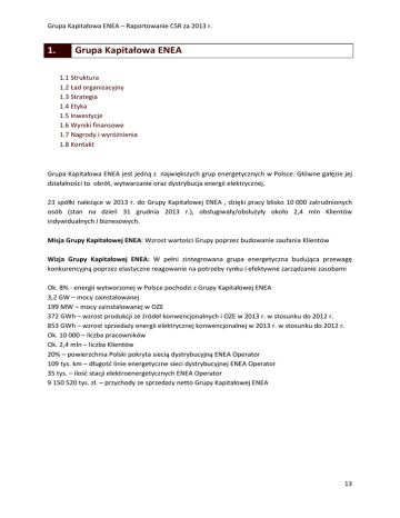 Grupa Kapitałowa ENEA – Raportowanie CSR za 2013 r. 1. Grupa Kapitałowa ENEA 1.1 Struktura 1.2 Ład organizacyjny 1.3 Strategia 1.4 Etyka 1.5 Inwestycje 1.6 Wyniki finansowe 1.7 Nagrody i wyróżnienia 1.8 Kontakt Grupa Kapitałowa ENEA jest jedną z największych grup energetycznych w Polsce. Główne gałęzie jej działalności to obrót, wytwarzanie oraz dystrybucja energii elektrycznej. 23 spółki należące w 2013 r. do Grupy Kapitałowej ENEA , dzięki pracy blisko 10 000 zatrudnionych osób (stan na dzień 31 grudnia 2013 r.), obsługiwały/obsłużyły około 2,4 mln Klientów indywidualnych i biznesowych. Misja Grupy Kapitałowej ENEA: Wzrost wartości Grupy poprzez budowanie zaufania Klientów Wizja Grupy Kapitałowej ENEA: W pełni zintegrowana grupa energetyczna budująca przewagę konkurencyjną poprzez elastyczne reagowanie na potrzeby rynku i efektywne zarządzanie zasobami Ok. 8% - energii wytworzonej w Polsce pochodzi z Grupy Kapitałowej ENEA 3,2 GW – mocy zainstalowanej 199 MW – mocy zainstalowanej w OZE 372 GWh – wzrost produkcji ze źródeł konwencjonalnych i OZE w 2013 r. w stosunku do 2012 r. 853 GWh – wzrost sprzedaży energii elektrycznej konwencjonalnej w 2013 r. w stosunku do 2012 r. Ok. 10 000 – liczba pracowników Ok. 2,4 mln – liczba Klientów 20% – powierzchnia Polski pokryta siecią dystrybucyjną ENEA Operator 109 tys. km – długość linie energetyczne sieci dystrybucyjnej ENEA Operator 35 tys. – ilość stacji elektroenergetycznych ENEA Operator 9 150 520 tys. zł. – przychody ze sprzedaży netto Grupy Kapitałowej ENEA 13 Grupa Kapitałowa ENEA – Raportowanie CSR za 2013 r. Źródło mapy: Sprawozdanie Zarządu z działalności Grupy Kapitałowej ENEA w 2013 r. (dostępne na stronie www.enea.pl) Tabela. Charakterystyka techniczna sieci dystrybucyjnej ENEA Operator Łączna długość linii podana w przeliczeniu na jeden tor w km, w tym: Wysokiego napięcia – napowietrzne 4923 km Wysokiego napięcia – kablowe 15 km Średniego napięcia – napowietrzne 35 942 km Średniego napięcia – kablowe 11 988 km Niskiego napięcia – napowietrzne 33 843 km Niskiego napięcia – kablowe 26 793 km Łączna długość przyłączy w km, w tym: Napowietrzne Kablowe 12 200 km 6476 km 14 Grupa Kapitałowa ENEA – Raportowanie CSR za 2013 r. Łączna liczba przyłączy w sztukach, w tym: Napowietrzne Kablowe 549 922 sztuk 269 885 sztuk Stacje elektroenergetyczne w sztukach 36 420 sztuk 1.1 Struktura Kierunek zmian Grupa Kapitałowa ENEA koncentruje się na obrocie energią, który jest jej podstawową działalnością. Tym samym buduje portfel spółek związanych z łańcuchem wartości. Wiodące podmioty w Grupie Kapitałowej ENEA ENEA SA jest spółką dominująca w Grupie Kapitałowej ENEA. Jej główna siedziba znajduje się w Poznaniu. Do głównych zadań Grupy należy obrót i sprzedaż energii elektrycznej. ENEA SA swoje biura handlowe posiada także w Szczecinie, Gorzowie Wielkopolskim, Bydgoszczy, Zielonej Górze i Poznaniu. ENEA Operator to niezależny operator sieci dystrybucyjnych, które pokrywają 20 proc. terytorium Polski, w województwach: wielkopolskim, zachodnio-pomorskim, lubuskim, kujawsko-pomorskim oraz części województw dolnośląskiego i pomorskiego. Sieć dostarcza energię elektryczną do ponad 2,4 mln Klientów indywidualnych i biznesowych. Enea Wytwarzanie produkuje i sprzedaje energię elektryczną i cieplną w trzech segmentach: elektrownie systemowe, ciepło i kogeneracja oraz OZE. ENEA Trading odpowiada za hurtowy handel energią elektryczną. 15 Grupa Kapitałowa ENEA – Raportowanie CSR za 2013 r. Tabela. Struktura Grupy Kapitałowej ENEA (stan na 30 grudnia 2013 r.) GRUPA KAPITAŁOWA ENEA Spółka ENEA SA z siedzibą w Poznaniu ENEA Operator Sp. z o.o. (w skrócie ENEA Operator) z siedzibą w Poznaniu Annacond Enterprises Sp. z o.o. ( w skrócie Annacond Enterprises)z siedzibą w Warszawie ENEA Wytwarzanie SA ( w skrócie ENEA Wytwarzanie) z siedzibą w Świerżach Górnych Elektrownie Wodne Sp. z o.o. ( w skrócie Elektrownie Wodne) z siedzibą w Samociążku (31 grudnia 2013 r. połączona z ENEA Wytwarzanie) Windfarm Polska Sp. z o.o. (w skrócie Windfarm Polska)z siedzibą Podstawowy zakres działalności Udział bezpośredni i pośredni ENEA SA w kapitale spółki w % SEGMENT OBRÓT Podmiot dominujący w Grupie Kapitałowej ENEA. Przedmiotem działalności spółki jest obrót energią elektryczną. SEGMENT DYSTRYBUCJA Dystrybucja energii elektrycznej prowadzona od dnia 1 lipca 100% 2007 r. w oparciu o koncesję wydaną w dniu 28 czerwca 2007 r. przez Prezesa Urzędu Regulacji Energetyki na okres od 1 lipca 2007 do 1 lipca 2017 r. Jednocześnie 30 czerwca 2007 r. prezes URE wyznaczył ENEA Operator na operatora systemu dystrybucyjnego elektroenergetycznego na okres obowiązywania koncesji. Spółka jest przygotowywana do rozpoczęcia działalności 61% operacyjnej w obszarze dystrybucji energii elektrycznej. SEGMENT ELEKTROWNIE SYSTEMOWE Wytwarzanie energii elektrycznej i ciepła skojarzonego 100% z wytwarzaniem energii elektrycznej. SEGMENT OZE Wytwarzanie energii elektrycznej, usługi w zakresie 100%* eksploatacji elektrowni wodnych, rozwój działalności w zakresie wytwarzania energii pochodzącej z odnawialnych źródeł energii poprzez realizację projektów parków wiatrowych oraz elektrowni biogazowych. Wytwarzanie energii elektrycznej z odnawialnych źródeł 100%* energii. Spółka jest właścicielem Farmy Wiatrowej Bardy. 16 Grupa Kapitałowa ENEA – Raportowanie CSR za 2013 r. w Koszalinie (30 czerwca 2014 r. połączona z ENEA Wytwarzanie) DOBITT ENERGIA Sp. z o.o. (w skrócie DOBITT ENERGIA) z siedzibą w Gorzesławiu (31 grudnia 2013 r. połączona z ENEA Wytwarzanie) Elektrociepłownia Białystok SA (w skrócie Elektrociepłownia Białystok) z siedzibą w Białymstoku (31 grudnia 2013 r. połączona z ENEA Wytwarzanie) Przedsiębiorstwo Energetyki Cieplnej Sp. z o.o. ( w