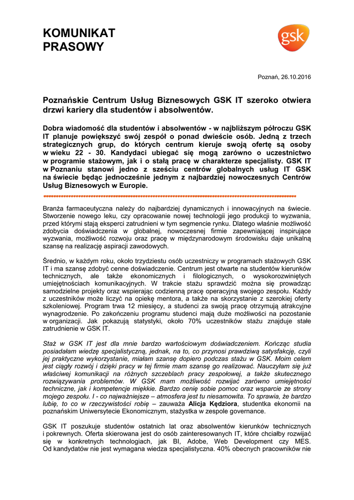 KOMUNIKAT PRASOWY Poznań, 26.10.2016 Poznańskie Centrum Usług Biznesowych GSK IT szeroko otwiera drzwi kariery dla studentów i absolwentów. Dobra wiadomość dla studentów i absolwentów - w najbliższym półroczu GSK IT planuje powiększyć swój zespół o ponad dwieście osób. Jedną z trzech strategicznych grup, do których centrum kieruje swoją ofertę są osoby w wieku 22 - 30. Kandydaci ubiegać się mogą zarówno o uczestnictwo w programie stażowym, jak i o stałą pracę w charakterze specjalisty. GSK IT w Poznaniu stanowi jedno z sześciu centrów globalnych usług IT GSK na świecie będąc jednocześnie jednym z najbardziej nowoczesnych Centrów Usług Biznesowych w Europie. Branża farmaceutyczna należy do najbardziej dynamicznych i innowacyjnych na świecie. Stworzenie nowego leku, czy opracowanie nowej technologii jego produkcji to wyzwania, przed którymi stają eksperci zatrudnieni w tym segmencie rynku. Dlatego właśnie możliwość zdobycia doświadczenia w globalnej, nowoczesnej firmie zapewniającej inspirujące wyzwania, możliwość rozwoju oraz pracę w międzynarodowym środowisku daje unikalną szansę na realizację aspiracji zawodowych. Średnio, w każdym roku, około trzydziestu osób uczestniczy w programach stażowych GSK IT i ma szansę zdobyć cenne doświadczenie. Centrum jest otwarte na studentów kierunków technicznych, ale także ekonomicznych i filologicznych, o wysokorozwiniętych umiejętnościach komunikacyjnych. W trakcie stażu sprawdzić można się prowadząc samodzielne projekty oraz wspierając codzienną pracę operacyjną swojego zespołu. Każdy z uczestników może liczyć na opiekę mentora, a także na skorzystanie z szerokiej oferty szkoleniowej. Program trwa 12 miesięcy, a studenci za swoją pracę otrzymują atrakcyjne wynagrodzenie. Po zakończeniu programu studenci mają duże możliwości na pozostanie w organizacji. Jak pokazują statystyki, około 70% uczestników stażu znajduje stałe zatrudnienie w GSK IT. Staż w GSK IT jest dla mnie bardzo wartościowym doświadczeniem. Kończąc studia posiadałam wiedzę specjalistyczną, jednak, na to, co przynosi prawdziwą satysfakcję, czyli jej praktyczne wykorzystanie, miałam szansę dopiero podczas stażu w GSK. Moim celem jest ciągły rozwój i dzięki pracy w tej firmie mam szansę go realizować. Nauczyłam się już właściwej komunikacji na różnych szczeblach pracy zespołowej, a także skutecznego rozwiązywania problemów. W GSK mam możliwość rozwijać zarówno umiejętności techniczne, jak i kompetencje miękkie. Bardzo cenię sobie pomoc oraz wsparcie ze strony mojego zespołu. I - co najważniejsze – atmosfera jest tu niesamowita. To sprawia, że bardzo lubię, to co w rzeczywistości robię – zauważa Alicja Kędziora, studentka ekonomii na poznańskim Uniwersytecie Ekonomicznym, stażystka w zespole governance. GSK IT poszukuje studentów ostatnich lat oraz absolwentów kierunków technicznych i pokrewnych. Oferta skierowana jest do osób zainteresowanych IT, które chciałby rozwijać się w konkretnych technologiach, jak BI, Adobe, Web Development czy MES. Od kandydatów nie jest wymagana wiedza specjalistyczna. 40% obecnych pracowników nie KOMUNIKAT PRASOWY ma pierwotnego wykształcenia informatycznego, a niezbędną wiedzę zdobywa dzięki zapewnianej przez firmę bogatej ofercie rozwojowej. Warunkiem koniecznym jest znajomość języka angielskiego na poziomie komunikatywnym. Kandydaci powinni posiadać umiejętność szybkiego uczenia się, pracy w grupie. Mile widziane są również rozwinięte kompetencje komunikacyjne, zdolności analityczne oraz wielozadaniowość. W związku z ciągłym rozwojem GSK IT w Poznaniu, planujemy zatrudnić ponad dwustu nowych członków zespołu. Zaplanowana na najbliższe miesiące rekrutacja obejmie zarówno studentów rozpoczynających swoją karierę, jak i doświadczonych specjalistów w różnych dziedzinach. Zespół specjalistów pracujących w Poznaniu będzie odpowiedzialny za realizację części globalnej strategii IT GSK, dostarczając głęboką wiedzę i doświadczenie w strategicznych z punktu widzenia biznesu systemach IT w firmie – poinformował Daniel Lebeau, Chief Information Officer w GSK. Poznańskie GSK IT na przestrzeni lat zyskało miano atrakcyjnego pracodawcy, który oferuje przyjazne, nowoczesne środowisko pracy. Jest też wysoko oceniane z perspektywy możliwości rozwoju oraz zdobywania doświadczenia zawodowego nie tylko wśród doświadczonych pracowników, ale również – dzięki programom stażowym – wśród studentów. Jak pokazuje wewnętrzne badanie satysfakcji członków zespołu GSK IT, pracownicy najbardziej cenią sobie szansę zdobycia specjalistycznej wiedzy, stabilność zatrudnienia, a także możliwość pracy w międzynarodowym środowisku. ieszę się, że w najbliższych miesiącach do zespołu GSK IT dołączą również studenci i absolwenci rozpoczynający karierę zawodową. soby te zostaną odpowiednio przeszkolone w celu zdobycia umiejętności technicznych oraz praktycznej wiedzy na temat systemów i aplikacji działających w ramach globalnych struktur GSK. Pragnę przy tej okazji podkreślić, że podejmowana od lat współpraca z poznańskimi uczelniami jest bardzo efektywna pozwala znale ć miejsca pracy najlepszym studentom i absolwentom, a nam fantastycznych członków zespołu GSK IT - przekonuje Sebastian Drzewiecki, Dyrektor Globalnego Centrum GSK IT w Polsce. Obecnie, już ponad 500 wysoko wykwalifikowanych specjalistów zatrudnionych w GSK IT w Poznaniu obsługuje ponad 100 tysięcy pracowników GSK na całym świecie oraz ściśle współpracuje z innymi placówkami firmy w USA, Wielkiej Brytanii czy Malezji. W ciągu dekady poznańskie biuro z zaledwie 10-osobowego zespołu wsparcia IT rozwinęło się do jednego z wiodących światowych GSK Business Service Center i konsekwentnie realizuje plany zwiększenia zatrudnienia. G