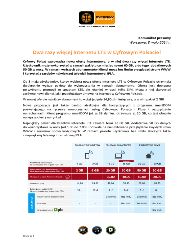 Komunikat prasowy Warszawa, 8 maja 2014 r. Dwa razy więcej Internetu LTE w Cyfrowym Polsacie! Cyfrowy Polsat wprowadza nową ofertę internetową, a w niej dwa razy więcej Internetu LTE. Użytkownik może wykorzystać w ramach pakietu co miesiąc nawet 60 GB, a do tego dodatkowych 50 GB w nocy. W ramach wyższych abonamentów klienci mogą bez limitu przeglądać strony WWW i korzystać z zasobów największej telewizji internetowej IPLA. Od 8 maja użytkownicy, którzy wybiorą nową ofertę Internetu LTE w Cyfrowym Polsacie otrzymają dwukrotnie wyższe pakiety do wykorzystania w ramach abonamentu. Oferta jest dostępna po wybraniu promocji ze sprzętem LTE, ale również w opcji tylko SIM. Mogą z niej skorzystać zarówno nowi klienci, jak i przedłużający umowę na Internet w Cyfrowym Polsacie. W nowej ofercie najniższy abonament to wciąż jedynie 14,90 zł miesięcznie, a w nim pakiet 2 GB! Nowa propozycja jest także bardzo atrakcyjna dla korzystających z programu smartDOM pozwalającego na łączenie nowoczesnych usług Cyfrowego Polsatu i Plusa i oszczędzanie na rachunkach. Klient programu smartDOM już za 39 zł/mies. otrzymuje aż 20 GB, co jest obecnie najlepszą ofertą na rynku! Największy pakiet dla klientów Internetu LTE zawiera teraz aż 60 GB, dodatkowe 50 GB danych do wykorzystania w nocy (od 1.00 do 7.00) i pozwala na nielimitowane przeglądanie zwykłych stron WWW i serwisów społecznościowych. W ramach pakietu użytkownik bez limitu skorzysta także z największej telewizji internetowej IPLA. Strona 1 z 2 Nowa oferta i dwa razy większe pakiety GB są dostępne także z Internetem domowym LTE, czyli specjalnym zestawem składającym się z zewnętrznego modemu ODU-100 LTE oraz routera domowego LTE IDU-100 wyposażonego w WiFi. Ta innowacyjna propozycja stanowi alternatywę dla Internetu stacjonarnego i jest szczególnie godna polecenia tam, gdzie nie ma infrastruktury kablowej. Zestaw ODU-IDU istotnie zwiększa zasięg internetu LTE i zapewnia jego lepszą jakość oraz szybkość. Klienci korzystający z Internetu domowego LTE w Cyfrowym Polsacie oprócz dwukrotnie większych pakietów niż dotychczas, przez 6 miesięcy nie płacą także abonamentu, co pozwala zaoszczędzić prawie 600 zł! Dwa razy więcej Internetu LTE jest dostępne również w promocji „Internet na próbę”, w ramach której klient może przetestować Internet LTE w Cyfrowym Polsacie za 9 zł, jeśli wybierze sprzęt na udostępnienie lub ofertę bez sprzętu. Technologia LTE pozwala na komfortowe i superszybkie korzystanie z Internetu: pobieranie dużych plików, dzielenie się nimi, bezproblemowe korzystanie z aplikacji, gier, chatów, komfortowe oglądanie filmów bez buforowania i zakłóceń. W zasięgu największej i najnowocześniejszej sieci LTE Cyfrowego Polsatu i Plusa jest aż 26 mln Polaków, a oferowane przez obu operatorów sprzęty działające w technologii LTE umożliwiają pobieranie danych z prędkością aż do 150 Mb/s. Oferta Internetu z dwa razy większymi pakietami LTE jest także dostępna w sieci Plus. Kontakt dla mediów: Olga Zomer Rzecznik Prasowy Cyfrowy Polsat S.A. T: (+48 22) 356 60 35 M: (+48) 507 096 883 E: [email protected] ●●●●● O Cyfrowym Polsacie: Cyfrowy Polsat to największa grupa medialna w Polsce, którą tworzą spółki: Cyfrowy Polsat – największa w Polsce i czwarta co do wielkości w Europie platforma satelitarna, Telewizja Polsat – pierwszy polski nadawca komercyjny oferujący 25 popularnych kanałów telewizyjnych oraz Redefine – twórca serwisu IPLA, lidera na rynku wideo online z ok. 3,9 mln użytkowników. W portfolio 25 (w tym 5 HD) kanałów Telewizji Polsat znajdują się: Polsat, Polsat HD, Polsat 2, TV4, TV6, Polsat Sport, Polsat Sport HD, Polsat Sport Extra, Polsat Sport Extra HD, Polsat Sport News, Polsat News, Polsat News HD, Polsat Biznes, Polsat Play, Polsat Cafe, Polsat Film, Polsat Film HD, CI Polsat, Polsat Jim Jam, Polsat Food, Polsat Viasat Explore, Polsat Viasat Nature, Polsat Viasat History, Polsat Romans, Disco Polo Music. Kanały te generują oglądalność na poziomie ponad 23%. Platforma Cyfrowy Polsat posiada ponad 3,5 mln abonentów. Zapewnia dostęp do ponad 140 kanałów polskojęzycznych, ponad 40 kanałów HD oraz nowoczesnych usług PPV, VOD Domowa Wypożyczalnia Filmowa, Catch-up TV, TV online. Oferuje usługę TV Mobilna w technologii DVB-T. Platforma posiada własną fabrykę dekoderów. Świadczy usługi dostępu do szerokopasmowego Internetu w bezprzewodowych technologiach LTE i HSPA+. Od maja 2008 r. Cyfrowy Polsat jest notowany na Giełdzie Papierów Wartościowych w Warszawie. Więcej informacji: www.cyfrowypolsat.pl oraz www.polsat.pl Strona 2 z 2