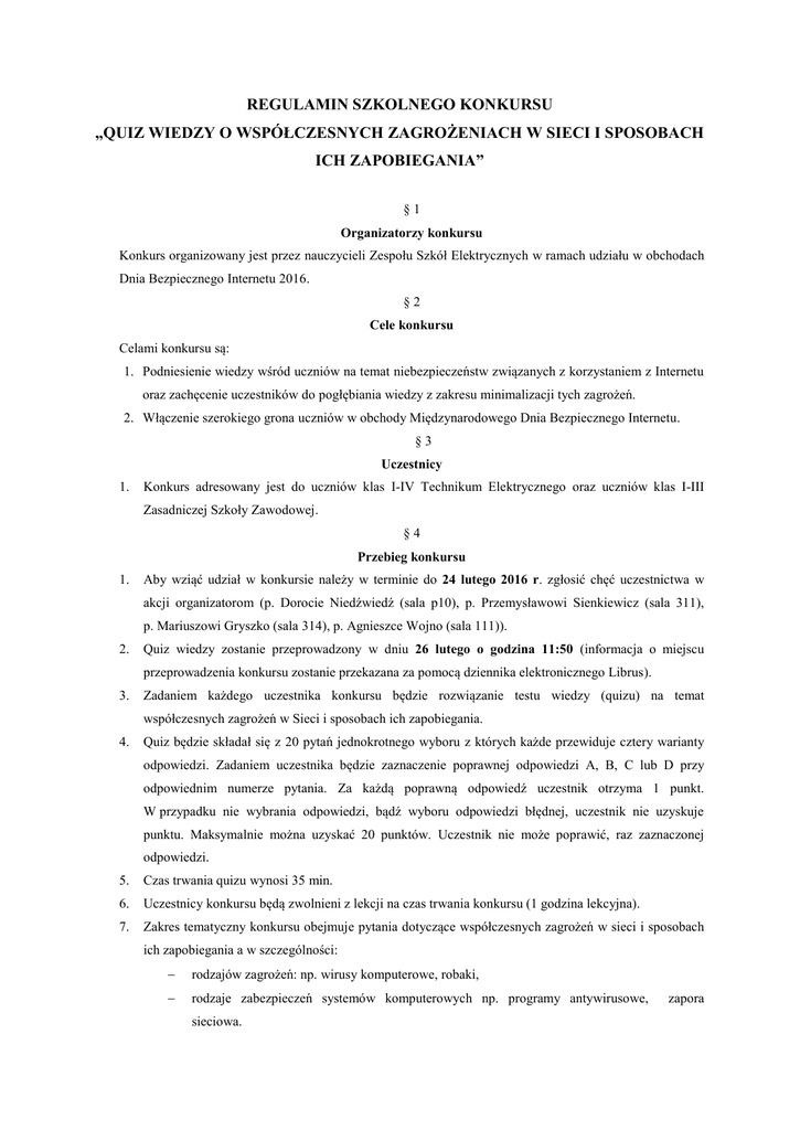 REGULAMIN SZKOLNEGO KONKURSU „QUIZ WIEDZY O WSPÓŁCZESNYCH ZAGROŻENIACH W SIECI I SPOSOBACH ICH ZAPOBIEGANIA” §1 Organizatorzy konkursu Konkurs organizowany jest przez nauczycieli Zespołu Szkół Elektrycznych w ramach udziału w obchodach Dnia Bezpiecznego Internetu 2016. §2 Cele konkursu Celami konkursu są: 1. Podniesienie wiedzy wśród uczniów na temat niebezpieczeństw związanych z korzystaniem z Internetu oraz zachęcenie uczestników do pogłębiania wiedzy z zakresu minimalizacji tych zagrożeń. 2. Włączenie szerokiego grona uczniów w obchody Międzynarodowego Dnia Bezpiecznego Internetu. §3 Uczestnicy 1. Konkurs adresowany jest do uczniów klas I-IV Technikum Elektrycznego oraz uczniów klas I-III Zasadniczej Szkoły Zawodowej. §4 Przebieg konkursu 1. Aby wziąć udział w konkursie należy w terminie do 24 lutego 2016 r. zgłosić chęć uczestnictwa w akcji organizatorom (p. Dorocie Niedźwiedź (sala p10), p. Przemysławowi Sienkiewicz (sala 311), p. Mariuszowi Gryszko (sala 314), p. Agnieszce Wojno (sala 111)). 2. Quiz wiedzy zostanie przeprowadzony w dniu 26 lutego o godzina 11:50 (informacja o miejscu przeprowadzenia konkursu zostanie przekazana za pomocą dziennika elektronicznego Librus). 3. Zadaniem każdego uczestnika konkursu będzie rozwiązanie testu wiedzy (quizu) na temat współczesnych zagrożeń w Sieci i sposobach ich zapobiegania. 4. Quiz będzie składał się z 20 pytań jednokrotnego wyboru z których każde przewiduje cztery warianty odpowiedzi. Zadaniem uczestnika będzie zaznaczenie poprawnej odpowiedzi A, B, C lub D przy odpowiednim numerze pytania. Za każdą poprawną odpowiedź uczestnik otrzyma 1 punkt. W przypadku nie wybrania odpowiedzi, bądź wyboru odpowiedzi błędnej, uczestnik nie uzyskuje punktu. Maksymalnie można uzyskać 20 punktów. Uczestnik nie może poprawić, raz zaznaczonej odpowiedzi. 5. Czas trwania quizu wynosi 35 min. 6. Uczestnicy konkursu będą zwolnieni z lekcji na czas trwania konkursu (1 godzina lekcyjna). 7. Zakres tematyczny konkursu obejmuje pytania dotyczące współczesnych zagrożeń w sieci i sposobach ich zapobiegania a w szczególności: rodzajów zagrożeń: np. wirusy komputerowe, robaki, rodzaje zabezpieczeń systemów komputerowych np. programy antywirusowe, sieciowa. zapora 8. cyberprzestępstw. Jednym ze sposobów pozyskania wiedzy niezbędnej do rozwiązania testu może być prezentacja multimedialna wyświetlana z projektora w holu głównym szkoły w dniach 8 – 24 lutego 2016 r. 9. W trakcie trwania quizu zabronione jest wychodzenie z pomieszczenia, korzystanie z urządzeń elektronicznych, a także innego rodzaju pomocy. W przypadku złamania tego zakazu Organizator zdyskwalifikuje uczestnika w trybie natychmiastowym. §5 Procedury oceniania 1. Nad prawidłowością przeprowadzenia konkursu oraz nad przestrzeganiem niniejszego Regulaminu w trakcie trwania konkursu będzie czuwać Komisja Konkursowa złożona z nauczycieli przedmiotów zawodowych informatycznych: mgr inż. Doroty Niedźwiedź, mgr inż. Przemysława Sienkiewicz, mgr inż. Mariusza Gryszko, mgr inż. Agnieszki Wojno. 2. Komisja Konkursowa wybierze trzech zwycięzców, którzy będą mieli najwyższą punktację w quizie. 3. W przypadku tej samej ilości punktów decyduje czas oddania wypełnionego testu – wygrywa osoba, która oddała test wcześniej (przy oddawaniu testu odbierający wpisuje na teście dokładną minutę i sekundę liczoną od momentu rozpoczęcia testu – hasło «czas start» po rozdaniu wszystkich testów). 4. Organizator zastrzega sobie prawo do odrzucania quizów nieczytelnie wypełnionych lub wypełnionych nieprawidłowo. 5. Po zakończeniu konkursu quizy nie będą zwracane. 6. Od decyzji Komisji nie przysługuje odwołanie. §6 Nagrody 1. W ramach Konkursu zostaną przyznane nagrody rzeczowe oraz dyplomy za zajęcie I, II i III miejsca. 2. Wyniki konkursu zostaną opublikowane na stronie internetowej szkoły http://www.zse.biaman.pl/ w zakładce aktualności nie później niż 23 marca 2016 r. 3. Nagrody rzeczowe nie podlegają wymianie na ekwiwalent pieniężny. §7 Postanowienia końcowe 1. Biorąc udział w konkursie uczestnik akceptuje treść niniejszego Regulaminu. 2. O terminie i miejscu wręczenia nagród, zwycięzcy zostaną powiadomieni osobiście. 3. Uczestnicy wyrażają zgodę na przetwarzanie i publikowanie podanych swoich danych osobowych dla celów związanych z realizacją konkursu zgodnie z przepisami ustawy o ochronie danych osobowych z dnia 29 sierpnia 1997 r. (Dz. U z 2002 r. Nr 101, poz. 926 z późn. zm.). Podanie danych osobowych ma charakter dobrowolny, lecz niezbędny do uczestnictwa w konkursie. 4. Organizator zastrzega sobie prawo do zmiany Regulaminu oraz odwołania lub unieważnienia konkursu, a także przesunięcia terminów konkursu w każdym czasie. Wszelkich informacji o konkursie udzielają koordynatorzy konkursu p. Dorota Niedźwiedź (sala p10), p. Przemysław Sienkiewicz (sala 311), p. Mariusz Gryszko (sala 314), p. Agnieszka Wojno (sala 111).
