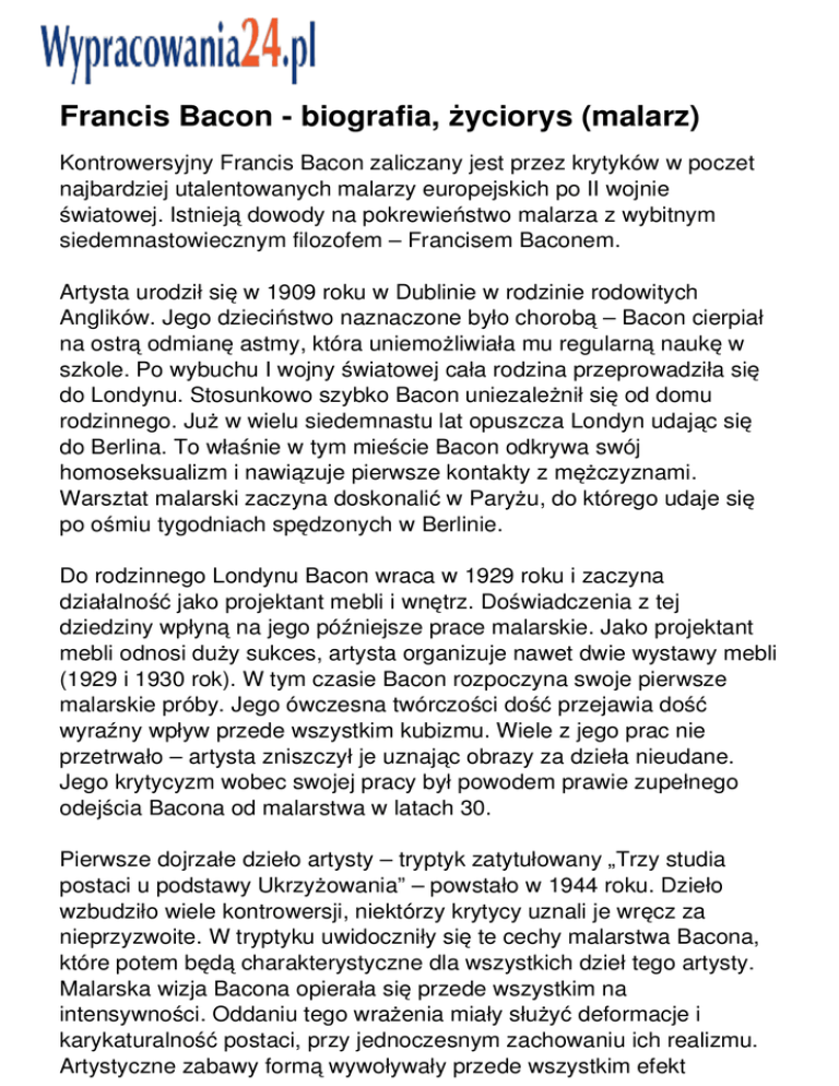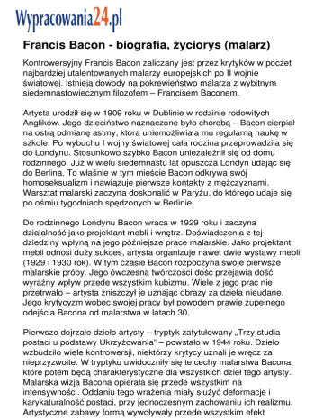 Francis Bacon - biografia, życiorys (malarz) Kontrowersyjny Francis Bacon zaliczany jest przez krytyków w poczet najbardziej utalentowanych malarzy europejskich po II wojnie światowej. Istnieją dowody na pokrewieństwo malarza z wybitnym siedemnastowiecznym filozofem – Francisem Baconem. Artysta urodził się w 1909 roku w Dublinie w rodzinie rodowitych Anglików. Jego dzieciństwo naznaczone było chorobą – Bacon cierpiał na ostrą odmianę astmy, która uniemożliwiała mu regularną naukę w szkole. Po wybuchu I wojny światowej cała rodzina przeprowadziła się do Londynu. Stosunkowo szybko Bacon uniezależnił się od domu rodzinnego. Już w wielu siedemnastu lat opuszcza Londyn udając się do Berlina. To właśnie w tym mieście Bacon odkrywa swój homoseksualizm i nawiązuje pierwsze kontakty z mężczyznami. Warsztat malarski zaczyna doskonalić w Paryżu, do którego udaje się po ośmiu tygodniach spędzonych w Berlinie. Do rodzinnego Londynu Bacon wraca w 1929 roku i zaczyna działalność jako projektant mebli i wnętrz. Doświadczenia z tej dziedziny wpłyną na jego późniejsze prace malarskie. Jako projektant mebli odnosi duży sukces, artysta organizuje nawet dwie wystawy mebli (1929 i 1930 rok). W tym czasie Bacon rozpoczyna swoje pierwsze malarskie próby. Jego ówczesna twórczości dość przejawia dość wyraźny wpływ przede wszystkim kubizmu. Wiele z jego prac nie przetrwało – artysta zniszczył je uznając obrazy za dzieła nieudane. Jego krytycyzm wobec swojej pracy był powodem prawie zupełnego odejścia Bacona od malarstwa w latach 30. Pierwsze dojrzałe dzieło artysty – tryptyk zatytułowany „Trzy studia postaci u podstawy Ukrzyżowania” – powstało w 1944 roku. Dzieło wzbudziło wiele kontrowersji, niektórzy krytycy uznali je wręcz za nieprzyzwoite. W tryptyku uwidoczniły się te cechy malarstwa Bacona, które potem będą charakterystyczne dla wszystkich dzieł tego artysty. Malarska wizja Bacona opierała się przede wszystkim na intensywności. Oddaniu tego wrażenia miały służyć deformacje i karykaturalność postaci, przy jednoczesnym zachowaniu ich realizmu. Artystyczne zabawy formą wywoływały przede wszystkim efekt przerażenia, dojmującego cierpienia, teatralności. W tym czasie głównym tematem obrazów Bacona stał się sam człowiek, malarz zaliczał się do zdecydowanych krytyków dominującego wówczas w sztuce abstrakcjonizmu. O wiele bliżej było mu do malarstwa ekspresjonistycznego, zaś przez krytyków zaliczany jest on przede wszystkim do figuralnego nurtu malarstwa. W latach 1954-1961 styl malarza ulega drastycznej zmianie. Bacon umieszcza w swych pracach elementy codzienności, inspiracją staje się dla niego fotografia i sztuka ulicy. Z tego okresu pracy malarza zachowało się wiele portretów jego znajomych i przyjaciół. Krytycy wiążą zmiany stylu Bacona ze zmianami w jego życiu osobistym. W latach 60. artysta nawiązał romans z Georgem Deyerem, który zakończył się samobójstwem Deyera w 1971 roku. To tragiczne wydarzenie również miało istotny wpływ na twórczość Bacona. W jego malarstwie zaczyna pojawiać się motyw samotnego, obdartego z godności mężczyzny. Bacon był jednym z pierwszych artystów, którzy otwarcie poruszali wątki homoseksualne w sztuce. W tym okresie malarz eksperymentował również z formą. Często malował swe obrazy na odwrotnej stronie płótna, posługiwał się techniką swobodnego rzucania farby na obraz. Znawcy malarstwa podkreślają, że Francis Bacon w nieszablonowy sposób poruszał jedne z podstawowych aspektów ludzkiej egzystencji – samotność i cierpienie. Artysta zmarł na zawał serca w 1992 roku. Do jego najważniejszych dzieł należą, m.in., „Dwie postaci w trawie” (1954), tryptyk „Trzy postacie w jednym pomieszczeniu” (1964), „Ciało w ruchu” (1976).