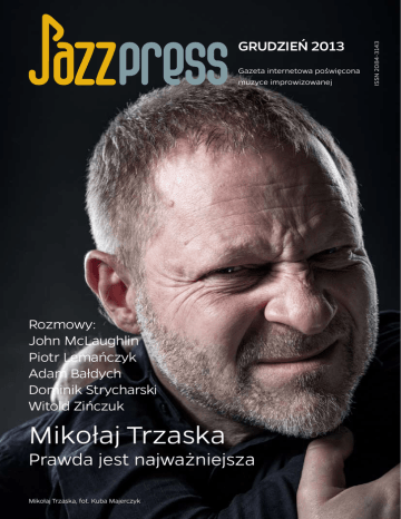 Gazeta internetowa poświęcona muzyce improwizowanej Rozmowy: John McLaughlin Piotr Lemańczyk Adam Bałdych Dominik Strycharski Witold Zińczuk Mikołaj Trzaska Prawda jest najważniejsza Mikołaj Trzaska, fot. Kuba Majerczyk ISSN 2084-3143 GRUDZIEŃ 2013 W tym miesiącu usłyszycie, bądź przeczytacie jeszcze miliony życzeń. Mamy na tyle komfortową sytuację, że nie musimy układać sms-owych wierszyków, czy leczyć rodzinnych sporów. Możemy Wam i jednocześnie sobie, życzyć wszystkiego co najlepsze w muzycznej rzeczywistości, na którą tak trudno czasem znaleźć czas. Życzymy rozsmakowywania się w Waszych ulubionych jazzowych nurtach, nie bacząc na wszechotaczające nas „muzyczne produkty”. Życzymy, by przy całym codziennym pędzie znaleźć chwilę na dobre dźwięki, które wszyscy tak bardzo lubimy. Mamy nadzieję, że kolejny rok będzie równie (bądź bardziej!) obfity w doskonałe koncerty i albumy, o których postaramy się Wam uprzejmie donosić. Dziękujemy za wspólnie spędzony rok 2013 i mamy nadzieję, że w styczniu zobaczymy się w nadkomplecie po obu stronach monitorów. Piszemy dla Was i dzięki Wam! Redakcja magazynu JazzPRESS i RadioJAZZ.FM JazzPRESS, grudzień 2013 Od Redakcji |3 redaktor naczelny Roch Siciński [email protected] Ostatni tekst Od Redakcji skończyłem małą zapowiedzią tego, co miało nas czekać w grudniu. Rzeczywiście cytat, na który się powołałem, a który zaraz przypomnę, odgrywa znaczną rolę w postrzeganiu twórczości głównego bohatera bieżącego JazzPRESS-u. Nie będę roztrząsał kariery Mikołaja Trzaski – zachęcam do lektury obszernej rozmowy, jaką przeprowadził Piotr Wickowski. Zdążę natomiast poruszyć jeden, ale od zawsze mocno irytujący mnie, wycinek kilkudziesięciu rozmów na temat tego muzyka. Mimo obecnie topowej pozycji, przez całą karierę naszemu bohaterowi towarzyszy jeden zarzut. W treści banalny, w zasadności płytki, a brzmi następująco: „Trzaska nie umie grać!”. Bum! Cios prosto między oczy, bez zastanowienia, na sam początek rozmowy o tym wybitnym saksofoniście, klarneciście i kompozytorze. Kto wygłasza takie tezy? Nie tylko pewna część jazzfanów, być może posiadających węższy (co nie znaczy gorszy!) horyzont muzyczny, być może płytszą (co nie znaczy gorszą!) percepcję. Co ciekawe, słyszałem ten zarzut również od muzyków z najwyższej półki i to nie tej mainstreamowej. Głośno tego nie powiedzą, więc postanowiłem ich wyręczyć. Zarzut braku biegłości technicznej był częściej przywoływany na przełomie lat 80. i 90., kiedy zespół Miłość robił niemałe zamieszanie na naszym ryneczku, a taka muzyka (odlepiona od założeń akademickich) ciągle musiała torować sobie drogę do serc słuchaczy i umysłów rzeszy „środowiska”. Mimo upływu lat metka została. Stąd cytat wygrzebany z książki traktującej o improwizacji w muzyce barokowej – „Umiejętność improwizowania jest jedną z najważniejszych cech legitymujących dobrego wykonawcę”(Michał Zieliński). Banalne, a jakże ważne! W muzyce jazzowej, czy ujmując szerzej – improwizowanej, wydaje się być cechą najistotniejszą, przeważającą drugą szalę, nawet jeśli położymy na nią wszystkie wartości, jakie muzyk „powinien” posiadać. Nieważne czy Trzaska na początku lat 90. potrafił zagrać a vista zestaw breckerówek, czy coltrane’owskich pasaży! Posiada umiejętność przekazywania emocji, opowiadania całych historii za pośrednictwem instrumentu. Ba! On jest w tym swoim opowiadaniu niepodrabialnie dobry. Dlatego właśnie z okładki patrzy na nas, w nieprzypadkowym niepokornym grymasie, improwizator – Mikołaj Trzaska. Bez większych wątpliwości to jedna z najistotniejszych osobowości muzycznych polskiej współczesnej sceny improwizowanej. Zresztą, czy tylko polskiej? Miłej lektury! > SPIS TREŚCI 3 – Od Redakcji 4 – SPIS TREŚCI 6 – Wydarzenia 10 – Płyty 10 12 14 Nowości płytowe Pod naszym patronatem Top Note Maciej Fortuna/Krzysztof Dys – Tropy 17 18 20 KONKURSY RadioJAZZ.FM poleca Recenzje Aga Zaryan – Remembering Nina & Abbey Robert Glasper Experiment – Black Radio 2 Monika Borzym – My Places Diane Reeves – Beautiful Life Marek Napiórkowski – Up! Jonathan Butler – Merry Christmas To You Fusion Generation Project – No Fusion Pablo Held – Elders NSI Quartet – Introducing 36 – Przewodnik koncertowy 36 38 40 43 46 48 58 60 63 66 68 70 72 < RadioJAZZ.FM i JazzPRESS zapraszają II Mokotów Jazz Fest Bielska Jesień Jazzowa Resonance Ensemble Kena Vandermarka Atomic Jazztopad John Scofield Remember Shakti David Murray Candy Dulfer Aga Zaryan w krakowskim Studiu Aga Zaryan – koncert w Łodzi Dragon Swing JazzPRESS, grudzień 2013 5 75 – Rozmowy 75 Mikołaj Trzaska Prawda jest najważniejsza 88 Piotr Lemańczyk Własny głos 96 Adam Bałdych Europejska tożsamość jazzu 104 Dominik Strycharski Równowaga jest ważna! 112 Witold Zińczuk For Tune– wytwórnia założona z pasji 121 John McLaughlin Nie da się dojść do końca muzyki 124 –Słowo na jazzowo 124 Z siedzenia pasażera Wesoły Profan 126 Jazzowy Notes Zabawa w jazz 128 Lewym uchem Także tego 129 World Feeling Grając dla zmiany 132 –BLUESOWY ZAUŁEK 132 Warsaw Blues Night 134 –Kanon Jazzu 136 –Redakcja Dofinansowano ze środków Ministra Kultury i Dziedzictwa Narodowego. > 6| Wydarzenia 20.11.2013 r. podczas koncertu w Operze i Filharmonii Podlaskiej Trio Możdżer Danielsson Fresco otrzymało Platynową Płytę za najnowszy album Polska. Muzycy otrzymali również Diamentową Płytę za pierwszy album The Time oraz Podwójną Platynę za koncertowe DVD Live. Obecnie album Polska znajduje się na drugim miejscu na liście sprzedaży OLIS. Płyta również ma świetne notowania na świecie: w Niemczech jest na 3 miejscu najlepiej sprzedających się płyt JPC Jazz Charts, a w Wielkiej Brytanii znajduje się na 3 miejsc