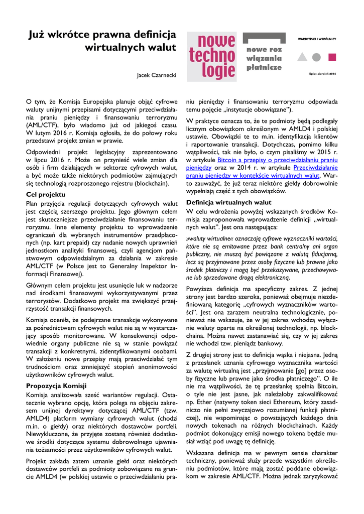 Już wkrótce prawna definicja wirtualnych walut Jacek Czarnecki O tym, że Komisja Europejska planuje objąć cyfrowe waluty unijnymi przepisami dotyczącymi przeciwdziałania praniu pieniędzy i finansowaniu terroryzmu (AML/CTF), było wiadomo już od jakiegoś czasu. W lutym 2016 r. Komisja ogłosiła, że do połowy roku przedstawi projekt zmian w prawie. Odpowiedni projekt legislacyjny zaprezentowano w lipcu 2016 r. Może on przynieść wiele zmian dla osób i firm działających w sektorze cyfrowych walut, a być może także niektórych podmiotów zajmujących się technologią rozproszonego rejestru (blockchain). Cel projektu Plan przyjęcia regulacji dotyczących cyfrowych walut jest częścią szerszego projektu. Jego głównym celem jest skuteczniejsze przeciwdziałanie finansowaniu terroryzmu. Inne elementy projektu to wprowadzenie ograniczeń dla wybranych instrumentów przedpłaconych (np. kart prepaid) czy nadanie nowych uprawnień jednostkom analityki finansowej, czyli agencjom państwowym odpowiedzialnym za działania w zakresie AML/CTF (w Polsce jest to Generalny Inspektor Informacji Finansowej). Głównym celem projektu jest usunięcie luk w nadzorze nad środkami finansowymi wykorzystywanymi przez terrorystów. Dodatkowo projekt ma zwiększyć przejrzystość transakcji finansowych. Komisja oceniła, że podejrzane transakcje wykonywane za pośrednictwem cyfrowych walut nie są w wystarczający sposób monitorowane. W konsekwencji odpowiednie organy publiczne nie są w stanie powiązać transakcji z konkretnymi, zidentyfikowanymi osobami. W założeniu nowe przepisy mają przeciwdziałać tym trudnościom oraz zmniejszyć stopień anonimowości użytkowników cyfrowych walut. Propozycja Komisji Komisja analizowała sześć wariantów regulacji. Ostatecznie wybrano opcję, która polega na objęciu zakresem unijnej dyrektywy dotyczącej AML/CTF (tzw. AMLD4) platform wymiany cyfrowych walut (chodzi m.in. o giełdy) oraz niektórych dostawców portfeli. Niewykluczone, że przyjęte zostaną również dodatkowe środki dotyczące systemu dobrowolnego ujawniania tożsamości przez użytkowników cyfrowych walut. Projekt zakłada zatem uznanie giełd oraz niektórych dostawców portfeli za podmioty zobowiązane na gruncie AMLD4 (w polskiej ustawie o przeciwdziałaniu pra- niu pieniędzy i finansowaniu terroryzmu odpowiada temu pojęcie „instytucje obowiązane”). W praktyce oznacza to, że te podmioty będą podlegały licznym obowiązkom określonym w AMLD4 i polskiej ustawie. Obowiązki te to m.in. identyfikacja klientów i raportowanie transakcji. Dotychczas, pomimo kilku wątpliwości, tak nie było, o czym pisaliśmy w 2015 r. w artykule Bitcoin a przepisy o przeciwdziałaniu praniu pieniędzy oraz w 2014 r. w artykule Przeciwdziałanie praniu pieniędzy w kontekście wirtualnych walut. Warto zauważyć, że już teraz niektóre giełdy dobrowolnie wypełniają część z tych obowiązków. Definicja wirtualnych walut W celu wdrożenia powyżej wskazanych środków Komisja zaproponowała wprowadzenie definicji „wirtualnych walut”. Jest ona następująca: »waluty wirtualne« oznaczają cyfrowe wyznaczniki wartości, które nie są emitowane przez bank centralny ani organ publiczny, nie muszą być powiązane z walutą fiducjarną, lecz są przyjmowane przez osoby fizyczne lub prawne jako środek płatniczy i mogą być przekazywane, przechowywane lub sprzedawane drogą elektroniczną. Powyższa definicja ma specyficzny zakres. Z jednej strony jest bardzo szeroka, ponieważ obejmuje niezdefiniowaną kategorię „cyfrowych wyznaczników wartości”. Jest ona zarazem neutralna technologicznie, ponieważ nie wskazuje, że w jej zakres wchodzą wyłącznie waluty oparte na określonej technologii, np. blockchaina. Można nawet zastanawiać się, czy w jej zakres nie wchodzi tzw. pieniądz bankowy. Z drugiej strony jest to definicja wąska i niejasna. Jedną z przesłanek uznania cyfrowego wyznacznika wartości za walutę wirtualną jest „przyjmowanie [go] przez osoby fizyczne lub prawne jako środka płatniczego”. O ile nie ma wątpliwości, że tę przesłankę spełnia Bitcoin, o tyle nie jest jasne, jak należałoby zakwalifikować np. Ether (natywny token sieci Ethereum, który zasadniczo nie pełni zwyczajowo rozumianej funkcji płatniczej), nie wspominając o powstających każdego dnia nowych tokenach na różnych blockchainach. Każdy podmiot dokonujący emisji nowego tokena będzie musiał wziąć pod uwagę tę definicję. Wskazana definicja ma w pewnym sensie charakter techniczny, ponieważ służy przede wszystkim określeniu podmiotów, które mają zostać poddane obowiązkom w zakresie AML/CTF. Można jednak zaryzykować stwierdzenie, że jej znaczenie będzie w rzeczywistości o wiele dalej idące. W przypadku przyjęcia projektu Komisji ta definicja będzie musiała zostać implementowana do poszczególnych krajowych porządków prawnych. W większości z nich, w tym w Polsce, będzie to pierwsza legalna definicja „wirtualnych walut”. Pomimo że zostanie przyjęta na potrzeby przepisów AML/CTF, będzie zapewne promieniować na inne dziedziny prawa. Dotychczas każdy organ publiczny, który zetknął się z tematyką cyfrowych walut, mógł konstruować własną definicję. W przyszłości powyższa definicja będzie co najmniej punktem odniesienia dla wszelkich analiz prawnych dotyczących cyfrowych walut. Inne opcje rozważane przez Komisję Przed przedstawieniem powyższych propozycji Komisja wykonała szereg analiz, w trakcie których rozważane były inne opcje regulacji. Komisja doszła do wniosku, że główny cel – zlikwidowanie lub ograniczenie anonimowości użytkowników cyfrowych walut – może zostać zrealizowany poprzez przyjęcie środków dotyczących trzech grup podmiotów: użytkowników, platform wymiany oraz niektórych dostawców portfeli. Na tej podstawie określono sześć możliwych opcji: Użytkownicy Opcja A. W