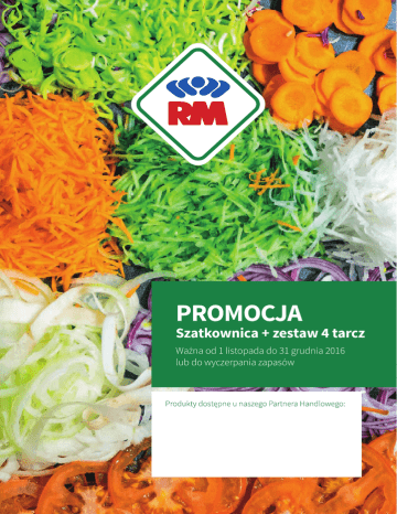 PROMOCJA Szatkownica + zestaw 4 tarcz Ważna od 1 listopada do 31 grudnia 2016 lub do wyczerpania zapasów 2 OFERTA PROMOCYJNA PRODUCENTA wa na do ko ca roku 2016 lub do wyczerpania zapasów 4 699,- Szatkownica + 4 tarcze GRATIS cena promocyjna RODZAJ OBRÓBKI ■ Krojenie w plastry, w kostkę, szatkowanie, ucieranie i/lub krojenie w paski owoców, warzyw, suchego pieczywa, sera, orzechów, pieczarek, itp. 6 199,- cena katalogowa RG-100 / 00009178 CHARAKTERYSTYKA ■ Umożliwia przygotowywanie od 20 do 400 porcji dziennie. ■ Półokrągły podajnik, który można otworzyć w celu szybkiego i łatwego podawania produktów obiema rękami. ■ Automatyczna funkcja uruchomienia/zatrzymania, zapewniająca szybkie i bezpieczne podawanie produktów. ■ Podłużna przystawka do ciągłego cięcia ogórków, pora, itp. ■ Dostępny podajnik do krojenia pod kątem - patrz akcesoria ■ Dzięki zastosowaniu pochyłej konstrukcji podajnik i dźwignia dociskowa znajdują się na wygodnej wysokości, zapewniając ergonomiczną pozycję w trakcie obsługi urządzenia. ■ Metalowe lub wykonane z acetalu albo poliuretanu tarcze tnące wyposażone w ostrza, które można wyjmować w celu wymiany lub zaostrzenia. ■ Uchwyt z tyłu ułatwia przenoszenie. ■ Jedna prędkość. MATERIAŁY ■ Obudowa urządzenia i podajnik wykonane są z metalu Oznaczenie RG-100 Wymiary Pojemność Zasilanie el. Moc cm l V/Hz kW 42,5 x 21,5 x 49,5 podajnik: 1,65 230 V / 50 Hz 0,25 GRATIS komplet tarcz o wartości 1429 zł: ■ ■ ■ ■ plastry 2 mm plastry 10 mm wiórki 2 mm kostka 10x10 mm TARCZE DO KROJENIA Krojenie jest proste przy użyciu standardowych tarcz HALLDE oraz tarcz do krojenia w plastry. Tarcze stanowią podstawowy element dowolnego zestawu narzędzi do krojenia i są dostępne w różnych rozmiarach. 00009406 00009657 00009410 00017653 TARCZE DO WIÓRKOWANIA Tarcze do wiórkowania i szatkowania pozwalają błyskawicznie przygotować apetyczną sałatkę. Pozwalają na ucieranie twardych produktów, jak marchew, czy też pieczywo i ser. HALLDE ma obecnie w ofercie nową drobną tarczę do wiórkowania – tarczę do tarcia twardych serów. Wszystkie ceny podane są w netto PLN, a ilustracje należy traktować jako poglądowe. KROJENIE W KOSTKĘ Krojenie w kostkę każdego rodzaju produktu za pomocą tarczy kostkującej w połączeniu ze standardową tarczą do krojenia w plastry. Miękkie produkty łatwo kroi się przy użyciu zestawów do miękkiego kostkowania HALLDE. RM GASTRO Polska Sp. z o.o. www.rmgastro.pl • [email protected] wa na do ko ca roku 2016 lub do wyczerpania zapasów OFERTA PROMOCYJNA PRODUCENTA 3 3 199,- Szatkownica + 4 tarcze GRATIS cena promocyjna RODZAJ OBRÓBKI ■ Krojenie w plastry, szatkowanie, ucieranie i/lub krojenie w słupki owoców, warzyw, suchego pieczywa, sera, orzechów, pieczarek, itp. 3 941,- cena katalogowa RG-50S / 00022114 CHARAKTERYSTYKA ■ Umożliwia przygotowywanie od 10 do 80 porcji dziennie. ■ Półokrągły podajnik, który można otworzyć w celu szybkiego i łatwego podawania produktów obiema rękami. ■ Automatyczna funkcja uruchomienia/zatrzymania, zapewniająca szybkie i bezpieczne podawanie produktów. ■ Podłużna przystawka do ciągłego cięcia ogórków, pora, itp. ■ Tarcze tnące z mocnego acetalu, polipropenu lub aluminium, ■ z ostrzami, które można wyjmować w celu wymiany lub zaostrzenia ■ Jedna prędkość. MATERIAŁY ■ Obudowa urządzenia wykonana jest z tworzywa ABS. ■ Komora robocza z tworzywa sztucznego. Oznaczenie RG-50S Wymiary cm 350 x 285 x 465 Pojemność l podajnik: 0,9 Zasilanie el. Moc V/Hz kW 230 V / 50 Hz 1 GRATIS komplet tarcz o wartości 682 zł: ■ ■ ■ ■ plastry 2 mm plastry 4 mm wiórki 4 mm słupki 2x2 mm TARCZE DO KROJENIA Krojenie jest proste przy użyciu standardowych tarcz HALLDE oraz tarcz do krojenia w plastry. Tarcze stanowią podstawowy element dowolnego zestawu narzędzi do krojenia i są dostępne w różnych rozmiarach. 00009406 00009426 00009344 00009389 TARCZE DO WIÓRKOWANIA Tarcze do wiórkowania i szatkowania pozwalają błyskawicznie przygotować apetyczną sałatkę. Pozwalają na ucieranie twardych produktów, jak marchew, czy też pieczywo i ser. HALLDE ma obecnie w ofercie nową drobną tarczę do wiórkowania – tarczę do tarcia twardych serów. Wszystkie ceny podane są w netto PLN, a ilustracje należy traktować jako poglądowe. SŁUPKI I FRYTKI Słupki idealne do sałatek i zup albo apetyczne frytki można zrobić, wykorzystując tarczę do krojenia w słupki lub kratkę do frytek. RM GASTRO Polska Sp. z o.o. www.rmgastro.pl • [email protected] 4 ważna do końca roku 2016 lub do wyczerpania zapasów OFERTA PROMOCYJNA PRODUCENTA Przewodnik po tarczach Zdjęcie Opis Tarcze tnące do plastrów ■ Do krojenia w plastry twardych i miękkich produktów, takich jak warzywa korzeniowe, cebula, por, papryka, jabłka, owoce cytrusowe i ogórki. ■ Szatkowanie kapusty. ■ Krojenie w plasterki o grubości od 4 mm pomidorów, bananów, pieczarek. ■ Szatkowanie sałaty i kapusty pekińskiej. ■ W zestawieniu z odpowiednią tarczą kostkującą, 4 mm tarcza tnąca umożliwia siekanie cebuli. Tarcza tnąca do plastrów karbowanych ■ Do krojenia buraków, ogórków, marchwi itp. w karbowane plastry. Tarcze do słupków ■ Do przygotowywania zup i sałatek oraz krojenia ogórków itp. ■ Rozmiar 2x2 mm służy do krojenia ziemniaków, marchwi itp. w słupki. ■ 10x10 mm do frytek. Tarcze do wiórków/szatkowania ■ Do tarcia marchwi i kapusty na surówki. ■ Rozdrabnianie orzechów, migdałów i suchego pieczywa. ■ Tarcza 6 lub 8 mm jest używana do rozdrabniania sera do pizzy oraz szatkowania kapusty. Tarcze do dokładnego rozdrabniania ■ Do tarcia ziemniaków, rzodkwi do kuchni japońskiej, twardego sera, jak parmezan, oraz marchewki w purée. Tarcze kostkujące ■ Do robienia kostek z warzyw korzeniowych, owoców, ziemniaków, kapusty, brukwi, marchwi, ogórków