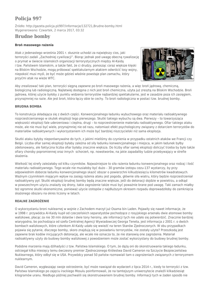 Policja 997 Źródło: http://gazeta.policja.pl/997/informacje/132721,Brudne-bomby.html Wygenerowano: Czwartek, 2 marca 2017, 03:32 Brudne bomby Broń masowego rażenia Atak z jedenastego września 2001 r. słusznie uchodzi za największy cios, jaki terroryści zadali „Zachodniej cywilizacji”. Biorąc jednak pod uwagę obecną rywalizację o prymat w świecie islamskich organizacji terrorystycznych między Al-Kaidą i tzw. Państwem Islamskim, a także fakt, że ci drudzy, ponosząc coraz większe klęski na Bliskim Wschodzie, mogą próbować spektakularnym atakiem odwrócić losy wojny, niepokoić musi myśl, że być może gdzieś właśnie powstaje plan zamachu, który przyćmi atak na wieże WTC. Aby zrealizować taki plan, terroryści sięgną zapewne po broń masowego rażenia, a więc broń jądrową, chemiczną, biologiczną lub radiologiczną. Najłatwiej dostępna z nich jest broń chemiczna, użyta już zresztą na Bliskim Wschodzie. Broń jądrowa, której użycie byłoby z punktu widzenia terrorystów najbardziej spektakularne, jest w zasadzie poza ich zasięgiem, przynajmniej na razie. Ale jest broń, która łączy obie te cechy. To broń radiologiczna w postaci tzw. brudnej bomby. BRUDNA BOMBA To konstrukcja składająca się z dwóch części. Konwencjonalnego ładunku wybuchowego oraz materiału radioaktywnego rozprzestrzenianego w skutek eksplozji tego pierwszego. Skutki takiego wybuchu są dwa. Pierwszy – to towarzysząca większości eksplozji fale uderzeniowa i cieplna, drugi – to rozprzestrzenienie materiału radioaktywnego. Ofiar takiego ataku może, ale nie musi być wiele, przynajmniej nie od razu, natomiast efekt psychologiczny związany z dotarciem terrorystów do materiałów radioaktywnych i wykorzystaniem ich może być bardziej niszczycielski niż sama eksplozja. Skutki ataku byłyby nieporównywalne do tych, z jakimi mieliśmy do czynienia w przypadku ostatnich ataków we Francji czy Belgii. Liczba ofiar samej eksplozji byłaby zależna od siły ładunku konwencjonalnego i miejsca, w jakim ładunek byłby zdetonowany, ale faktyczna liczba ofiar byłaby znacznie większa. Do liczby ofiar samej eksplozji doliczyć trzeba by było także ofiary choroby popromiennej oraz innych schorzeń, np. nowotworów, na jakie zapadaliby ludzie przebywający w strefie skażenia. Wielkość tej strefy zależałaby od kilku czynników. Najważniejsze to siła rażenia ładunku konwencjonalnego oraz rodzaj i ilość materiału radioaktywnego. Tego wcale nie musiałoby być dużo – 30 gramów izotopu cezu-137 wystarczy, by przy odpowiednim doborze ładunku konwencjonalnego skazić obszar o powierzchni kilkudziesięciu kilometrów kwadratowych. Ważnym czynnikiem mającym wpływ na zasięg rażenia ataku jest pogoda, głównie siła wiatru, który będzie rozprzestrzeniał radioaktywny pył. Skutki eksplozji brudnej bomby będą znaczne większe, jeśli do detonacji dojdzie w powietrzu, a odkąd w powszechnym użyciu znalazły się drony, takie zagrożenie także musi być poważnie brane pod uwagę. Taki zamach miałby też ogromne skutki ekonomiczne, ponieważ użycie izotopów z najdłuższym okresem rozpadu doprowadziłoby do zamknięcia skażonego obszaru na okres liczony w latach. REALNE ZAGROŻENIE O wykorzystaniu broni nuklearnej w wojnie z Zachodem marzył już Osama bin Laden. Pojawiły się nawet informacje, że w 1998 r. przywódca Al-Kaidy kupił od czeczeńskich separatystów pochodzące z rosyjskiego arsenału dwie atomowe bomby walizkowe, płacąc za nie 30 mln dolarów i dwie tony heroiny, ale informacji tych nie udało się potwierdzić. Znacznie bardziej wiarygodna, bo pochodząca od szefa Centralnej Agencji Wywiadowczej Georga Teneta, jest informacja z 2001 r. o dwóch bombach walizkowych, które członkom Al-Kaidy udało się wwieźć na teren Stanów Zjednoczonych. W obu przypadkach pojawia się pytanie, dlaczego bomby, skoro znajdują się w posiadaniu terrorystów, nie zostały użyte? Przeszkodą jest zapewne brak kodów inicjujących detonację, ale wcale nie oznacza to, że nie stanowią one zagrożenia. Materiał radioaktywny użyty do budowy bomby walizkowej z powodzeniem może zostać wykorzystany do budowy brudnej bomby. Podobne marzenia mają dżihadyści z tzw. Państwa Islamskiego. O tym, że dążą oni do skonstruowania takiego ładunku, ostrzegał kilka miesięcy temu ówczesny premier Zjednoczonego Królestwa David Cameron na Szczycie Bezpieczeństwa Nuklearnego, który odbył się w USA. Przywódcy ponad 50 państw rozmawiali tam o zagrożeniach związanych z terroryzmem nuklearnym. David Cameron, wygłaszając swoje ostrzeżenie, być może nawiązał do wydarzeń z lipca 2014 r., kiedy to terroryści z tzw. Państwa Islamskiego po zajęciu irackiego Mosulu poinformowali, że na tamtejszym uniwersytecie znaleźli kilkadziesiąt kilogramów uranu. Niedługo później pochwalili się skonstruowaniem brudnej bomby. Informacji tych w żaden sposób nie udało się potwierdzić, ale nie można wykluczyć scenariusza, że taką bombą dysponują, czekając na najlepszy moment do jej zdetonowania. Poważnie zagrożenie detonacją brudnej bomby potraktowano w trakcie przygotowań do organizacji olimpiady w Rio de Janeiro. Szef brazylijskich służb antyterrorystycznych jeszcze przed rozpoczęciem igrzysk informował, że biorąc pod uwagę informacje, którymi dysponuje, jest to „wiarygodna groźba”. Za pośrednictwem Międzynarodowej Agencji Energii Atomowej służby brazylijskie wyposażyły się w przenośne skanery i detektory wykrywające promieniowanie radioaktywne. Informacje o zagrożeniu brudną bombą pojawiają się także w Europie. Na przełomie lat 2004 i 2005 w Moguncji, Berlinie, Bonn i na terenie Bawarii dokonano serii zatrzymań. Wśród dwunastu aresztowanych fundamentalistów dwóch podejrzanych było o działania w celu zdobycia 48 gramów wzbogaconego uranu. Niedługo później, w październiku 2006 r., skaza