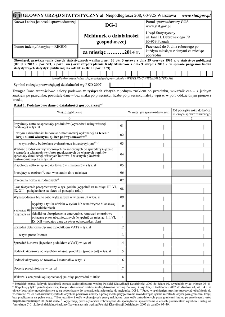 GŁÓWNY URZĄD STATYSTYCZNY al. Niepodległości 208, 00-925 Warszawa Nazwa i adres jednostki sprawozdawczej Portal sprawozdawczy GUS www.stat.gov.pl DG-1 Meldunek o działalności gospodarczej Numer indentyfikacyjny – REGON www.stat.gov.pl za miesiąc ……….2014 r. Urząd Statystyczny ul. Jana H. Dąbrowskiego 79 60-959 Poznań Przekazać do 5. dnia roboczego po każdym miesiącu z danymi za miesiąc poprzedni Obowiązek przekazywania danych statystycznych wynika z art. 30 pkt 3 ustawy z dnia 29 czerwca 1995 r. o statystyce publicznej (Dz. U. z 2012 r. poz. 591, z późn. zm.) oraz rozporządzenia Rady Ministrów z dnia 9 sierpnia 2013 r. w sprawie programu badań statystycznych statystyki publicznej na rok 2014 (Dz. U. poz. 1159). (e-mail sekretariatu jednostki sporządzającej sprawozdanie – WYPEŁNIAĆ WIELKIMI LITERAMI) Symbol rodzaju przeważającej działalności wg PKD 2007 Uwaga: Dane wartościowe należy podawać w tysiącach złotych z jednym znakiem po przecinku, wskaźnik cen – z jednym znakiem po przecinku, pozostałe dane – bez znaku po przecinku; liczbę po przecinku należy wpisać w polu oddzielonym pionową kreską. Dział 1. Podstawowe dane o działalności gospodarczeja) Wyszczególnienie W miesiącu sprawozdawczym 0 1 Przychody netto ze sprzedaży produktów (wyrobów i usług własnej produkcji) w tys. zł w tym z działalności budowlano-montażowej wykonanej na terenie kraju siłami własnymi, tj. bez podwykonawcówb) w tym roboty budowlane o charakterze inwestycyjnymb), c) 01 02 03 Wartość produktów wytworzonych niezaliczonych do sprzedaży (łącznie z wartością własnych wyrobów przekazanych do własnych punktów sprzedaży detalicznej, własnych hurtowni i własnych placówek gastronomicznych) w tys. zł 04 Przychody netto ze sprzedaży towarów i materiałów z tys. zł 05 Pracujący w osobachd), stan w ostatnim dniu miesiąca 06 Przeciętna liczba zatrudnionyche) 07 Czas faktycznie przepracowany w tys. godzin (wypełnić za miesiąc: III, VI, IX, XII – podając dane za okres od początku roku) 08 Wynagrodzenia brutto osób wykazanych w wierszu 07 w tys. zł 09 wypłaty z tytułu udziału w zysku lub w nadwyżce bilansowej w spółdzielniach 10 z wiersza 09 przypada na składki na ubezpieczenia emerytalne, rentowe i chorobowe opłacane przez ubezpieczonych (wypełnić za miesiąc: III, VI, IX, XII – podając dane za okres od początku roku) 11 Sprzedaż detaliczna (łącznie z podatkiem VAT) w tys. zł 12 w tym przez Internet 13 Sprzedaż hurtowa (łącznie z podatkiem z VAT) w tys. zł 14 Podatek akcyzowy od wyrobów własnej produkcji (producent) w tys. zł 15 Podatek akcyzowy od towarów i materiałów w tys. zł 16 Dotacje przedmiotowe w tys. zł 17 Wskaźnik cen produkcji sprzedanej (miesiąc poprzedni = 100)f) 18 a) Od początku roku do końca miesiąca sprawozdawczego 2 Przedsiębiorstwa, których działalność została zaklasyfikowana według Polskiej Klasyfikacji Działalności 2007 do działu 02, wypełniają tylko wiersze 06–11. Wypełniają tylko przedsiębiorstwa, których działalność została zaklasyfikowana według Polskiej Klasyfikacji Działalności 2007 do działów 41, 42 i 43; za okresy kwartalne przedsiębiorstwa te są zobowiązane do sporządzenia załącznika do meldunku DG-1. c) Przed wypełnieniem prosimy przeczytać objaśnienia do wiersza 02. d) Bez osób (uczniów) zatrudnionych na podstawie umowy o pracę w celu przygotowania zawodowego; łącznie za zatrudnionymi poza granicami kraju; bez przeliczania na pełne etaty. e) Bez uczniów i osób wykonujących pracę nakładczą oraz osób zatrudnionych poza granicami kraju; po przeliczeniu osób niepełnozatrudnionych na pełne etaty. f) Wypełniają przedsiębiorstwa zobowiązane do sporządzania sprawozdania o cenach producentów wyrobów i usług na formularzu C-01, których działalność zaklasyfikowana została według Polskiej Klasyfikacji Działalności 2007 do działów 05–39. b) Dział 2. Dane uzupełniające dla jednostek przemysłowycha) Uwaga: Przy opracowywaniu danych w wierszach 2, 4 i 7 należy uwzględnić aktualną listę krajów zaliczanych do strefy euro. Wyszczególnienie W miesiącu sprawozdawczym 0 Z przychodów netto ze sprzedaży produktów (wyrobów i usług własnej produkcji) – dział 1, wiersz 01 – przypada na sprzedaż na eksport i wywóz w tys. zł w tym do krajów strefy eurob) 1 Od początku roku do końca miesiąca sprawozdawczego 2 1 2 Z przychodów netto ze sprzedaży towarów i materiałów – dział 1, wiersz 05 – przypada na sprzedaż na eksport i wywóz w tys. zł w tym do krajów strefy eurob) 3 4 Nowe zamówienia otrzymane w tys. złc) 5 w tym na eksport i wywóz 6 w tym do krajów strefy eurob) 7 a) Wypełniają tylko przedsiębiorstwa, których działalność została zaklasyfikowana według Polskiej Klasyfikacji Działalności do sekcji: B, C, D i E. b) Do krajów strefy euro zalicza się: Austrię, Belgię, Finlandię, Francję, Grecję, Hiszpanię, Irlandię, Luksemburg, Niemcy, Niderlandy, Portugalię, Włochy, Cypr, Słowenię, Maltę, Słowację, Estonię, Łotwę. c) Wiersze 5, 6 i 7 wypełniają tylko przedsiębiorstwa, których działalność została zaklasyfikowana według Polskiej Klasyfikacji Działalności 2007 do działów: 13, 14, 17, 20, 21, 24, 25, 26, 27, 28, 29 i 30. Dział 3. Dane uzupełniające dla jednostek świadczących usługi transportowea) Uwaga: Dane należy podawać w liczbach bezwzględnych – bez znaku po przecinku Wyszczególnienie W miesiącu sprawozdawczym 0 1 b) Łączna ładowność taboru samochodowego – w tonach 1 Przewozy ładunków – w tonach 2 Przewozy pasażerów – w tys. pasażerów 3 w tym przewozy komunikacją miejską Od początku roku do końca miesiąca sprawozdawczego 2 4 komunikacją autobusową zamiejską a) Przed wypełnieniem prosimy przeczytać objaśnienia do działu 3. miesiąca sprawozdawczego; bez taksówek bagażowych. 5 b) Własnego 