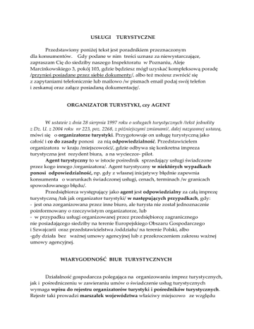 USŁUGI TURYSTYCZNE Przedstawiony poniżej tekst jest poradnikiem przeznaczonym dla konsumentów. Gdy podane w nim treści uznasz za niewystarczające, zapraszam Cię do siedziby naszego Inspektoratu w Poznaniu, Aleje Marcinkowskiego 3, pokój 103, gdzie będziesz mógł uzyskać kompleksową poradę /przynieś posiadane przez siebie dokumenty/, albo też możesz zwrócić się z zapytaniami telefonicznie lub mailowo /w pismach email podaj swój telefon i zeskanuj oraz załącz posiadaną dokumentację/. ORGANIZATOR TURYSTYKI, czy AGENT W ustawie z dnia 28 sierpnia 1997 roku o usługach turystycznych /tekst jednolity z Dz. U. z 2004 roku nr 223, poz. 2268, z późniejszymi zmianami/, dalej nazywanej ustawą, mówi się o organizatorze turystyki. Przygotowuje on usługę turystyczną jako całość i co do zasady ponosi za nią odpowiedzialność. Przedstawicielem organizatora w kraju /miejscowości/, gdzie odbywa się konkretna impreza turystyczna jest rezydent biura, a na wycieczce- pilot. Agent turystyczny to w istocie pośrednik sprzedający usługi świadczone przez kogo innego /organizatora/. Agent turystyczny w niektórych wypadkach ponosi odpowiedzialność, np. gdy z własnej inicjatywy błędnie zapewnia konsumenta o warunkach świadczonej usługi, cenach, terminach /w granicach spowodowanego błędu/. Przedsiębiorca występujący jako agent jest odpowiedzialny za całą imprezę turystyczną /tak jak organizator turystyki/ w następujących przypadkach, gdy: - jest ona zorganizowana przez inne biuro, ale turysta nie został jednoznacznie poinformowany o rzeczywistym organizatorze, lub - w przypadku usługi organizowanej przez przedsiębiorcę zagranicznego nie posiadającego siedziby na terenie Europejskiego Obszaru Gospodarczego i Szwajcarii oraz przedstawicielstwa /oddziału/ na terenie Polski, albo -gdy działa bez ważnej umowy agencyjnej lub z przekroczeniem zakresu ważnej umowy agencyjnej. WIARYGODNOŚĆ BIUR TURYSTYCZNYCH Działalność gospodarcza polegająca na organizowaniu imprez turystycznych, jak i pośredniczeniu w zawieraniu umów o świadczenie usług turystycznych wymaga wpisu do rejestru organizatorów turystyki i pośredników turystycznych. Rejestr taki prowadzi marszałek województwa właściwy miejscowo ze względu na siedzibę przedsiębiorcy polskiego albo siedzibę oddziału przedsiębiorcy zagranicznego. Inni przedsiębiorcy zagraniczni mający siedzibę i prowadzący działalność turystyczną jako organizator na terenie na terenie Unii Europejskiej, EFTA lub Szwajcarii, zamierzający organizować imprezy turystyczne na terenie Polski /nie posiada jednak siedziby, ani oddziału w Polsce/ wybierają marszałka województwa, u którego zgłaszają się do rejestru. Na stronie internetowej www.turystyka.crz.mg.gov.pl każdy ma możliwość sprawdzenia, czy konkretne biuro figuruje w wspomnianej wyżej Centralnej Ewidencji Organizatorów Turystyki i Pośredników Turystycznych /rejestr jawny/ oraz można odszukać podstawowe informacje o biurze, a także o przedsiębiorcach wykreślonych z rejestru i tych, u których stwierdzono prowadzenie działalności turystycznej bez wymaganego wpisu /również o przedsiębiorcach, co do których wszczęto i prowadzi się postępowanie o wykreślenie z rejestru/. Bardziej szczegółowych danych o przedsiębiorcach turystycznych można również poszukiwać w oddziale sportu i turystyki właściwego urzędu marszałkowskiego /np. w kwestii zawieszenia przez przedsiębiorcę działalności/, a nawet w Ministerstwie Sportu i Turystyki w Warszawie- www.msport.gov.pl Z uwagi na coraz powszechniejszy zwyczaj wystawiania komentarzy w Internecie, również zamieszczane są zdjęcia z różnych pobytów turystycznych, warto przed zawarciem umowy turystycznej przestudiować internetowe fora turystyczne, w tym stronę internetową Polskiej Izby Turystyki www.pit.org.pl /biura turystyczne nie mają obowiązku zrzeszania się w tej organizacji/. Na stronie internetowej Ministerstwa Sportu i Turystyki prowadzony jest także rejestr jawny Centralny Wykaz Obiektów Hotelarskich. BLOGI PODRÓŻNICZE Również dla osób samodzielnie organizujących wakacyjny wypoczynek jednym z wartościowych sposobów na zdobycie szczegółowych informacji o miejscu wyjazdu, noclegach, osobach, komunikacji, lokalach gastronomicznych, atrakcjach turystycznych, zwyczajach, itd. jest Internet. Przewodniki turystyczne nie mogą odpowiedzieć na wszystkie pytania i wątpliwości turystów. Internet jest użyteczny szczególnie w przypadku rejonów mniej znanych. Na blogach turystycznych można odszukać przede wszystkim praktyczne informacje. Autorzy blogów opisują na nich swoje osobiste przeżycia z wojaży dodając zdjęcia. Dołączane są rzeczywiste zdjęcia hoteli i pomieszczeń. KONTROLA BIUR TURYSTYCZNYCH Organami upoważnionymi do kontroli działalności gospodarczej prowadzonej przez przedsiębiorcę turystycznego w zakresie określonym w wyżej wymienionej ustawie są: Minister Sportu i Turystyki oraz marszałek województwa, a także w pewnym zakresie Inspekcja Handlowa /obiekty hotelarskie/, i inne organy w ramach posiadanych przez siebie kompetencji /Państwowa Inspekcja Sanitarna, Państwowa Straż Pożarna, administracja architektoniczno-budowlana i nadzór budowlany/. GWARANCJE dla TURYSTÓW Co zrobić, gdy biuro podróży nie zapewniło swoim klientom powrotu do kraju z imprezy turystycznej, albo nie zwróciło wpłat poniesionych przez klientów w razie braku świadczenia usługi w przypadku niewypłacalności biura? W takiej sytuacji właściwy miejscowo marszałek województwa jest uprawniony do występowania na rzecz poszkodowanych klientów w sprawach wypłaty środków z tytułu umowy gwarancji bankowej, umowy gwarancji ubezpieczeniowej lub umowy ubezpieczenia, na zasadach określonych w treści tych umów. Wymienione umowy mają charakter zabezpieczający. W ostatniej zmianie ustawy do usługach turystycznych wprowadzonej na