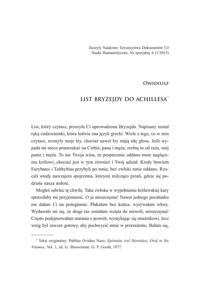 Zeszyty Naukowe Towarzystwa Doktorantów UJ Nauki Humanistyczne, Nr specjalny 6 (1/2015) Owidiusz LIST BRYZEJDY DO ACHILLESA 1 List, który czytasz, przesyła Ci uprowadzona Bryzejda. Napisany został ręką cudzoziemki, która ledwie zna język grecki. Wiele z tego, co w nim czytasz, rozmyły moje łzy, chociaż nawet łzy mają siłę głosu. Jeśli wypada mi nieco ponarzekać na Ciebie, pana i męża, zrobię to od razu, mój panie i mężu. To nie Twoja wina, że pospiesznie oddano mnie naglącemu królowi, chociaż jest w tym również i Twój udział. Kiedy bowiem Eurybates i Talthybius przybyli po mnie, bez zwłoki mnie oddano. Rzucali wtedy nawzajem spojrzenia, którymi milcząco pytali, gdzie się podziała nasza miłość. Mogłeś odwlec tę chwilę. Taka zwłoka w wypełnieniu królewskiej kary sprawiłaby mi przyjemność. O ja nieszczęsna! Nawet jednego pocałunku nie dałam Ci na pożegnanie. Płakałam bez końca, wyrywałam włosy. Wydawało mi się, że drugi raz zostałam wzięta do niewoli, nieszczęsna! Często podejmowałam starania o powrót, wymykając się strażnikowi, lecz wróg był zawsze gotowy, aby pochwycić mnie w przerażeniu. Bałam się, 1 Tekst oryginalny: Publius Ovidius Naso, Epistulae (vel Heroides), Ovid in Six Volumes, Vol. 1, ed. G. Showerman, G. P. Goold, 1977. 4 2 O w i di usz że choć ucieknę, zostanę pojmana w nocy i przeznaczona na służbę jednej z synowych Priama. Zostałam wydana, bo miałam być wydana; tyle nocy już tu spędziłam i nikt o mnie nie pyta. Zwlekasz, a gniew Twój nie przechodzi w czyny. Sam syn Menetiadesa [Patroklos], kiedy mnie zabrano, szeptał mi do ucha: „Dlaczego płaczesz? Wkrótce tu wrócisz”. Powiedzieć, że mnie nie zawróciłeś, to mało. Ty prawie walczysz, Achillesie, abym nie została ci oddana. Dalej, odzyskaj imię namiętnego kochanka! Przyszli do Ciebie syn Telamona [Ajas, brat Twój stryjeczny] i potomek Amyntora [Fojniks, Twój wychowawca], jeden złączony z Tobą więzami krwi, drugi stał się towarzyszem broni. Do tego przybył również syn Laertesa [Odyseusz], abym w ich towarzystwie wróciła. Do poruszających próśb dołączyli wspaniałe dary: dwadzieścia kotłów wykutych ze spiżu i siedem trójnogów o równym ciężarze i szlachetnym wykonaniu. Dodali jeszcze dwa razy po pięć talentów złota i dwa razy po sześć niezwyciężonych koni i jeszcze – co było zbyteczne – dziewczęta z wyspy Lesbos, obdarzone wyjątkową urodą, jako łupy po spalonej ich ojczyźnie. Razem z nimi jedną z trzech córek Agamemnona posłano ci jako żonę, chociaż nie potrzebujesz żony. Miałeś wykupić mnie od Agamemnona za cenę złota, jaką i tak musiałbyś zapłacić, a teraz odmawiasz mnie przyjąć? Co zawiniłam, że straciłam u Ciebie wartość, Achillesie? Gdzie zbiegła Twoja lekka miłość? Czy los przeciwny nieustannie musi prześladować nieszczęśliwych? Czy nie spełnią się już moje plany? Widziałam mury Lyrnessos [miasta mojego męża] zniszczone Twoim gniewem jak ofiara dla Marsa [bóstwa wojny], gdy byłam jeszcze ważną częścią mojej ojczyzny. Widziałam trzech zabitych młodzian, złączonych jednym pochodzeniem i jedną śmiercią, których jedna matka była i moją rodzicielką. Na ziemi skrwawionej widziałam pobitego męża [Menetesa] w całej jego okazałości, z którego piersi tryskała krew. L i s t Br y z e j dy d o A c h i l l e s a Po tych wszystkich straconych dobrach pozostałeś mi tylko Ty. Byłeś mi opiekunem, mężem, bratem. Przysięgałeś na bóstwo Twojej matki, nimfy wodnej [Tetys], że będzie lepiej, jak mnie zabierzesz ze sobą. Oczywiście, aby uczynić ze mnie brankę wojenną, lecz chyba tylko po to, abyś odrzucił ze mną bogactwa, które zostały Ci ofiarowane. Więcej, mówią, że kiedy zaświta Eos [bogini jutrzenki], poddasz żagle Notosowi [bóstwu wiatru południowego]. Kiedy ta straszna wiadomość dotarła do moich zatrwożonych uszu, krew i dar życia upłynęły razem z serca. Odpłyniesz, zbrodniarzu, i mnie nędzną opuścisz? Kto będzie pociechą w mojej samotności? Zapadnę się w rozwartą ziemię albo spłonę od spadającego pioruna, co niesie płomień, jeśli beze mnie morze spieni się pod wiosłami Ftyji [ojczyzny Twojej] i jako porzucona będę oglądać odpływające Twoje okręty! Jeśli postanowiłeś wracać do swoich, aby znowu zobaczyć ojczyźniane penaty [bóstwa domowe], nie będę zbędnym bagażem dla Twojej floty. Pójdę za zwycięzcą jako niewolnica, a nie jako żona za małżonkiem: potrafię pracować, mam ręce zdolne do przędzenia wełny. Najpiękniejsza z matron achajskich wejdzie jako oblubienica w Twoje małżeńskie łoże, synowa godna teścia [Peleusa], który jest wnukiem Jowisza i nimfy Ajginy, a stary Nereus [dziadek Twój] będzie zadowolony z takiego potomstwa. Jako pokorna Twoja służebnica, wypełnię zadanie, które mi polecisz: snująca się nić wyczerpie pełne wrzeciono i tak upłynie czas. Proszę jedynie, aby Twoja żona mną nie gardziła: przypuszczam, że nie będzie mi przychylna. Nie pozwól, aby mi rwano włosy w obecności wszystkich. Dorzuć wtedy cichym głosem: „Ta też jest moja”. Jednak przyjmę i to, żebym tylko nie była porzucona z hańbą; lęk przed tym rozdziera mnie od wewnątrz. Na co więc czekasz? Agamemnon żałuje swej złości, a udręczona Grecja stoi u stóp Twoich. Pokonaj uczucia i gniew swój, Ty, co wszystko 43 4 4O w i di usz zwyciężasz! Czy niezmordowany Hektor ma stratować dorobek Danajów [Greków]? Załóż zbroję, potomku Ajakosa, lecz najpierw weź mnie i z siłą Marsa pomieszaj szyki walczących. Twój gniew powstał z mojej przyczyny, niech przeze mnie się skończy. Niech będę początkiem i końcem Twego smutku. Nie wstydź się spełnić moje prośby. Przecież i syn Oneusa [Meleager] stanął naprzeciw nieprzyjacielskiego wojska na prośbę żony [Kleopatry]. Rzecz została mi opowiedziana, ale i Tobie j