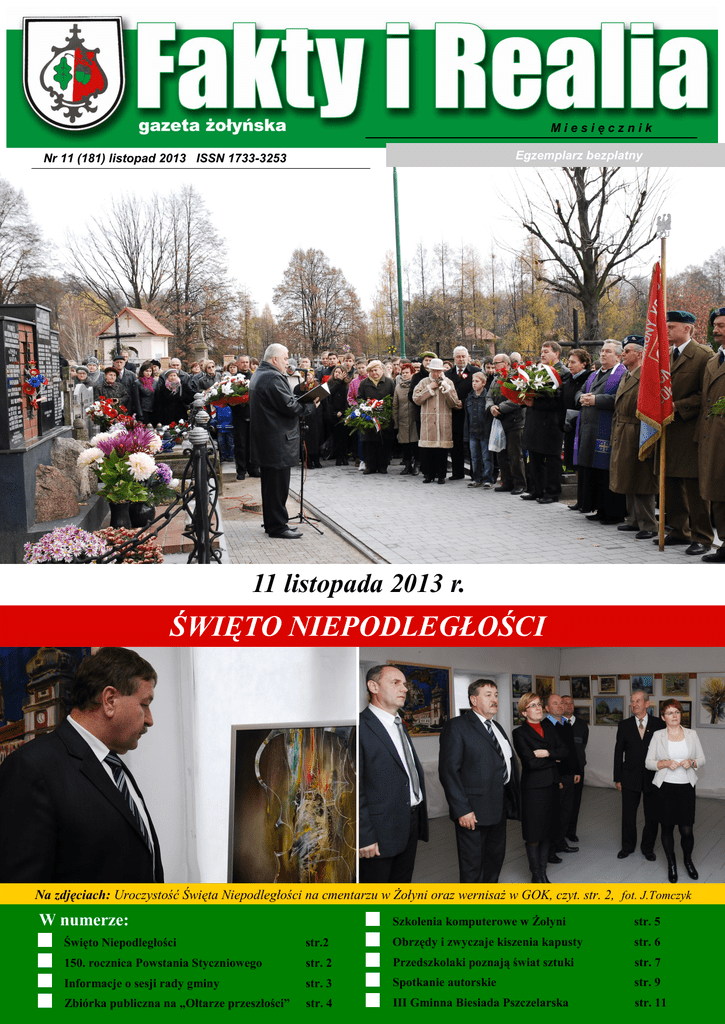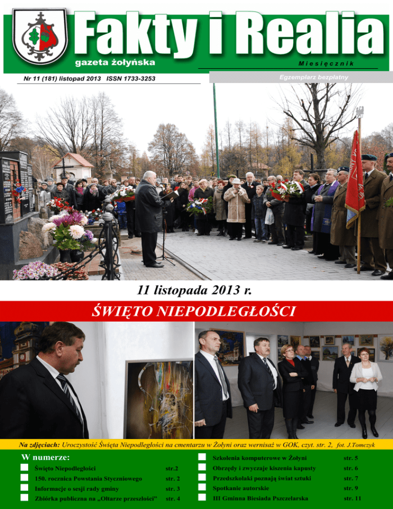 Fakty i Realia - gazeta żołyńska o Miesięcznik Egzemplarz bezpłatny Nr 11 (181) listopad 2013 ISSN 1733-3253 11 listopada 2013 r. ŚWIĘTO NIEPODLEGŁOŚCI Na zdjęciach: Uroczystość Święta Niepodległości na cmentarzu w Żołyni oraz wernisaż w GOK, czyt. str. 2, fot. J.Tomczyk W numerze: Szkolenia komputerowe w Żołyni str. 5 str. 6 Święto Niepodległości str.2 Obrzędy i zwyczaje kiszenia kapusty 150. rocznica Powstania Styczniowego str. 2 Informacje o sesji rady gminy str. 3 Przedszkolaki poznają świat sztuki str. 7 Nr 11 (181) listopad 2013 Spotkanie autorskie str. 9 Zbiórka publiczna na „Ołtarze przeszłości” str. 4 III Gminna Biesiada Pszczelarska str. 11 2 Fakty i Realia - gazeta żołyńska Sprawy gminy Święto Niepodległości T egoroczne obchody Święta Niepodległości w Żołyni miały szczególnie bogaty program. Zgromadzeni na rynku przedstawiciele władz, poczty sztandarowe, nauczyciele i młodzież otrzymali kotyliony, przygotowane przez uczniów Zespołu Szkół im. A. Mickiewicza. Żołyńska orkiestra dęta poprowadziła pochód najpierw pod pomnik ofiar wojny, gdzie złożono wieńce i zapalono znicze. Kwiaty złożono również pod tablicą upamiętniającą żołyńskich działaczy ruchu ludowego, znajdującą się na budynku Gminnej Biblioteki Publicznej. Dźwięki orkiestry wzbogaciły oprawę Mszy św. w intencji ojczyzny. Następnie w kościele parafialnym odbył się koncert o tematyce patriotycznej, w którym oprócz orkiestry wystąpił zespół „Dolany” działający przy Szkole Podstawowej nr 2. Kolejnym punktem obchodów 95 rocznicy odzyskania niepodległości było krótkie nabożeństwo modlitewne i złożenie kwiatów pod pomnikiem na żołyńskim cmentarzu. Artystycznym ak- centem na zakończenie obchodów było otwarcie wystawy poplenerowej XV Międzynarodowego Pleneru Malarsko-Rzeźbiarskiego „Łańcut 2013”, które odbyło się w Domu Kultury. Podtrzymywanie pięknej tradycji świętowania odzyskania przez Pol- fot. J.Tomczyk 150. rocznica Powstania Styczniowego Powstanie Styczniowe, którego 150. rocznicę obchodzimy w tym roku, to jedno z najbardziej dramatycznych i ważnych wydarzeń w historii Polski. Walka prowadzona była w skrajnie trudnych warunkach, a jej uczestnicy dali świadectwo wielkiej narodowej determinacji w dążeniu do odbudowania własnego, suwerennego państwa polskiego. Na kartach tej historii chlubnie zapisali się również mieszkańcy żołyńskiej ziemi, których przy okazji Święta Niepodległości przypominamy. Powstanie Styczniowe skierowane przeciwko rosyjskiemu zaborcy wybuchło 22 stycznia 1863 r. w Królestwie Polskim. Na pomoc powstańcom wyruszyły również oddziały z Galicji, w tym z regionu łańcuckiego, leżącego blisko granicy z Królestwem. Przez lasy okolic Żołyni wiosną 1863 r. przechodziły pododdziały organizowane przez generała Antoniego Jeziorańskiego, generała Aleksandra Waligórskiego, pułkowNr 11 (181) listopad 2013 skę niepodległości jest ważnym działaniem na rzecz kształtowania dobrze pojętego patriotyzmu, a dawanie przykładu zwłaszcza młodym pokoleniom na pewno zaowocuje w przyszłości. Serdecznie dziękuję wszystkim organizacjom, instytucjom oraz osobom prywatnym, którzy przyczynili się do przygotowania i sprawnego przeprowadzenia uroczystości. Andrzej Benedyk Wójt Gminy Żołynia nika Leona Czachowskiego i Jana Żalplachtę. Według informacji z książki Zbigniewa Trześniowskiego „W zakamarkach łańcuckiej okolicy” generał Antoni Jeziorański 24 kwietnia 1863 r. wyprowadził swych ludzi z Żurawiczek k. Przeworska i skierował pod Żołynię, gdzie skompletował swój oddział. Stąd, 25 kwietnia, poprowadził już 740 ludzi. W Żołyni propagatorem konieczności włączenia się w walki po- wstańcze był ks. proboszcz Paweł Sokalski. Jego plebania stanowiła punkt kontaktowy dla emisariuszy powstańczych. W niej zatrzymywali się oficerowie podążający do obozów ćwiczebnych. W zabudowaniach folwarku plebańskiego ochotnicy wyczekiwali na doprowadzenie do powstańczych szeregów. Mistrz szewski Gabriel Kuźniarski, późniejszy burmistrz Żołyni, mobilizował do wojsk powstańczych miejscową i przyjezdną młodzież rzemieślniczą. Mieszczanie i chłopi z Żołyni wsi chętnie zaopatrywali organizujące się oddziały ochotników. Pamiątki tamtego okresu to dwie kapliczki znajdujące się we wschodniej części dawnego miasteczka Żołyni. Według podań, w murowanej kapliczce Świętej Trójcy, znajdującej się u zbiegu ul. Mickiewicza i tzw. ul.Sokołowskiej, gro- Fakty i Realia - gazeta żołyńska madzono broń, przez jakiś czas mieściła się tu również poczta polowa. Przy drugiej z kapliczek, drewnianej, poświęconej Matce Boskiej Częstochowskiej, znajdującej przy tzw. ul. Sokołowskiej, gromadzili się powstańcy i stąd wyruszali do miejsc formowania oddziałów. Dzięki opracowaniu nauczycielki Agaty Cisek „Udział żołyniaków w powstaniu styczniowym” możemy poznać część nazwisk powstańców, pochodzących z terenu dzisiejszej Gminy Żołynia. Z niego dowiadujemy się, że do oddziału organizowanego w Krakowie zaciągnął się Józef Jędrzejowski z Żołyni. Z Brzózy Stadnickiej w powstaniu udział wzięli: Franciszek Babiarz i Ludwik Naróg, który przeszedł zesłanie syberyjskie. Z Bikówki udział wzięli bracia Piechutowie ( nieznanych imion ), z Zakącia - Antoni Jagusztyn, Wincenty Niemiec, ( nieznanych imion ) Filip i Gołąb - rolnicy, którzy odbyli syberyjską katorgę, z Kopani – Paweł Burda, z Żołyni – Franciszek Drzewicki, Tomasz Kuźniarski, Dominik Dec, Paweł Decowski, Dominik Krzyżak, Walenty Fleszar i Tomasz Skoczylas. Po powstaniu osiadł w Żołyni ochotnik ze Śląska Cieszyńskiego – Gustaw Firla, żołyński organista. Waldemar Natoński Na zdjęciu obok: W 50-tą rocznicę powstania na żołyńskim cmentarzu upamiętniono jego bohaterów. Informacje o