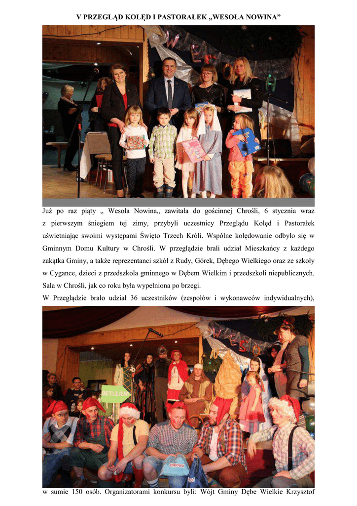 V PRZEGLĄD KOLĘD I PASTORAŁEK „WESOŁA NOWINA” Już po raz piąty „ Wesoła Nowina„ zawitała do gościnnej Chrośli, 6 stycznia wraz z pierwszym śniegiem tej zimy, przybyli uczestnicy Przeglądu Kolęd i Pastorałek uświetniając swoimi występami Święto Trzech Króli. Wspólne kolędowanie odbyło się w Gminnym Domu Kultury w Chrośli. W przeglądzie brali udział Mieszkańcy z każdego zakątka Gminy, a także reprezentanci szkół z Rudy, Górek, Dębego Wielkiego oraz ze szkoły w Cygance, dzieci z przedszkola gminnego w Dębem Wielkim i przedszkoli niepublicznych. Sala w Chrośli, jak co roku była wypełniona po brzegi. W Przeglądzie brało udział 36 uczestników (zespołów i wykonawców indywidualnych), w sumie 150 osób. Organizatorami konkursu byli: Wójt Gminy Dębe Wielkie Krzysztof Kalinowski, Zarząd Domu Kultury w Chrośli, Radne Renata Karpińska i Elżbieta Bober oraz Katarzyna Rek. Już po raz kolejny spotkanie poprowadziła Oliwia Karpińska. Witając gości, Renata Karpińska w imieniu Organizatorów podziękowała licznie przybyłej publiczności oraz wykonawcom, skierowała specjalne podziękowania do jury, za podjęcie sie trudnego zadania oceny zawsze bardzo dobrze przygotowanych uczestników przeglądu. Zaprosiła do wspólnego kolędowania, zaznaczając, że Święto Trzech Króli jest czasem wybaczania, ciepła i spokoju, ale przede wszystkim radości życząc takiej atmosfery publiczności i uczestnikom przeglądu. Jury w składzie: Pani Danuta Piotrowicz pełniąca obowiązki Dyrektora Szkoły Podstawowej w Cygance, Pani Olga Laskowska Wicedyrektor Zespołu Szkół w Dębem Wielkim, Pani Agnieszka Wojda Wicedyrektor Szkoły Podstawowej w Dębem Wielkim, Pani Zofia Ruta ze stowarzyszenia „Wrzosowianie” przyznało nagrody w czterech kategoriach: PRZEDSZKOLA I KLASY„O” : Wyróżnienia: Zespół „ Motylki” z Niepublicznego Przedszkola U Cioci Ewy Miejsce 3:ex aequo Zespół „ Krasnale” i „ Biedronki” z Niepublicznego Przedszkola U cioci Ewy Miejsce 2: „ Nutki Re” z przedszkola DO RE MI Miejsce 1: Maja Demianiuk z Niepublicznego Przedszkola U cioci Ewy KLASY I-III Wyróżnienia: Maja Górska ze Szkoły Podstawowej w Rudzie Miejsce 3:ex aequo Zuzanna Kuźmierska i Piotr Nowak Miejsce 2: Jagoda Komorowska Miejsce 1: Izabela Rebczewska KLASY IV – VI Wyróżnienia: Natalia Maciążek, Małgorzata Krzyżewska i Edyta Mazaj „Wesołe Nutki” – Szkoła podstawowa w Dębem Wielkim Miejsce 3: Sidney Vivarelli Miejsce2:ex aequo Chór ze Szkoły Podstawowej w Dębem Wielkim, Wojtek Nowak i Nina Wieczorek, Zyta Kocak Miejsce 1: Małgorzata Puła i Aleksandra Chałupka GIMNAZJA, DOROSLI I GRUPY MIESZANE: Wyróżnienia: Katarzyna Mazurowska, Uczniowie z Gimnazjum w Dębem Wielkim Miejsce 3: Weronika Grzędka Miejsce 2:ex aequo - Grupa mieszana z Przedszkola U Cioci Ewy, Kacper Mróz miejsce 1:ex aequo - Grupa mieszana z przedszkola DO RE MI, Julia Kalinowska i Klaudia Karpińska Trzy pierwsze miejsca w każdej kategorii zostały nagrodzone tradycyjnie statuetką grającego anioła. Zostały przyznane trzy specjalne wyróżnienia od organizatorów: Dla Kacpra Mroza z Gimnazjum w Dębem Wielkim za oryginalny dobór utworu oraz nowatorski styl wykonania. Dla przedszkola „ DO RE MI” - za pomysłowość, piękne bajkowe stroje, odwagę rodziców dużą dawkę radości i dobrej zabawy . Dla Zyty Kocak za piękną i wzruszającą interpretacje utworu. Dla Piotra Nowaka za przebojowość i ujmującą optymistyczną osobowość. Jak co roku zostały przyznane nagrody książkowe za najlepszy strój kolędnika, nagrody otrzymali: - dzieci i rodzice z przedszkola DO RE MI z Chrośli - dzieci z Przedszkola „U Cioci Ewy” - dzieci z przedszkola w Górkach Jury miało trudne zadanie by wyłonić laureatów wśród tylu wspaniałych wykonawców, występy uczestników na wysokim poziomie, dlatego pierwszy raz od pięciu lat zostały przyznane nagrody ex aequo. W czasie Przeglądu były prowadzone warsztaty plastyczne, prace wykonane przez dzieci będą zaprezentowane w gminnej galerii. Z roku na rok uczestnicy rozszerzają swój repertuar kolęd i pastorałek, co bardzo cieszy organizatorów, ponieważ publiczność może wysłuchać, co raz to nowych utworów, często zapomnianych. Zarówno dzieci, jak i dorośli zaprezentowali się w pięknych przebraniach kolędników. W trakcie obrad Jury wystąpili: Panie ze stowarzyszenia „Wrzosowianie” oraz młodzież gimnazjalna, która zaprosiła publiczność do wspólnego śpiewania kolęd. Wójt Krzysztof Kalinowski w imieniu organizatorów wręczył „Wrzosowinkom” ludowego anioła autorstwa pani Katarzyny Rek dziękując za uświetnianie swoimi występami „Wesołej Nowiny „ oraz za działalność na rzecz gminy Dębe Wielkie. O poczęstunek dla uczestników przeglądu kolęd zadbały panie ze stowarzyszenia „Wrzosowianie” oraz pani sołtys Chrośli, za co organizatorzy pięknie dziękują. Dziękujemy serdecznie wszystkim za pomoc finansową i organizacyjną w V Przeglądzie Kolęd i Pastorałek: Krzysztofowi Górnik, Zdzisławowi Rek, Bożenie Kuszpit, Oliwii Karpińskiej, Januszowi Karpińskiemu, Grzegorzowi Ruta za udostępnienie nagłośnienia oraz wszystkim, którzy przyczynili się do pomocy w organizacji V Przeglądu Kolęd i Pastorałek „Wesoła Nowina”. Zapraszamy serdecznie już za rok z Wesołą Nowiną! WIĘCEJ ZDJĘĆ W GALERII