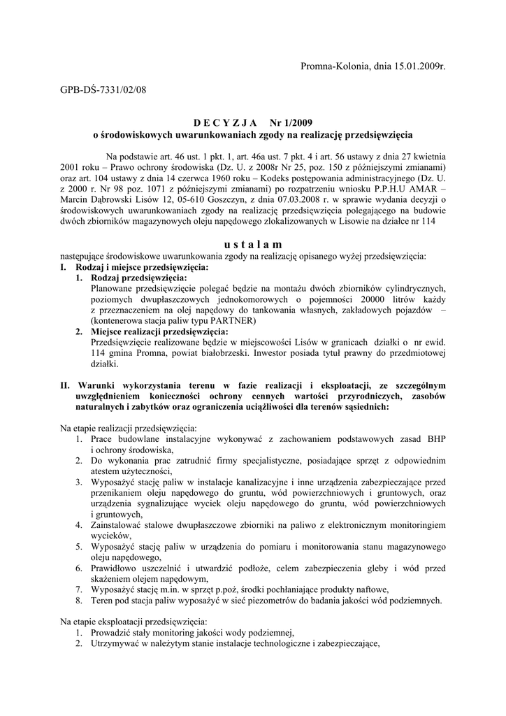 Promna-Kolonia, dnia 15.01.2009r. GPB-DŚ-7331/02/08 D E C Y Z J A Nr 1/2009 o środowiskowych uwarunkowaniach zgody na realizację przedsięwzięcia Na podstawie art. 46 ust. 1 pkt. 1, art. 46a ust. 7 pkt. 4 i art. 56 ustawy z dnia 27 kwietnia 2001 roku – Prawo ochrony środowiska (Dz. U. z 2008r Nr 25, poz. 150 z późniejszymi zmianami) oraz art. 104 ustawy z dnia 14 czerwca 1960 roku – Kodeks postępowania administracyjnego (Dz. U. z 2000 r. Nr 98 poz. 1071 z późniejszymi zmianami) po rozpatrzeniu wniosku P.P.H.U AMAR – Marcin Dąbrowski Lisów 12, 05-610 Goszczyn, z dnia 07.03.2008 r. w sprawie wydania decyzji o środowiskowych uwarunkowaniach zgody na realizację przedsięwzięcia polegającego na budowie dwóch zbiorników magazynowych oleju napędowego zlokalizowanych w Lisowie na działce nr 114 ustalam następujące środowiskowe uwarunkowania zgody na realizację opisanego wyżej przedsięwzięcia: I. Rodzaj i miejsce przedsięwzięcia: 1. Rodzaj przedsięwzięcia: Planowane przedsięwzięcie polegać będzie na montażu dwóch zbiorników cylindrycznych, poziomych dwupłaszczowych jednokomorowych o pojemności 20000 litrów każdy z przeznaczeniem na olej napędowy do tankowania własnych, zakładowych pojazdów – (kontenerowa stacja paliw typu PARTNER) 2. Miejsce realizacji przedsięwzięcia: Przedsięwzięcie realizowane będzie w miejscowości Lisów w granicach działki o nr ewid. 114 gmina Promna, powiat białobrzeski. Inwestor posiada tytuł prawny do przedmiotowej działki. II. Warunki wykorzystania terenu w fazie realizacji i eksploatacji, ze szczególnym uwzględnieniem konieczności ochrony cennych wartości przyrodniczych, zasobów naturalnych i zabytków oraz ograniczenia uciążliwości dla terenów sąsiednich: Na etapie realizacji przedsięwzięcia: 1. Prace budowlane instalacyjne wykonywać z zachowaniem podstawowych zasad BHP i ochrony środowiska, 2. Do wykonania prac zatrudnić firmy specjalistyczne, posiadające sprzęt z odpowiednim atestem użyteczności, 3. Wyposażyć stację paliw w instalacje kanalizacyjne i inne urządzenia zabezpieczające przed przenikaniem oleju napędowego do gruntu, wód powierzchniowych i gruntowych, oraz urządzenia sygnalizujące wyciek oleju napędowego do gruntu, wód powierzchniowych i gruntowych, 4. Zainstalować stalowe dwupłaszczowe zbiorniki na paliwo z elektronicznym monitoringiem wycieków, 5. Wyposażyć stację paliw w urządzenia do pomiaru i monitorowania stanu magazynowego oleju napędowego, 6. Prawidłowo uszczelnić i utwardzić podłoże, celem zabezpieczenia gleby i wód przed skażeniem olejem napędowym, 7. Wyposażyć stację m.in. w sprzęt p.poż, środki pochłaniające produkty naftowe, 8. Teren pod stacja paliw wyposażyć w sieć piezometrów do badania jakości wód podziemnych. Na etapie eksploatacji przedsięwzięcia: 1. Prowadzić stały monitoring jakości wody podziemnej, 2. Utrzymywać w należytym stanie instalacje technologiczne i zabezpieczające, 3. Na bieżąco kontrolować szczelność zbiorników i dystrybutora, 4. Na bieżąco kontrolować czystość ( np. usuwać plamy z rozlanego paliwa), 5. Zabezpieczać przed przenikaniem oleju napędowego do gruntu, wód powierzchniowych i podziemnych, 6. Zabezpieczać przed emisją par z oleju napędowego do powietrza atmosferycznego w procesach ich przeładunku i magazynowania, 7. Prowadzić prawidłową gospodarkę ściekami zgodnie z Prawem wodnym. III. Wymagania dotyczące ochrony środowiska konieczne do uwzględnienia w projekcie budowlanym: 1. Ewentualne szkodliwe oddziaływanie na środowisko nie może przekroczyć granic terenu, do którego inwestor posiada lub będzie posiadał tytuł prawny, na etapie budowy, eksploatacji i likwidacji. 2. Należy prowadzić racjonalną gospodarkę odpadami na terenie przedsięwzięcia w fazie budowy, eksploatacji i likwidacji zgodnie z obowiązującymi przepisami ustawy o odpadach. 3. Odpady niebezpieczne i inne niż niebezpieczne winny być segregowane i usuwane przez specjalistyczne jednostki zajmujące się ich składowaniem lub utylizacją na zasadach określonych w obowiązujących przepisach. 4. Inwestor przy prowadzeniu prac budowlanych jest obowiązany uwzględnić ochronę środowiska na obszarze prowadzenia prac, a w szczególności ochronę zieleni, naturalnego ukształtowania terenu i stosunków wodnych. IV. Wymogi w zakresie przeciwdziałania skutkom awarii przemysłowych: Podczas eksploatacji obiektu nie przewiduje się poważnych awarii przemysłowych. W przypadku niekontrolowanego wycieku paliwa należy na bieżąco usuwać jego skutki niedopuszczając do przedostania się szkodliwych czynników do środowiska. V. Wymogi w zakresie ograniczenia transgranicznego oddziaływania na środowisko: Nie stwierdzono transgranicznego oddziaływania planowanego przedsięwzięcia środowisko. VI. na Wymogi w sprawie stwierdzenia konieczności utworzenia obszaru ograniczonego użytkowania: Planowana inwestycja nie należy do przedsięwzięć wymienionych w art. 135 ust. 1 ustawy z dnia 27 kwietnia 2001 roku – Prawo ochrony środowiska (Dz. U. z 2008r Nr 25, poz. 150 późn. zm.) wymagających utworzenia obszaru ograniczonego użytkowania. VII. Dodatkowe obowiązki nakładane na inwestora: 1. Przedłożyć Staroście Białobrzeskiemu aktualną Informację o odpadach. 2. Przedłożyć Staroście Białobrzeskiemu aktualne Zgłoszenie instalacji na podstawie art. 152 ustawy Prawo ochrony środowiska. UZASADNIENIE 1. Wnioskiem z dnia 04.04.2008 r. P.P.H.U. AMAR – Marcin Dąbrowski Lisów 12, 05-610 Goszczyn, zwrócił się o wydanie decyzji o środowiskowych uwarunkowaniach zgody na realizację przedsięwzięcia, polegającego na budowie dwóch zbiorników magazynowych oleju napędowego zlokalizowanych w Lisowie na działce nr 114. 2. W związku z tym, że planowane przedsięwzięcie należy do przedsięwzięć , o których mowa w art. 51 ust. 1 pkt. 2 ustawy Prawo ochrony środowiska (m