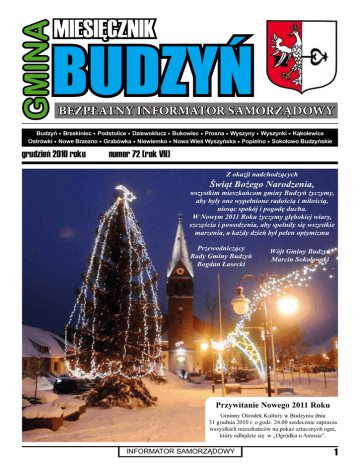 GMINA MIESIĘCZNIK BUDZYŃ BEZPŁATNY INFORMATOR SAMORZĄDOWY Budzyń • Brzekiniec • Podstolice • Dziewoklucz • Bukowiec • Prosna • Wyszyny • Wyszynki • Kąkolewice Ostrówki • Nowe Brzezno • Grabówka • Niewiemko • Nowa Wieś Wyszyńska • Popielno • Sokołowo Budzyńskie grudzień 2010 roku numer 72 (rok VII) Z okazji nadchodzących Świąt Bożego Narodzenia, wszystkim mieszkańcom gminy Budzyń życzymy, aby były one wypełnione radością i miłością, niosąc spokój i pogodę ducha. W Nowym 2011 Roku życzymy głębokiej wiary, szczęścia i powodzenia, aby spełniły się wszystkie marzenia, a każdy dzień był pełen optymizmu Przewodniczący Rady Gminy Budzyń Bogdan Łasecki Wójt Gminy Budzyń Marcin Sokołowski Przywitanie Nowego 2011 Roku Gminny Ośrodek Kultury w Budzyniu dnia 31 grudnia 2010 r. o godz. 24.00 serdecznie zaprasza wszystkich mieszkańców na pokaz sztucznych ogni, który odbędzie się w „Ogródku u Antosia”. INFORMATOR SAMORZĄDOWY 1 NASZA GMINA Rozpoczęła się nowa kadencja Pierwsza sesja Rady Gminy Budzyń Pierwszą sesję Rady Gminy zwołano na dzień 2 grudnia 2010 roku. Wzięło w niej udział wszystkich 15 radnych nowej kadencji, reprezentujących wszystkie okręgi wyborcze na terenie naszej gminy Sesję otworzył najstarszy wiekiem radny, radny senior p. Tadeusz Grochowalski, który przedstawił porządek obrad pierwszej sesji czwartej kadencji. Pierwsza sesja poświęcona była przede wszystkim dokonaniu wyborów: przewodniczącego Rady Gminy, dwóch wiceprzewodniczących Rady Gminy, wyboru przewodniczącego komisji rewizyjnej, oraz dokonaniu wyboru składów osobowych komisji stałych Rady Gminy. W wyniku tajnego głosowania przewodniczącym Rady Gminy został pan Bogdan Łasecki – uzyskał 14 głosów „za”, 1 głos przeciwny. Po wyborze przewodnią- cego Rady Gminy przejął on od radnego seniora obwiązki przewodniczenia dalszej części obrad. Wybrano także dwóch wiceprzewodniczących - p. Zenon Nowicki otrzymał 15 głosów, p. Tadeusz Grochowalski – 14 głosów. Na przewodniczącego komisji rewizyjnej został wybrany p. Marian Bedyński, otrzymał 11 głosów popierających w głosowaniu jawnym. Wybrane zostały także stałe komisje Rady Gminy: Komisja Rozwoju Gospodarczego i Finansów: Józef Kasperczak - przewodniczący Wacław Pasch - z-ca przewodniczącego Sławomir Binert - członek Paweł Brychczyński - członek Kinga Buszkiewicz - członek Kazimierz Cembrowicz - członek Józef Depta - członek Zbigniew Dumke - członek Tadeusz Grochowalski - członek Przysięga Wójta W dniu 6 grudnia 2010 r. o godz. 17.00 w sali obrad Gminnego Ośrodka Kultury odbyła się II sesja Rady Gminy Budzyń. Sesja odbyła się według ustalone- go wcześniej proponowanego porządku obrad. Na tej sesji najważniejszym punktem było złożenie ślubowania przez Wójta Gminy Budzyń. Zenon Nowicki - członek Wojciech Szejner - członek Komisja Statutowo-Samorządowa, Prawa i Porządku Publicznego: Zbigniew Dumke - przewodniczący Zenon Nowicki - z-ca przewodniczącego Marian Bedyński - członek Sławomir Binert - członek Honorata Struzik - członek Komisja Zdrowia, Oświaty, Spraw Socjalnych, Sportu i Turystyki: Kazimierz Cembrowicz - przewodniczący Kinga Buszkiewicz - z-ca przewodniczącego Józef Depta - członek Tadeusz Grochowalski - członek Izabela Jenczyk - członek Józef Kasperczak - członek Honorata Struzik - członek Komisja Rewizyjna: Marian Bedyński - przewodniczący Wacław Pasch - z-ca przewodniczącego Paweł Brychczyński - członek Izabela Jenczyk - członek Wojciech Szejner- członek Na zakończenie Zastępca Wójta Gminy Budzyń p. Bogusław Gniła przedstawił raport o stanie Gminy Budzyń (wybrane fragmenty tego raportu publikujemy w tym wydaniu Informatora). W Radzie praca wrze Tuż po uroczystym ślubowaniu nowowybrani radni podjęli intensywne prace w komisjach. W dniu 14 i 21 grudnia obradowała komisja rozwoju gospodarczego oraz komisja statutowo samorządowa, natomiast w dniu 15 i 16 grudnia komisja oświaty z komisją rewizyjną. W czasie obrad komisji radni pracowali nad projektem budżetu na 2011 rok. Prace nad budżetem zakończa się na poczatku 2011 roku, kiedy to Rada Gminy na sesji podejmie uchwałę budżetową na 2011 rok. Ochotnicza Straż Pożarna Rozliczenie i życzenia Zarząd Ochotniczej Strazy Pożarnej w Budzyniu informuje miszkańcóe Budzynia, że za rozprowadzane przez druhów wśród mieszkańców Budzynia kalendarze strażackie zebraliśmy 5 tysięcy 800 złotych. Zebrane w ten sposób środki finansowe zostana przeznaczone na cele statutowe OSP. Dziekując za zaufanie w 2010 roku pragniemy złożyć życzenia ciepłych, pełnych miłości i zrozumienia Świąt Bożego Narodzenia oraz szczęścia, zdrowia i samych sukcesów w Nowym 2011 Roku Zarząd Ochotniczej Straży Pożarnej w Budzyniu 2 INFORMATOR SAMORZĄDOWY NASZA GMINA Raport o stanie Gminy Budzyń (fragmenty wystąpienia Bogusława Gniły na Sesji Rady Gminy) Gmina Budzyn jest jedną z 5 gmin powiatu chodzieskiego i jest typową wielkopolską gminą przekształcającą się w gminę przemysłowo – rolniczą. Ogólna powierzchnia Gminy wynosi 20.830 ha, z czego na: - użytki rolne przypada 12.376 ha - lasy i grunty leśne 7.608 ha - wody i rowy – 39 ha - pozostałe grunty – 807 ha Obecnie w gminie zamieszkuje 8.466 osób, w tym pełnoletnich – 6.573 osoby. W skład Gminy wchodzi 16 wsi, w tym 13 wsi sołeckich. W celu wykonania zadań Gminy utworzone zostały jednostki organizacyjne Gminy. Są to: Jednostki budżetowe nie posiadająceosobowości prawnej, tj.: - Urząd Gminy Budzyń – kierownik Wójt Gminy - Gminny Ośrodek Pomocy Społecznej w Budzyniu – kierownik p. Magdalena Gokiert – Kabat - Dzienny Dom Pomocy Społecznej w Budzyniu – kierownik p. Edyta Radwańska - Gminny Zakład Oświaty – kierownik p. Elżbieta Kapała - Gimnazjum im. Powstańców Wielkopolskich w Budzyniu – d
