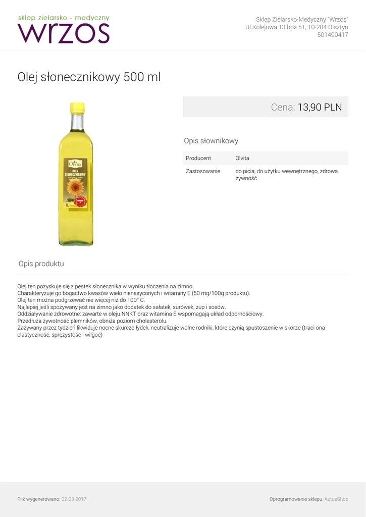 Sklep Zielarsko-Medyczny "Wrzos" Ul.Kolejowa 13 box 51, 10-284 Olsztyn 501490417 Olej słonecznikowy 500 ml Cena: 13,90 PLN Opis słownikowy Producent Olvita Zastosowanie do picia, do użytku wewnętrznego, zdrowa żywność Opis produktu Olej ten pozyskuje się z pestek słonecznika w wyniku tłoczenia na zimno. Charakteryzuje go bogactwo kwasów wielo nienasyconych i witaminy E (50 mg/100g produktu). Olej ten można podgrzewać nie więcej niż do 100° C. Najlepiej jeśli spożywany jest na zimno jako dodatek do sałatek, surówek, zup i sosów. Oddziaływanie zdrowotne: zawarte w oleju NNKT oraz witamina E wspomagają układ odpornościowy. Przedłuża żywotność plemników, obniża poziom cholesterolu. Zażywany przez tydzień likwiduje nocne skurcze łydek, neutralizuje wolne rodniki, które czynią spustoszenie w skórze (traci ona elastyczność, sprężystość i wilgoć) Plik wygenerowano: 02-03-2017 Powered by TCPDF (www.tcpdf.org) Oprogramowanie sklepu: AptusShop