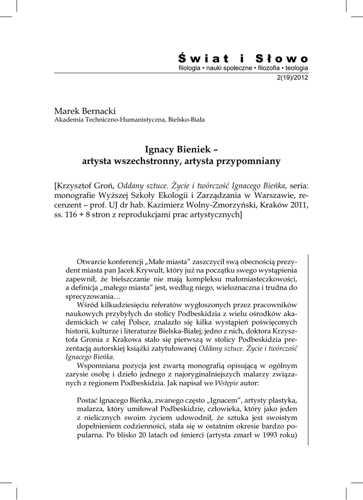 Świat i Słowo filologia • nauki społeczne • filozofia • teologia 2(19)/2012 Marek Bernacki Akademia Techniczno-Humanistyczna, Bielsko-Biała Ignacy Bieniek – artysta wszechstronny, artysta przypomniany [Krzysztof Groń, Oddany sztuce. Życie i twórczość Ignacego Bieńka, seria: monografie Wyższej Szkoły Ekologii i Zarządzania w Warszawie, recenzent – prof. UJ dr hab. Kazimierz Wolny-Zmorzyński, Kraków 2011, ss. 116 + 8 stron z reprodukcjami prac artystycznych] Otwarcie konferencji „Małe miasta” zaszczycił swą obecnością prezydent miasta pan Jacek Krywult, który już na początku swego wystąpienia zapewnił, że bielszczanie nie mają kompleksu małomiasteczkowości, a definicja „małego miasta” jest, według niego, wieloznaczna i trudna do sprecyzowania… Wśród kilkudziesięciu referatów wygłoszonych przez pracowników naukowych przybyłych do stolicy Podbeskidzia z wielu ośrodków akademickich w całej Polsce, znalazło się kilka wystąpień poświęconych historii, kulturze i literaturze Bielska-Białej; jedno z nich, doktora Krzysztofa Gronia z Krakowa stało się pierwszą w stolicy Podbeskidzia prezentacją autorskiej książki zatytułowanej Oddany sztuce. Życie i twórczość Ignacego Bieńka. Wspomniana pozycja jest zwartą monografią opisującą w ogólnym zarysie osobę i dzieło jednego z najoryginalniejszych malarzy związanych z regionem Podbeskidzia. Jak napisał we Wstępie autor: Postać Ignacego Bieńka, zwanego często „Ignacem”, artysty plastyka, malarza, który umiłował Podbeskidzie, człowieka, który jako jeden z nielicznych swoim życiem udowodnił, że sztuka jest swoistym dopełnieniem codzienności, stała się w ostatnim okresie bardzo popularna. Po blisko 20 latach od śmierci (artysta zmarł w 1993 roku) 312 Marek Bernacki zaczął być „poszukiwany”. Jego osobą i obrazami zainteresowali się kolekcjonerzy, historycy sztuki oraz biografowie1. Monografia Gronia, będąca rozszerzeniem jego pracy magisterskiej, składa się z pięciu głównych rozdziałów: Dzieciństwo i młodość, Edukacja, Praca zawodowa, Twórczość oraz Katalog dzieł. Całość domyka kilkustronicowa bibliografia przedmiotowa (warto odnotować, że obok folderów i katalogów z wystaw Ignacego Bieńka, największą grupę wykorzystanych przez autora źródeł stanowią listy, jakie otrzymał podczas pisania książki od znajomych i krewnych artysty) oraz ośmiostronicowa wkładka z reprodukcjami dzieł malarskich „Ignaca” ze zbiorów rodzinnych syna artysty, Grzegorza Bieńka, a także ze zbiorów bielskiego marszanda Franciszka Kukioły. W trzech pierwszych rozdziałach „biograficznych” autor przedstawił najważniejsze fakty z życia Ignacego Bieńka, podważając przy tym niejednokrotnie obiegowe opinie, które nie znajdują potwierdzenia w faktach. Do takich „legend” należy przekonanie, jakoby bezpośredni wpływ na twórczość Bieńka miał Julian Fałat. Owszem, w twórczości obu malarzy dużą rolę odegrała Bystra i pejzaże okolicznych gór w paśmie Beskidu Śląskiego, jednak w chwili śmierci znanego polskiego akwarelisty Ignacy Bieniek, urodzony w 1925 r. w Bystrej Krakowskiej, miał zaledwie 4 lata, tak więc o żadnych bezpośrednich wpływach nie może być mowy: Można spotkać się z opinią, że Julian Fałat znał pierwsze prace Bieńka, zaraził go malarstwem. Trzeba wyjaśnić, że Ignacy wielokrotnie spotykał się ze spuścizną artystyczną tego malarza, ale o bezpośrednim kontakcie w kwestii sztuk plastycznych między tymi dwoma artystami nie mogło być mowy2. Według Gronia osobą, która na początku pokierowała talentem uzdolnionego plastycznie chłopca, był raczej Jan Wałach, znany istebniański artysta, do którego zaprowadził kilkuletniego Ignacego jego ojciec. W późniejszym okresie studiów w Akademii Sztuk Pięknych w Krakowie mistrzem Ignacego Bieńka był Zbigniew Pronaszko, u którego młody malarz złożył w czerwcu 1952 roku egzamin dyplomowy. To zapewne Pronaszce, związanemu przed wojną z grupą malarzy awangardowych, a także klimatowi krakowskiej ASP, zawdzięczał Bieniek wpływy klasycyzującego koloryzmu oraz występujące w wielu jego obrazach elementy fowizmu i ekspresjonizmu3. Jednak najważniejszym mistrzem 1 K. Groń, Wstęp, [w:] tegoż, Oddany sztuce. Życie i twórczość Ignacego Bieńka, Kraków 2011, s. 7. 2 Tamże, s. 46. 3 Zob. P. Głowacki, Schronienie w sztuce, [w:] K. Groń, Oddany sztuce. Życie i twórczość Ignacego Bieńka, Kraków 2011, s. 5. Ignacy Bieniek – artysta wszechstronny, artysta przypomniany bielskiego malarza, podkreśla Groń, był Franciszek Jaźwiecki – malarz, grafik i rysownik, członek Grupy Krakowskiej. Autor książki powołuje się na wypowiedź profesora Józefa Marka, bielszczanina i długoletniego przyjaciela artysty: Najważniejszy wpływ twórczości Franciszka na Ignacego, to sposób pracy w malarstwie. Jaźwiecki malował ogromne ilości pejzaży, posiadał specyficzny sposób kładzenia farby na płótnie, farba była kładziona grubo4. Przygotowując książkę do druku Krzysztof Groń kontaktował się z blisko dwustoma osobami, wśród których znaleźli się najbliżsi krewni Ignacego Bieńka – syn Grzegorz i córka Urszula, a także dwie ostatnie żony zmarłego artysty oraz znajomi z kręgów bielskiej bohemy, np. profesor Michał Kliś, Jacek Witaliński czy Franciszek Kukioła. Opowieści i wspomnienia tych osób pozwoliły autorowi na nakreślenie w miarę spójnego portretu artysty z trzech okresów jego działalności: zielonogórskiego (lata 1954–1960), bielsko-bialskiego (1960–1987) i wrocławskiego (1987–1993). Dla bielskiego czytelnika monografii, do którego w głównej mierze skierowana jest książka doktora Gronia, najciekawszy jest okres drugi, najdłuższy i obfitujący w wiele istotnych dla kariery artysty wydarzeń. Bieniek wrócił do Bielska-Białej z Zielonej Góry w 1960 