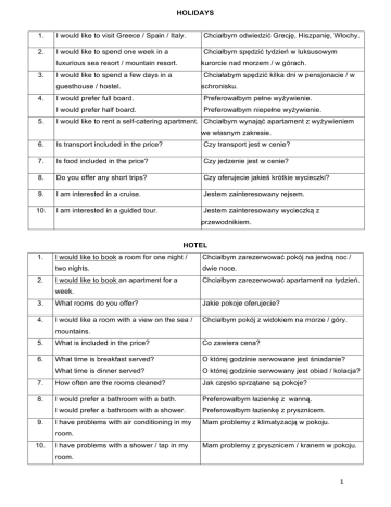 HOLIDAYS 1. I would like to visit Greece / Spain / Italy. Chciałbym odwiedzić Grecję, Hiszpanię, Włochy. 2. I would like to spend one week in a Chciałbym spędzić tydzień w luksusowym luxurious sea resort / mountain resort. 3. kurorcie nad morzem / w górach. I would like to spend a few days in a Chciałabym spędzić kilka dni w pensjonacie / w guesthouse / hostel. 4. 5. schronisku. I would prefer full board. Preferowałbym pełne wyżywienie. I would prefer half board. Preferowałbym niepełne wyżywienie. I would like to rent a self-catering apartment. Chciałbym wynająć apartament z wyżywieniem we własnym zakresie. 6. Is transport included in the price? Czy transport jest w cenie? 7. Is food included in the price? Czy jedzenie jest w cenie? 8. Do you offer any short trips? Czy oferujecie jakieś krótkie wycieczki? 9. I am interested in a cruise. Jestem zainteresowany rejsem. 10. I am interested in a guided tour. Jestem zainteresowany wycieczką z przewodnikiem. HOTEL 1. 2. I would like to book a room for one night / Chciałbym zarezerwować pokój na jedną noc / two nights. dwie noce. I would like to book an apartment for a Chciałbym zarezerwować apartament na tydzień. week. 3. What rooms do you offer? Jakie pokoje oferujecie? 4. I would like a room with a view on the sea / Chciałbym pokój z widokiem na morze / góry. mountains. 5. What is included in the price? Co zawiera cena? 6. What time is breakfast served? O której godzinie serwowane jest śniadanie? What time is dinner served? O której godzinie serwowany jest obiad / kolacja? 7. How often are the rooms cleaned? Jak często sprzątane są pokoje? 8. I would prefer a bathroom with a bath. Preferowałbym łazienkę z wanną. I would prefer a bathroom with a shower. Preferowałbym łazienkę z prysznicem. I have problems with air conditioning in my Mam problemy z klimatyzacją w pokoju. 9. room. 10. I have problems with a shower / tap in my Mam problemy z prysznicem / kranem w pokoju. room. 1 SUN & FUN 1. I am looking for a free deckchair. Szukam wolnego leżaka. 2. Is this deckchair free? Czy ten leżak jest wolny? 3. I need a towel. Potrzebuję ręcznik. Can I have a clean towel? Czy mogę prosić o czysty ręcznik? 4. I am looking for sunscreen / suntan lotion. Szukam kremu /olejku do opalania. 5. Can you put some cream on my back? Czy możesz posmarować mi plecy? 6. Put cream with UV filter on your face. Nałóż krem z filtrem UV na twarz. 7. Wear sunglasses. / Put on sunglasses. Załóż okulary. Wear flip-flops / Put on flip-flops. Załóż klapki. Can I try on this bikini? Czy mogę przymierzyć to bikini? Can I try on this swimming costume? Czy mogę przymierzyć ten strój kąpielowy. 9. Let’s open the beach umbrella. Rozłóżmy parasol plażowy. 10. Let’s sunbathe. Poopalajmy się. Let’s swim / snorkel. Popływajmy / ponurkujmy. 8. HEALTH 1. I have a headache / splitting headache. Mam ból głowy. / Mam migrenę. 2. I have a toothache / earache. Mam ból zęba / ból ucha. 3. I have sore throat. Mam ból gardła. 4. I have a fever. Mam gorączkę. My temperature is 39 degrees. Moja temperatura wynosi 39 stopni. 5. I have a rash. Mam wysypkę. 6. I vomit a lot. Dużo wymiotuję 7. I vomited once / twice / three times. Zwymiotowałem raz/ dwa / trzy razy. 8. I have shivers. Mam dreszcze. 9. I have a cold. Mam przeziębienie. 10. I have a flu. Mam grupę 2 DOCTOR 1. Can I make an appointment with a doctor? Czy mogę się umówić na wizytę u lekarza? 2. I would like to see a doctor. Chciałbym zobaczyć się z lekarzem. 3. I have different symptoms Mam różne symptomy. 4. I cough a lot. Dużo kaszlę. 5. I have a runny nose. Mam katar. 6. I feel bad. Czuję się źle. I feel weak. Jestem słaby. 7. I need some medicines. Potrzebuję lekarstw. 8. Can you prescribe me some medicines? Czy może mi Pan przepisać lekarstwa? 9. I need a prescription. Potrzebuję recepty. 10. antibiotics / tablets / vitamins / syrup antybiotyki / tabletki / witaminy / syrop PLANE 1. I would like to check in. Chciałabym się odprawić. 2. Where can I check in? Gdzie mogę się odprawić? 3. Here are my passport and a ticket. Oto mój paszport i bilet. 4. I would like a window seat. Chciałbym miejsce przy oknie. I would like an aisle seat. /aɪl/ Chciałbym miejsce przy przejściu. 5. How long is the flight? Jak długi jest lot? 6. I have a direct flight to Miami. Mam lot bezpośredni do Miami. 7. I have a connecting flight to Peru. Mam lot łączony do Peru. 8. Do you serve meals during the flights? Czy serwujecie posiłki podczas lotu? 9. Is the flight on time? Czy lot jest na czas? 10. Why is the flight delayed? Dlaczego lot jest opóźniony? 3