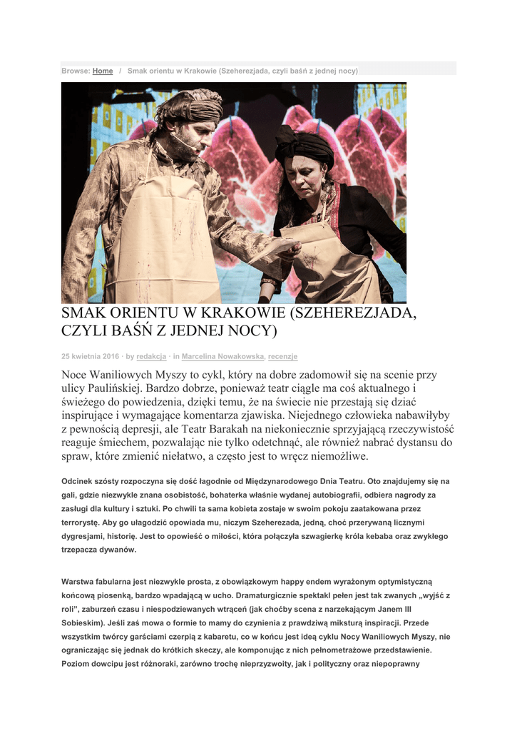 Browse: Home / Smak orientu w Krakowie (Szeherezjada, czyli baśń z jednej nocy) SMAK ORIENTU W KRAKOWIE (SZEHEREZJADA, CZYLI BAŚŃ Z JEDNEJ NOCY) 25 kwietnia 2016 · by redakcja · in Marcelina Nowakowska, recenzje Noce Waniliowych Myszy to cykl, który na dobre zadomowił się na scenie przy ulicy Paulińskiej. Bardzo dobrze, ponieważ teatr ciągle ma coś aktualnego i świeżego do powiedzenia, dzięki temu, że na świecie nie przestają się dziać inspirujące i wymagające komentarza zjawiska. Niejednego człowieka nabawiłyby z pewnością depresji, ale Teatr Barakah na niekoniecznie sprzyjającą rzeczywistość reaguje śmiechem, pozwalając nie tylko odetchnąć, ale również nabrać dystansu do spraw, które zmienić niełatwo, a często jest to wręcz niemożliwe. Odcinek szósty rozpoczyna się dość łagodnie od Międzynarodowego Dnia Teatru. Oto znajdujemy się na gali, gdzie niezwykle znana osobistość, bohaterka właśnie wydanej autobiografii, odbiera nagrody za zasługi dla kultury i sztuki. Po chwili ta sama kobieta zostaje w swoim pokoju zaatakowana przez terrorystę. Aby go ułagodzić opowiada mu, niczym Szeherezada, jedną, choć przerywaną licznymi dygresjami, historię. Jest to opowieść o miłości, która połączyła szwagierkę króla kebaba oraz zwykłego trzepacza dywanów. Warstwa fabularna jest niezwykle prosta, z obowiązkowym happy endem wyrażonym optymistyczną końcową piosenką, bardzo wpadającą w ucho. Dramaturgicznie spektakl pełen jest tak zwanych „wyjść z roli”, zaburzeń czasu i niespodziewanych wtrąceń (jak choćby scena z narzekającym Janem III Sobieskim). Jeśli zaś mowa o formie to mamy do czynienia z prawdziwą miksturą inspiracji. Przede wszystkim twórcy garściami czerpią z kabaretu, co w końcu jest ideą cyklu Nocy Waniliowych Myszy, nie ograniczając się jednak do krótkich skeczy, ale komponując z nich pełnometrażowe przedstawienie. Poziom dowcipu jest różnoraki, zarówno trochę nieprzyzwoity, jak i polityczny oraz niepoprawny politycznie, przy czym wyrażony jest także za pomocą projekcji oraz piosenek (świetna parodia komedii romantycznych w „miłosnej piosence” o gwiazdach na niebie). W spektaklu znajdziemy liczne nawiązania do bajek, filmów oraz szeroko pojętej sztuki, a także świetne piosenki do muzyki Renaty Przemyk. Teksty wyśpiewywane przez aktorów charakteryzują się dobrymi rymami i mocną aluzyjnością, czasem na granicy z perfidią żartu. Aktorom zaliczanym do znanych już przyjaciół Teatru Barakah (Monika Kufel, Ana Nowicka, Lidia Bogaczówna, Krzysztof Bochenek, Dariusz Starczewski) towarzyszą młodzi adepci, idealnie wpasowujący się w zespół i wnoszący dużo nowości (Roksana Lewak, Bartosz Buława) a także świetni muzycy grający na żywo, co, przy niewielkiej i zapełnionej po brzegi podczas premiery widowni, robi imponujące wrażenie. Popisy aktorskie okraszone są choreografią przygotowaną przez zdolnego Jana Lorysa, który maksymalnie wykorzystał niewielką przestrzeń sceny w ramach scenografii opatulonej głównie dywanami. Tematy poruszane zarówno w dowcipach, jak i nieco bardziej poważne, to przede wszystkim tolerancja, a raczej jej brak, który wychodzi na jaw pod wpływem ostatnich światowych wydarzeń. To także stereotypy dotyczące arabskiej kultury (na przykład uznawanie kebabu za niemalże narodową potrawę w Turcji) oraz wiele pomniejszych tematów czy komentarze do świata polityki i sztuki. Dzięki temu rozrywkowa forma spektaklu pozostawia przestrzeń dla niewielkiej refleksji. Marcelina Nowakowska, Teatralia Kraków Internetowy Magazyn „Teatralia”, numer 170/2016 Szeherezjada, czyli baśń z jednej nocy Teatr Barakah w Krakowie autorzy: Dawid Barański, AmadouGuindo, Grzegorz Tadeusz Like reżyseria: Ana Nowicka obsada: Lidia Bogaczówna, Monika Kufel, Roskana Lewak, Ana Nowicka, Krzysztof Bochenek, Bartosz Buława, Dariusz Starczewski, Karol Śmiałek muzyka: Renata Przemyk wykonanie i opracowanie muzyczne: Magda Brudzińska [altówka, śpiew, darabuka], Jacek Kopiec [akordeon, instrumenty perkusyjne], Piotr Południak – [kontrabas], Mateusz Krystian [piano], scenografia: Monika Kufel multimedia: Popesz Lange choreografia: Jan Lorys premiera: 18 kwietnia 2016 Marcelina Nowakowska – studiuje nieprzerwanie od ukończenia szkoły średniej, głównie kierunki filologiczno-teatralne, w nielicznych wolnych chwilach pochłania książki oraz czekoladę, pisze, podróżuje, spaceruje po Krakowie...