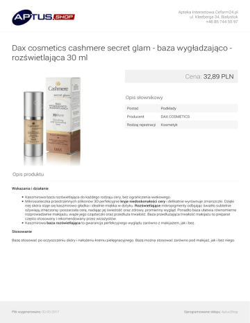 Apteka Internetowa Cefarm24.pl ul. Kleeberga 34, Białystok +48 85 744 55 97 Dax cosmetics cashmere secret glam - baza wygładzająco rozświetlająca 30 ml Cena: 32,89 PLN Opis słownikowy Postać Podkłady Producent DAX COSMETICS Rodzaj rejestracji Kosmetyk Opis produktu Wskazania i działanie Kaszmirowa baza rozświetlająca do każdego rodzaju cery, bez ograniczenia wiekowego. Mikrosiateczka przestrzennych silikonów 3D perfekcyjnie kryje niedoskonałości cery i delikatnie wyrównuje zmarszczki. Dzięki niej skóra staje się kaszmirowo gładka i idealnie miękka w dotyku. Rozświetlające mikropigmenty odbijając światło subtelnie ożywiają zmęczoną i poszarzała cerę, nadając jej świeżość oraz zdrowy, promienny wygląd. Ponadto baza ułatwia równomierne rozprowadzenie makijażu, wiąże jego cząsteczki oraz przedłuża trwałość. Baza przedłużająca trwałość makijażu to preparat często stosowany i rekomendowany przez wizażystów. Kaszmirowa baza rozświetlająca to gwarancja perfekcyjnego wyglądu zarówno z makijażem, jak i bez. Stosowanie Bazę stosować po oczyszczeniu skóry i nałożeniu kremu pielęgnacyjnego. Bazę można stosować zarówno pod makijaż, jak i bez niego. Plik wygenerowano: 02-03-2017 Powered by TCPDF (www.tcpdf.org) Oprogramowanie sklepu: AptusShop