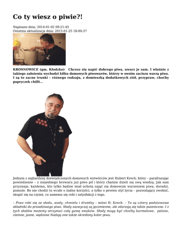 Co ty wiesz o piwie?! Napisano dnia: 2014-01-02 09:21:45 Ostatnia aktualizacja dnia: 2015-01-25 18:00:37 KROSNOWICE (gm. Kłodzko) Chcesz się napić dobrego piwa, uwarz je sam. I właśnie z takiego założenia wychodzi kilku domowych piwowarów, którzy w swoim zaciszu warzą piwa. I są to zacne trunki – różnego rodzaju, z domieszką dodatkowych ziół, przypraw, choćby papryczek chilli... Jednym z najbardziej doświadczonych domowych wytwórców jest Hubert Krech, który – parafrazując powiedzenie – z niejednego browaru już piwo pił i który chętnie dzieli się swą wiedzą. Jak sam przyznaje, każdemu, kto tylko będzie miał ochotę zająć się domowym warzeniem piwa, doradzi, pomoże. Bo nie chodzi tu wcale o żadne korzyści, a tylko o pewien styl życia – pozwalający zwolnić, skupić się na czymś, co samemu się robi i satysfakcji z tego. – Piwo robi się ze słodu, wody, chmielu i drożdży – mówi H. Krech. – To są cztery podstawowe składniki do prawdziwego piwa. Słody zazwyczaj są jęczmienne, ale zdarzają się także pszeniczne. I z tych słodów możemy otrzymać całą gamę smaków. Słody mogą być choćby karmelowe, palone, ciemne, jasne, wędzone Nadają one także określony kolor piwu. Zrobienie domowego piwa niewiele różni się od tego, jak byśmy chcieli zrobić zupę, czy domowe wino z owoców – przynajmniej tak twierdzi rozmówca. – Każdy kto praktycznie potrafi zagotować wodę na herbatę, potrafiłby też uwarzyć piwo. Jednak, aby zrobić dobre piwo – a to różnica – oprócz tego, że trzeba zaopatrzyć się w kilka sprzętów, trzeba też uzbroić się w cierpliwość. Oczekiwanie aż piwo dojrzeje w butelkach trwa od miesiąca do pół roku. A są też takie piwa – portery lub niektóre stout’y – które dojrzewają nawet powyżej roku. Browary kontraktowe to browary, które nie mają stałej siedziby. Wynajmują dany browar, zamawiają surowce, ustalają technologie, nadzorują warzenie, pakują i sprzedają jako swój produkt. Maja całą kolekcję różnego rodzaju bardzo dobrych i rzadko powszechnie dostępnych piw. W Polsce są dwa browary kontraktowe – „Pinta", „Szał Piw". Mamy wszystkie produkty i co dalej? Piwa można zrobić za pomocą tzw. zacierania. Polega to na tym, że zestawia się słody do receptury (różne, w zależności od tego, co chcemy osiągnąć), śrutuje się je (tworzy się coś na wzór kaszy z elementami mąki). Aby uwarzyć około 20 litrów piwa jasnego potrzeba mniej więcej cztery i pół kilograma słodu. – Dziś robię stout'a, czyli piwo pochodzenia irlandzkiego, z dodatkiem dwóch gatunków papryk chilli. Jest to sprawdzona receptura mojego kolegi. Użyjemy słodów jasnych, karmelowych i palonych – tłumaczy H. Krech. W dużym garze jest już podgrzana woda o temperaturze między pięćdziesięcioma a siedemdziesięcioma kilkoma stopniami (w zależności od rodzaju piwa). Trafia do niej przygotowany słód. W tej temperaturze – najprościej mówiąc – uaktywniają się enzymy i skrobia pęcznieje, a co za tym idzie cukier i inne wartościowe czynniki przedostają się do wody. Będzie on podgrzewany przez około półtorej godziny. Później słód jest odfiltrowywany i otrzymujemy tzw. brzeczkę. Jest ona słodka, wtedy gotuje się ją z chmielem i ewentualnymi innymi składnikami. Następnie całość zostanie schłodzona i dodane zostaną drożdże. W takiej formie wszystko, już w osobnych pojemnikach, poddane zostanie fermentacji (około dwóch tygodni), następnie zostanie rozlane, wyklarowane i zakapslowane. Moda na piwowarstwo domowe przyszła – o dziwo – z USA. Amerykanie z globalizacją mieli do czynienia znacznie wcześniej niż reszta świata, zaczęli się buntować przeciwko niej. Objawem tego buntu jest także lokalne browarnictwo i piwowarstwo domowe. Osób się tym zajmujących jest tysiące. Piwo a'la grodziskie Jest to jedyny oryginalny polski styl piwa, który jest wymieniany w literaturze światowej. Jest warzone przez browary rzemieślnicze w USA, Czechach, Holandii i teraz z powrotem w Polsce. Stowarzyszenie Piwowarów Domowych stara się odtworzyć i upowszechnić wiedzę na temat tego piwa. Rok temu przyszły do naszego kraju piwa pozbawione etykiet, a jedynie określone kodami, i starzy pracownicy browaru w Grodzisku (było produkowane do 1992 r.) je próbowali. Starano się ustalić, które piwo najbardziej jest zbliżone do oryginału. Jest to piwo oparte na pszenicznym słodzie wędzonym dymem dębowym, robi go – póki co – tylko jedna słodownia w Europie (w Bawarii). Aby rozpocząć produkcję domowego piwa trzeba by było wyłożyć jednorazowo około 400 zł na niezbędny sprzęt, jednak by zajmować się tym na wyższym poziomie wtajemniczenia potrzebne jest blisko 800 zł. – Podczas przelewania przygotowanego roztworu do fermentacji dokładnie wszystko sprzątam – mówi Hubert Krech. – Staram się, by w powietrzu nie było kurzu i roztoczy. Czasem wystarczy, że do fermentacji dostanie się jakaś bakteria i całe piwo jest do wylania, nie nadaje się do spożycia. Ostatnio pobito rekord na zawartość alkoholu w piwie. Osiągnięto ponad 64 procent. Osiągnięcie takiego wyniku polega na procesie podobnym do destylacji, otóż piwo się wymraża. Obniża się temperaturę, aby woda się skrystalizowała i się ją odsącza. Piwo się wówczas zagęszcza i w ten sposób można stworzyć bardzo mocne trunki. Niekoniecznie ma to wiele wspólnego z naturalnie stworzonym piwem. Bawarskie Prawo Czystości (niem. Reinheitsgebot) zgodnie z nim jedynymi składnikami piwa mogły być słód, woda i chmiel. Ma to związek z tym, że niegdyś do piwa dodawano również różne zioła, w tym bieluń powodujący halucynacje i inne rośliny źle wpływające na człowieka. Piwa proponowane przez duże koncerny mają to do siebie, że powinny smakować wszystkim, a przynajmniej większości. Dobre piwa z małych, nie do k
