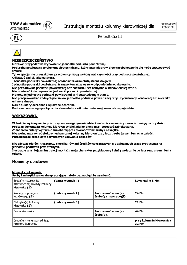 TRW Automotive Aftermarket Instrukcja montażu kolumny kierowniczej dla: PUBLICATION XZB1213PL Renault Clio III NIEBEZPIECZEŃSTWO Możliwe przypadkowe wyzwolenie jednostki poduszki powietrznej! Poduszka powietrzna to element pirotechniczny, który przy nieprawidłowym obchodzeniu się może spowodować śmierć! Tylko specjalnie przeszkoleni pracownicy mogą wykonywać czynności przy poduszce powietrznej. Odłączyć zaciski akumulatora. Jednostkę poduszki powietrznej odkładać zawsze obitą stroną do góry. Jednostkę poduszki powietrznej transportować zawsze w odpowiednim opakowaniu. Nie pozostawiać poduszki powietrznej bez nadzoru, lecz zamykać w odpowiedniej szafie. Nie otwierać i nie naprawiać jednostki poduszki powietrznej. Montować jednostkę poduszki powietrznej w nieuszkodzonym stanie. Nie przeprowadzać żadnych pomiarów jednostki poduszki powietrznej przy użyciu lampy kontrolnej lub miernika uniwersalnego. Nosić okulary ochronne i rękawice ochronne. Podczas ponownego podłączania akumulatora nikt nie może znajdować się w pojeździe. WSKAZÓWKA W trakcie wykonywania prac przy wspomaganym układzie kierowniczym należy zwracać uwagę na czystość. Podczas demontażu kolumny kierownicy blokada kolumny musi pozostać zablokowana. Zasadniczo należy wymienić samohamujące i skorodowane śruby i nakrętki. Nie wolno naprawiać elektromechanicznej kolumny kierowniczej, lecz trzeba ją wymieniać w całości. Przestrzegać przepisów dotyczących usuwania odpadów! Nie używać olejów, tłuszczów, chemikaliów ani środków czyszczących nie zalecanych przez producenta na jednostki poduszek powietrznych. Ilustracje w niniejszej instrukcji montażu mają charakter przykładowy i służą wyłącznie do lepszego zrozumienia tekstu. Momenty obrotowe Momenty dokręcania Śruby i nakrętki samozabezpieczające należy bezwzględnie wymienić. Śruba(-y) sterownika (patrz rysunek 4) elektronicznej blokady kolumny kierownicy (1) śruba(y) - przegubu krzyżowego (2) (patrz rysunek 7) Nakrętka(-i) kolumny kierownicy (1) (patrz rysunek 8) Zastosować nową(e) śrubę(y) i nakrętkę(i). Lewy gwint 8 Nm 24 Nm 21 Nm Śruba kierownicy Zastosować nową(e) śrubę(y). Śruba(-y) wałka pośredniego kolumny kierownicy 44 Nm przy kolumnie kierownicy 32 Nm 1 Rysunek 1 Demontaż: Odblokować dźwignię nastawczą - kolumny kierownicy. Dezaktywować system poduszek powietrznych. Obserwować pozycję zamontowania łącza EOBD. Ustawić kierownicę w pozycji środkowej. Odłączyć biegun ujemny akumulatora. Przestrzegać czasu oczekiwania co najmniej 10 s. Wymontować poduszkę powietrzną kierowcy. Rozłączyć elektryczne złącze(-a) wtykowe poduszki powietrznej kierowcy. Wymontować kierownicę. Wymontować obudowę (y) powierzchni na nogi z lewej strony na dole. Wymontować boczną (-e) osłonę(y) deski rozdzielczej. (1) Wymontować listwę (-y) ozdobną (-e). (2) Wykręcić śrubę(y) - osłony. (3) Wymontować dolną osłonę(wy)deski rozdzielczej. (4) Odłączyć elektryczne połączenia wtykowe. (patrz rysunek 1) Wykręcić śruby(-ę) osłon(-y) kolumny kierownicy. 1 Boczna (-e) osłona (-y) deski rozdzielczej 2 Listwa dekoracyjna 3 śruba(y) - osłony 4 Dolna (-e) osłona (-y) deski rozdzielczej Rysunek 2 Wymontować obudowę drążka kierowniczego na dole. (1) Poluzować klamrę(y) mocującą(e). (2) Wymontować obudowę drążka kierowniczego u góry. (3) (patrz rysunek 2) 1 Osłona kolumny kierownicy na dole 3 Osłona kolumny kierownicy u góry 2 2 Klamra mocująca Oznaczenie na jednostce stykowej musi się pokrywać z krawędzią odniesienia. (1)(2) Poluzować zacisk(-i) modułu kolumny kierownicy. Wymontować moduł kolumny kierownicy z przełącznikiem(-ami) kolumny kierownicy. (1) Odłączyć elektryczne połączenia wtykowe. (patrz rysunek 3) Rysunek 3 1 Moduł kolumny kierownicy W samochodach z systemem dostępu bezkluczykowego: 2 znaczenie(a) Rysunek 4 Odkręcić śrubę(-y) sterownika elektronicznej blokady kolumny kierownicy. (1) Śruba ma lewy gwint. Odłączyć elektryczne połączenia wtykowe. (2) Wymontować sterownik elektronicznej blokady kolumny kierownicy. (3) (patrz rysunek 4) 1 Śruba(-y) sterownika elektronicznej blokady kolumny kierownicy 3 Sterownik elektronicznej blokady kolumny kierownicy 3 2 Złącze (a) elektryczne W pojazdach bez bezkluczykowego systemu dostępowego: Rysunek 5 Rozłączyć elektryczne złącze wtykowe cewki czytającej immobilizera. (1) Odłączyć blokadę cewki czytającej immobilizera. (2) Zdemontować cewkę odczytującą - immobilizer. (3) (patrz rysunek 5) 1 Elektryczne złącze(-a) wtykowe cewki czytającej immobilizera 2 Blokada cewki czytającej immobilizera 3 Cewka odczytująca immobilizera Nadpiłować śrubę(-y) zrywalną(-e) stacyjki i wykręcić. (1) Rozłączyć elektryczne złącze(-a) wtykowe stacyjki. Trzpień(-nie) mocujący(-e) stacyjkę wcisnąć w dół. (2) Zdemontować stacyjkę. (3) (patrz rysunek 6) Rysunek 6 1 Śruby zrywalne stacyjki 3 Stacyjka 4 2 kołek(i) chwytający(e) Kontynuacja dla wszystkich pojazdów Rysunek 7 Odchylić wykładzinę podłogową przestrzeni na nogi po stronie kierowcy. Usunąć pierścień oporowy. (1) Wykręcić śrubę(y) - przegubu krzyżowego. (2) Zwrócić uwagę na pozycję montażową! Zdjąć przegub krzyżowy z przekładni kierowniczej w kierunku do góry. (3) (patrz rysunek 7) 1 Pierścień podporowy 2 śruba(y) - przegubu krzyżowego 3 Wał pośredni kolumny kierownicy Odkręcić nakrętkę(-i) kolumny kierownicy. (1) Pomiędzy blachą podłogi a śrubą pośredniego wałka kierowcy przy kolumnie kierownicy umieścić element(-y) dystansowy(-e) o długości ok. 20 cm. Zwolnić blokady kolumny kierownicy. (2) Odłożyć kolumnę kierowcy na elemencie dystansowym. Rozłączyć elektryczne złącze(-a) wtykowe kolumny kierownicy. (patrz rysunek 8) Rysunek 8 W przypadku wymiany kolumny kierownicy należy przemontować następujące elementy: - Stacyjka - Wał po