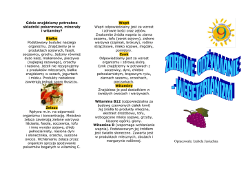 Gdzie znajdziemy potrzebne składniki pokarmowe, minerały i witaminy? Białko Podstawowy budulec naszego organizmu. Znajdziemy je w produktach sojowych, fasoli, soczewicy, grochu. Jedzmy również dużo kasz, makaronów, pieczywa (najlepiej razowego), orzechy i nasiona. Jeżeli nie rezygnujemy z produktów mlecznych, białko znajdziemy w serach, jogurtach i mleku. Produkty nabiałowe zawierają jednak sporo tłuszczu. Żelazo Wpływa m.in. na odporność organizmu i koncentrację. Mnóstwo żelaza zawierają zielone warzywa liściaste, fasola, soczewica, tofu i inne wyroby sojowe, chleb pełnoziarnisty, nasiona dyni i słonecznika, orzechy, suszone owoce. Wchłanianiu żelaza przez organizm sprzyja spożywanie pokarmów bogatych w witaminę C. Wapń Wapń odpowiedzialny jest za wzrost i zdrowie kości oraz zębów. Znakomite źródła wapnia to ziarna sezamu, tofu (serek sojowy), zielone warzywa (szpinak, brokuły), rośliny strączkowe, mleko sojowe, migdały, pomidory. Cynk Odpowiedzialny jest za wzrost organizmu i zdrową skórę. Cynk znajdziemy w potrawach z soczewicy, dyni, chlebie pełnoziarnistym, brązowym ryżu, ziarnach sezamu, orzechach, pieczarkach. Witaminy Znajdziesz je pod dostatkiem w świeżych owocach i warzywach. Witamina B12 (odpowiedzialna za budowę czerwonych ciałek krwi) Jej źródła to produkty mleczne, ekstrakt drożdżowy, tofu, wzbogacone mleko sojowe, grzyby, kiszone ogórki, glony. Witamina D (wspomaga wchłanianie wapnia). Podstawowym jej źródłem jest światło słoneczne. Zawarta jest w produktach mlecznych, zbożach i margarynie roślinnej. Opracowała: Izabela Jasiuchna Odmiany wegetarianizmu Odżywianie wegetariańskie Sporo ludzi z chęcią oddaje się poszukiwaniom różnych niecodziennych rodzajów żywności wegetariańskiej i osiąga przez to pożywną, urozmaiconą i pełnąpokarmową dietę. Wegetarianizm – rodzaj diety charakteryzujący się wyłączeniem z posiłków produktów pochodzenia mięsnego i ewentualnie jaj lub nabiału z pobudek moralnych, etycznych bądź zdrowotnych. W języku potocznym wegetarianizm to zbiór kilku diet, w tym weganizmu, fruktarianizmu i samego wegetarianizmu. Laktoowowegetarianizm (owolaktarianizm) – najbardziej rozpowszechniona odmiana wegetarianizmu. Polega na rezygnacji z potraw mięsnych. Do jadłospisu dopuszczone są natomiast produkty pochodzenia zwierzęcego: nabiał, jajka, miód. Laktowegetarianizm – popularna odmiana wegetarianizmu, polegająca na wyłączeniu z jadłospisu jajek. Laktowegetarianie dopuszczają jednak spożywanie mleka i jego przetworów. Owowegetarianizm – dieta, która z produktów zwierzęcych dopuszcza jedynie spożywanie jajek. Weganizm – polega na rezygnacji ze spożywania wszelkich pokarmów wytwarzanych przez zwierzęta. Poza mięsem wyłączane są więc z jadłospisu mleko, sery, jaja oraz miód. Witarianizm – dieta polegająca na spożywaniu wyłącznie świeżych warzyw i owoców. Odrzuca jakiekolwiek potrawy gotowane. Witarianie rezygnują również z wszelkich napojów typu kawa, herbata. Frutarianizm (lub fruktarianizm, fruitarianizm, fruktorianizm) – najbardziej zaostrzona forma wegetarianizmu. Oprócz mięsa i produktów pochodzenia zwierzęcego, fruktarianie nie jedzą żadnych owoców i warzyw, które musieliby zerwać. Ich pokarmem są owoce, które same spadną z drzewa.