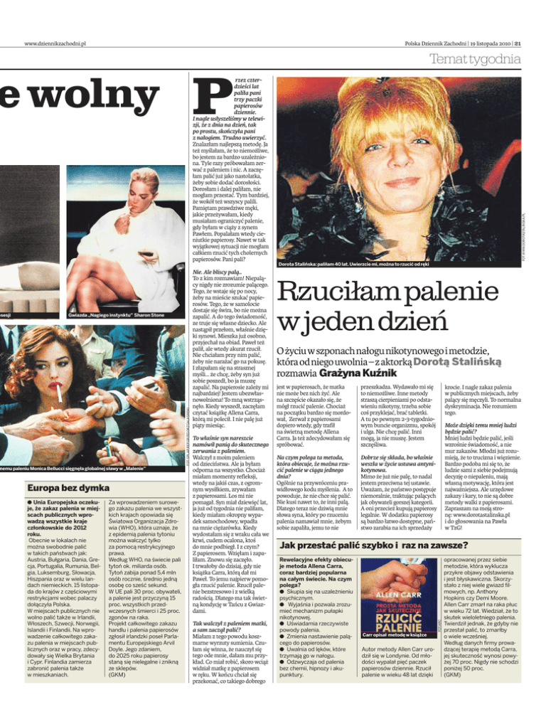 Polska Dziennik Zachodni | 19 listopada 2010 | 21 www.dziennikzachodni.pl FOT. SPI, AP,REP.GRZEGORZGALASIŃSKI Gwiazda „Nagiego instynktu” Sharon Stone nemu paleniu Monica Bellucci sięgnęła globalnej sławy w „Malenie” Europa bez dymka a Unia Europejska oczekuje, że zakaz palenia w miejscach publicznych wprowadzą wszystkie kraje członkowskie do 2012 roku. Obecnie w lokalach nie można swobodnie palić w takich państwach jak: Austria, Bułgaria, Dania, Grecja, Portugalia, Rumunia, Belgia, Luksemburg, Słowacja, Hiszpania oraz w wielu landach niemieckich. 15 listopada do krajów z częściowymi restrykcjami wobec palaczy dołączyła Polska. W miejscach publicznych nie wolno palić także w Irlandii, Włoszech, Szwecji, Norwegii, Islandii i Finlandii. Na wprowadzenie całkowitego zakazu palenia w miejscach publicznych oraz w pracy, zdecydowały się Wielka Brytania i Cypr. Finlandia zamierza zabronić palenia także w mieszkaniach. Za wprowadzeniem surowego zakazu palenia we wszystkich krajach opowiada się Światowa Organizacja Zdrowia (WHO), która uznaje, że z epidemią palenia tytoniu można walczyć tylko za pomocą restrykcyjnego prawa. Według WHO, na świecie pali tytoń ok. miliarda osób. Tytoń zabija ponad 5,4 mln osób rocznie, średnio jedną osobę co sześć sekund. W UE pali 30 proc. obywateli, a palenie jest przyczyną 15 proc. wszystkich przedwczesnych śmierci i 25 proc. zgonów na raka. Projekt całkowitego zakazu handlu i palenia papierosów zgłosił irlandzki poseł Parlamentu Europejskiego Arvil Doyle. Jego zdaniem, do 2025 roku papierosy staną się nielegalne i znikną ze sklepów. (GKM) Nie. Ale bliscy palą.. To z kim rozmawiam! Niepalący nigdy nie zrozumie palącego. Tego, że wstaje się po nocy, żeby na mieście szukać papierosów. Tego, że w samolocie dostaje się świra, bo nie można zapalić. A do tego świadomość, ze truje się własne dziecko. Ale nastąpił przełom, właśnie dzięki synowi. Mieszka już osobno, przyjechał na obiad. Paweł też palił, ale wtedy akurat rzucił. Nie chciałam przy nim palić, żeby nie narażać go na pokusę. I złapałam się na strasznej myśli... że chcę, żeby syn już sobie poszedł, bo ja muszę zapalić. Na papierosie zależy mi najbardziej! Jestem ubezwłasnowolniona! To mną wstrząsnęło. Kiedy wyszedł, zaczęłam czytać książkę Allena Carra, którą mi polecił. I nie palę już piąty miesiąc. To właśnie syn nareszcie namówił panią do skutecznego zerwania z paleniem. Walczył z moim paleniem od dzieciństwa. Ale ja byłam odporna na wszystko. Chociaż miałam momenty refleksji, wtedy na jakiś czas, z ogromnym wysiłkiem, zrywałam z papierosami. Los mi nie pomagał. Syn miał dziewięć lat, ja już od tygodnia nie paliłam, kiedy miałam okropny wypadek samochodowy, wpadła na mnie ciężarówka. Kiedy wydostałam się z wraku cała we krwi, cudem ocalona, ktoś do mnie podbiegł. I z czym? Z papierosem. Wzięłam i zapaliłam. Znowu się zaczęło. I trwałoby do dzisiaj, gdy nie książka Carra, którą dał mi Paweł. To jemu najpierw pomogła rzucić palenie. Rzucił palenie bezstresowo i z wielką radością. Dlatego ma tak świetną kondycję w Tańcu z Gwiazdami. Tak walczył z paleniem matki, a sam zaczął palić? Miałam z tego powodu koszmarne wyrzuty sumienia. Czułam się winna, że nauczył się tego ode mnie, dałam mu przykład. Co miał robić, skoro wciąż widział matkę z papierosem w ręku. W końcu chciał się przekonać, co takiego dobrego Dorota Stalińska: paliłam 40 lat. Uwierzcie mi, można to rzucić od ręki Rzuciłampalenie wjedendzień Ożyciuwszponachnałogunikotynowegoimetodzie, któraodniegouwolnia–zaktorkąDorotą Stalińską rozmawia Grażyna Kuźnik jest w papierosach, że matka nie może bez nich żyć. Ale na szczęście okazało się, że mógł rzucić palenie. Chociaż na początku bardzo się mordował, Zerwał z papierosami dopiero wtedy, gdy trafił na świetną metodę Allena Carra. Ja też zdecydowałam się spróbować. przeszkadza. Wydawało mi się to niemożliwe. Inne metody straszą cierpieniami po odstawieniu nikotyny, trzeba sobie coś przyklejać, brać tabletki. A tu po pewnym 2-3-tygodniowym buncie organizmu, spokój i ulga. Nie chcę palić. Inni mogą, ja nie muszę. Jestem szczęśliwa. Na czym polega ta metoda, która obiecuje, że można rzucić palenie w ciągu jednego dnia? Ogólnie na przywróceniu prawidłowego kodu myślenia. A to powoduje, że nie chce się palić. Nie kusi nawet to, że inni palą. Dlatego teraz nie dziwią mnie słowa syna, który po rzuceniu palenia namawiał mnie, żebym sobie zapaliła, jemu to nie Dobrze się składa, bo właśnie weszła w życie ustawa antynikotynowa. Mimo że już nie palę, to nadal jestem przeciwna tej ustawie. Uważam, że państwo postępuje niemoralnie, traktując palących jak obywateli gorszej kategorii. A oni przecież kupują papierosy legalnie. W dodatku papierosy są bardzo łatwo dostępne, państwo zarabia na ich sprzedaży krocie. I nagle zakaz palenia w publicznych miejscach, żeby palący się męczyli. To normalna dyskryminacja. Nie rozumiem tego. Może dzięki temu mniej ludzi będzie palić? Mniej ludzi będzie palić, jeśli wzrośnie świadomość, a nie mur zakazów. Młodzi już rozumieją, że to trucizna i więzienie. Bardzo podoba mi się to, że ludzie sami z siebie podejmują decyzję o niepaleniu, mają własną motywację, która jest najważniejsza. Ale urzędowe zakazy i kary, to nie są dobre metody walki z papierosami. Zapraszam na moją stronę: www.dorotastalinska.pl i do głosowania na Pawła w TzG! Jak przestać palić szybko i raz na zawsze? Rewelacyjne efekty obiecuje metoda Allena Carra, coraz bardziej popularna na całym świecie. Na czym polega? a Skupia się na uzależnieniu psychicznym. a Wyjaśnia i pozwala zrozumieć mechanizm pułapki nikotynowej. a Uświadamia rzeczywiste powody palenia. a Zmienia nastawi