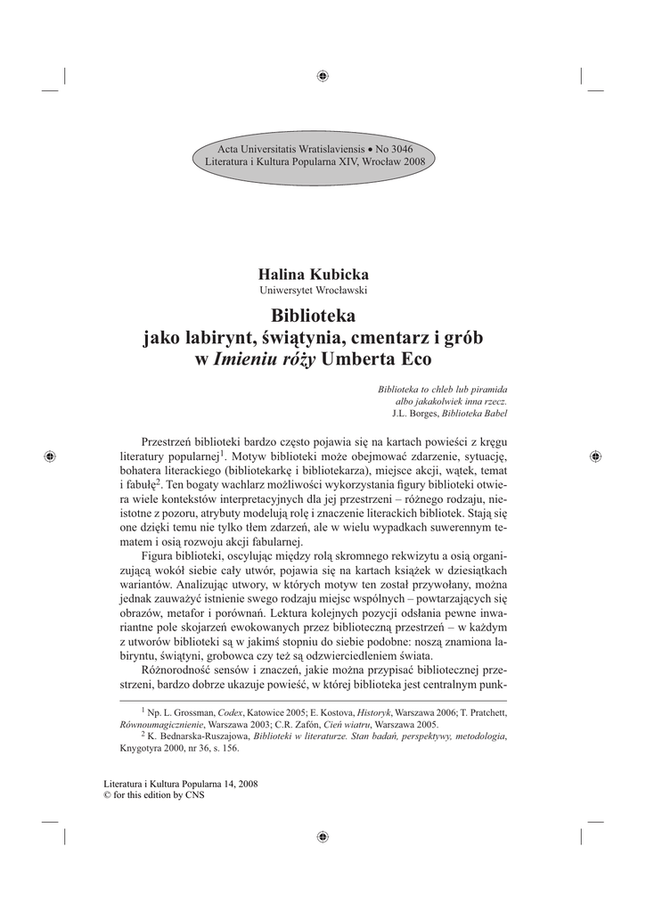 Acta Universitatis Wratislaviensis • No 3046 Literatura i Kultura Popularna XIV, Wrocław 2008 Halina Kubicka Uniwersytet Wrocławski Biblioteka jako labirynt, świątynia, cmentarz i grób w Imieniu róży Umberta Eco Biblioteka to chleb lub piramida albo jakakolwiek inna rzecz. J.L. Borges, Biblioteka Babel Przestrzeń biblioteki bardzo często pojawia się na kartach powieści z kręgu literatury popularnej1. Motyw biblioteki może obejmować zdarzenie, sytuację, bohatera literackiego (bibliotekarkę i bibliotekarza), miejsce akcji, wątek, temat i fabułę2. Ten bogaty wachlarz możliwości wykorzystania figury biblioteki otwiera wiele kontekstów interpretacyjnych dla jej przestrzeni – różnego rodzaju, nieistotne z pozoru, atrybuty modelują rolę i znaczenie literackich bibliotek. Stają się one dzięki temu nie tylko tłem zdarzeń, ale w wielu wypadkach suwerennym tematem i osią rozwoju akcji fabularnej. Figura biblioteki, oscylując między rolą skromnego rekwizytu a osią organizującą wokół siebie cały utwór, pojawia się na kartach książek w dziesiątkach wariantów. Analizując utwory, w których motyw ten został przywołany, można jednak zauważyć istnienie swego rodzaju miejsc wspólnych – powtarzających się obrazów, metafor i porównań. Lektura kolejnych pozycji odsłania pewne inwariantne pole skojarzeń ewokowanych przez biblioteczną przestrzeń – w każdym z utworów biblioteki są w jakimś stopniu do siebie podobne: noszą znamiona labiryntu, świątyni, grobowca czy też są odzwierciedleniem świata. Różnorodność sensów i znaczeń, jakie można przypisać bibliotecznej przestrzeni, bardzo dobrze ukazuje powieść, w której biblioteka jest centralnym punk1 Np. L. Grossman, Codex, Katowice 2005; E. Kostova, Historyk, Warszawa 2006; T. Pratchett, Równoumagicznienie, Warszawa 2003; C.R. Zafón, Cień wiatru, Warszawa 2005. 2 K. Bednarska-Ruszajowa, Biblioteki w literaturze. Stan badań, perspektywy, metodologia, Knygotyra 2000, nr 36, s. 156. Literatura i Kultura Popularna 14, 2008 © for this edition by CNS 24 Halina Kubicka tem, hipnotyzującym swym urokiem zarówno bohaterów utworu, jak i czytelników – Imię róży Umberta Eco. Biblioteka jako labirynt Jeden z mnichów zamieszkujących opactwo przedstawione w Imieniu róży mówi: „Biblioteka jest wielkim labiryntem, znakiem labiryntu świata”3. Biblioteczna przestrzeń opisana przez Eco ma pewne cechy fizyczne związane ze sferą labiryntu (ściany i regały tworzące zawiły rysunek trasy), a także wywołuje swoisty stan świadomości bohaterów, determinujący ich sposób postrzegania otaczającej rzeczywistości. Ten swoisty dualny status ontologiczny jest niejako wpisany w naturę labiryntu. Michał Głowiński pisze: „ta przestrzeń w równym stopniu jest, co znaczy”4. Labirynt więzi nie tylko ciało, ale i umysł. Bohaterowie Imienia róży, przestąpiwszy próg biblioteki, wkraczają w sferę obcości, której nie są w stanie przeniknąć ani zrozumieć. W ich świadomości pojawia się poczucie niebezpieczeństwa, z wolna przeradzające się w paraliżujący strach. Adso, wspominając błądzenie po korytarzach bibliotecznego gmachu, mówi: „bałem się [...]. Szedłem, jakby trawiła mnie gorączka, i nie wiedziałem nawet, dokąd chcę dotrzeć”5. Labiryntowa przestrzeń manipuluje bohaterami z taką łatwością, ponieważ nie są oni w żaden sposób przygotowani, by stawić czoła jej zasadzkom. Biblioteka jest dla nich wcieleniem doskonałości, lecz ku swemu zaskoczeniu zamiast do przybytku skonwencjonalizowanego ładu i porządku trafiają na wrogie i niebezpieczne terytorium. Schwytani w labiryntową pułapkę, wyraźnie dostrzegają pewien złowieszczy zamysł osaczającej ich przestrzeni, jednak nie są w stanie go zrozumieć. Paradoks ten obnaża zdumiewającą dwoistość labiryntu – bohaterowie wiedzą, że przestrzeń, która nimi zawładnęła, musi mieć jakiś system, lecz dla nich pozostaje on tajemnicą6. Ta pozorna sprzeczność wynika z różnych perspektyw percepcji rzeczywistości. Bohater zamknięty wewnątrz labiryntu postawiony jest wobec wyboru wielu możliwych dróg, jego perspektywa ogranicza się jedynie do przypadkowo zestawianych fragmentów. Ogląd całości jest możliwy tylko z perspektywy zewnętrznej, ale aby ją przyjąć, należy najpierw uwolnić się od roli więźnia, a to nie zawsze jest możliwe. 3 4 U. Eco, Imię róży, przeł. A. Szymanowski, Warszawa 1993, s. 183. M. Głowiński, Labirynt, przestrzeń obcości, [w:] idem, Mity przebrane, Kraków 1994, s. 131. 5 U. Eco, op. cit., s. 279. Ów paradoks syntezy kosmosu i chaosu ujawnia się już na płaszczyźnie fizycznej – labirynt to forma o precyzyjnej, logicznej organizacji, a jednocześnie bohaterom jawi się jako niezrozumiały i nieprzewidywalny kształt. 6 Literatura i Kultura Popularna 14, 2008 © for this edition by CNS Biblioteka jako labirynt, świątynia, cmentarz i grób – U. Eco, Imię róży 25 Eco doskonale przedstawia w swojej powieści ów paradoks. Bohaterowie, dopóki znajdują się wewnątrz biblioteki, nie są w stanie ogarnąć zawiłych przejść przez kolejne komnaty i z trudem udaje im się opuścić gmach. Gdy Wilhelm przygląda się budynkowi z zewnątrz, dostrzega jednak regułę porządkującą geometryczny model labiryntu. Ustaliwszy plan budynku, jest zdumiony, jak można zagubić się w gmachu zbudowanym „zgodnie z niebiańską harmonią”. Doskonale przejrzysty schemat wydaje się wykluczać labiryntowy nieporządek dróg, jaki panuje wewnątrz biblioteki. Wilhelm wyjaśnia i tę sprzeczność: „układ przejść nie odpowiada żadnemu prawu matematycznemu. Jedne pokoje dają dostęp do kilku innych, inne do jednego tylko. [...] Jeśli rozważysz ten element, [...] brak światła i brak wszelkiej wskazówki co do położenia słońca [...], zrozumiesz, czemu labirynt może zbić z pantałyku każdego, kto go przem