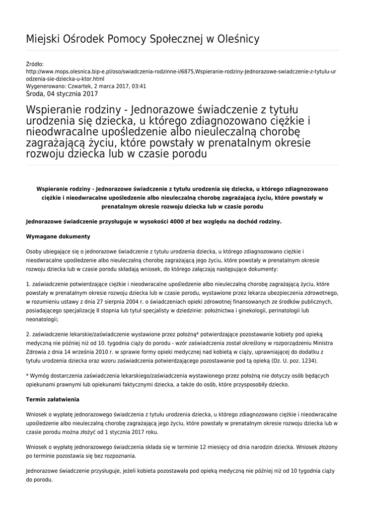 Miejski Ośrodek Pomocy Społecznej w Oleśnicy Źródło: http://www.mops.olesnica.bip-e.pl/oso/swiadczenia-rodzinne-i/6875,Wspieranie-rodziny-Jednorazowe-swiadczenie-z-tytulu-ur odzenia-sie-dziecka-u-ktor.html Wygenerowano: Czwartek, 2 marca 2017, 03:41 Środa, 04 stycznia 2017 Wspieranie rodziny - Jednorazowe świadczenie z tytułu urodzenia się dziecka, u którego zdiagnozowano ciężkie i nieodwracalne upośledzenie albo nieuleczalną chorobę zagrażającą życiu, które powstały w prenatalnym okresie rozwoju dziecka lub w czasie porodu Wspieranie rodziny - Jednorazowe świadczenie z tytułu urodzenia się dziecka, u którego zdiagnozowano ciężkie i nieodwracalne upośledzenie albo nieuleczalną chorobę zagrażającą życiu, które powstały w prenatalnym okresie rozwoju dziecka lub w czasie porodu Jednorazowe świadczenie przysługuje w wysokości 4000 zł bez względu na dochód rodziny. Wymagane dokumenty Osoby ubiegające się o jednorazowe świadczenie z tytułu urodzenia dziecka, u którego zdiagnozowano ciężkie i nieodwracalne upośledzenie albo nieuleczalną chorobę zagrażającą jego życiu, które powstały w prenatalnym okresie rozwoju dziecka lub w czasie porodu składają wniosek, do którego załączają następujące dokumenty: 1. zaświadczenie potwierdzające ciężkie i nieodwracalne upośledzenie albo nieuleczalną chorobę zagrażającą życiu, które powstały w prenatalnym okresie rozwoju dziecka lub w czasie porodu, wystawione przez lekarza ubezpieczenia zdrowotnego, w rozumieniu ustawy z dnia 27 sierpnia 2004 r. o świadczeniach opieki zdrowotnej finansowanych ze środków publicznych, posiadającego specjalizację II stopnia lub tytuł specjalisty w dziedzinie: położnictwa i ginekologii, perinatologii lub neonatologii; 2. zaświadczenie lekarskie/zaświadczenie wystawione przez położną* potwierdzające pozostawanie kobiety pod opieką medyczną nie później niż od 10. tygodnia ciąży do porodu - wzór zaświadczenia został określony w rozporządzeniu Ministra Zdrowia z dnia 14 września 2010 r. w sprawie formy opieki medycznej nad kobietą w ciąży, uprawniającej do dodatku z tytułu urodzenia dziecka oraz wzoru zaświadczenia potwierdzającego pozostawanie pod tą opieką (Dz. U. poz. 1234). * Wymóg dostarczenia zaświadczenia lekarskiego/zaświadczenia wystawionego przez położną nie dotyczy osób będących opiekunami prawnymi lub opiekunami faktycznymi dziecka, a także do osób, które przysposobiły dziecko. Termin załatwienia Wniosek o wypłatę jednorazowego świadczenia z tytułu urodzenia dziecka, u którego zdiagnozowano ciężkie i nieodwracalne upośledzenie albo nieuleczalną chorobę zagrażającą jego życiu, które powstały w prenatalnym okresie rozwoju dziecka lub w czasie porodu można złożyć od 1 stycznia 2017 roku. Wniosek o wypłatę jednorazowego świadczenia składa się w terminie 12 miesięcy od dnia narodzin dziecka. Wniosek złożony po terminie pozostawia się bez rozpoznania. Jednorazowe świadczenie przysługuje, jeżeli kobieta pozostawała pod opieką medyczną nie później niż od 10 tygodnia ciąży do porodu. Osoby uprawnione do świadczenia Jednorazowe świadczenie przysługuje : 1. matce, 2. ojcu, 3. opiekunowi faktycznemu dziecka (osoba faktycznie opiekująca się dzieckiem, jeżeli wystąpiła z wnioskiem do sądu opiekuńczego o przysposobienie dziecka) albo opiekunowi prawnemu dziecka. Jednorazowe świadczenie nie przysługuje jeżeli: 1. Osoba wnioskująca nie jest świadczeniobiorcą świadczeń opieki zdrowotnej lub osobą uprawnioną do świadczeń opieki zdrowotnej na podstawie przepisów o koordynacji - w rozumieniu przepisów ustawy z dnia 27 sierpnia 2004 r. o świadczeniach opieki zdrowotnej finansowanych ze środków publicznych (Dz. U. z 2016 r. poz. 1793, 1807, 1860, 1948, 2138 i 2173), 2. na dziecko, na które osoba wnioskuje o jednorazowe świadczenie, było pobierane w tej lub innej instytucji jednorazowe świadczenie, 3. dziecko, na które osoba wnioskuje o jednorazowe świadczenie, zostało umieszczone w pieczy zastępczej lub w domu pomocy społecznej zapewniającym nieodpłatne pełne utrzymanie, 4. członkowi rodziny przysługuje na dziecko jednorazowe świadczenie lub świadczenie o charakterze podobnym do jednorazowego świadczenia za granicą, chyba że przepisy o koordynacji systemów zabezpieczenia społecznego lub dwustronne umowy międzynarodowe o zabezpieczeniu społecznym stanowią inaczej, 5. wniosek o wypłatę jednorazowego świadczenia został złożony po terminie 12 miesięcy od dnia narodzin dziecka. 6. kobieta nie pozostawała pod opieką medyczną od 10 tygodnia ciąży. Metadane Data publikacji 04.01.2017 Rejestr zmian Podmiot udostępniający informację: Miejski Ośrodek Pomocy Społecznej w Oleśnicy Osoba wytwarzająca/odpowiadająca za informację: Osoba udostępniająca informację: Danuta Szczepanik Osoba modyfikująca informację: