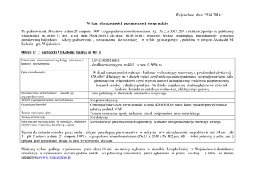 Wojciechów, dnia 25.04.2016 r. Wykaz nieruchomości przeznaczonej do sprzedaży Na podstawie art. 35 ustawy z dnia 21 sierpnia 1997 r. o gospodarce nieruchomościami (t.j. Dz.U.z 2013. 267 z późń.zm.) podaje do publicznej wiadomości na okres 21 dni , tj od dnia 28.04.2016 r. do dnia 18.05.2016 r. włącznie. Wykaz obejmujący nieruchomość gruntową zabudowaną budynkiem szkoły podstawowej , przeznaczoną do sprzedaży w trybie przetargowym , położoną w obrębie Szczuczki VI Kolonia gm. Wojciechów Obręb nr 17 Szczuczki VI Kolonia działka nr 40/11 Oznaczenie nieruchomości wg księgi wieczystej i katastru nieruchomości - LU1O/00032165/1 - działka ewidencyjna nr 40/11 o pow. 0,5656 ha Opis nieruchomości W skład nieruchomości wchodzi : budynek wolnostojący murowany o powierzchni użytkowej 828,40m² składający się z dwóch części: część niższą stanowi parterowa nie podpiwniczona sala gimnastyczna z łącznikiem, część wyższa stanowi jednopiętrowy częściowo podpiwniczony budynek szkolny z dachem płaskim . Na działce znajduje się studnia głębinowa ,zbiornik ścieków .Posiada on instalacje wodno-kan, elektryczną i gazową Teren położony w obszarach osadnictwa wiejskiego Przeznaczenie nieruchomości i sposób jej zagospodarowania Termin zagospodarowania nieruchomości Cena nieruchomości Nie przewiduje się Cena wywoławcza za nieruchomość wynosi 421000,00 zł netto, która zostanie powiększona o należny podatek VAT Termin wnoszenia opłat Termin wnoszenia opłaty za kupno przed podpisaniem aktu notarialnego Zasady aktualizacji Nie dotyczy Informacja o przeznaczeniu do sprzedaży, oddania w Nieruchomość przeznaczona do sprzedaży w drodze nieograniczonego przetargu ustnego użytkowanie wieczyste , dzierżawę , najem Termin do złożenia wniosku przez osoby , którym przysługuje pierwszeństwo w nabyciu w/w nieruchomości na podstawie art. 34 ust.1 pkt 1 i pkt 2 ustawy z dnia 21 sierpnia 1997 r. o gospodarce nieruchomościami (Dz.U. z 2010 r.Nr 102,poz. 651 – tekst jednolity z późn. zm. ) upływa po 6 tygodniach licząc od dnia wywieszenia wykazu Niniejszy wykaz podlega wywieszeniu przez okres 21 dni na tablicy ogłoszeń w siedzibie Urzędu Gminy w Wojciechowie dodatkowo informacja o wywieszeniu wykazu podana została do publicznej wiadomości przez ogłoszenie w prasie lokalnej , a także na stronie internetowej www.wojciechow.pl