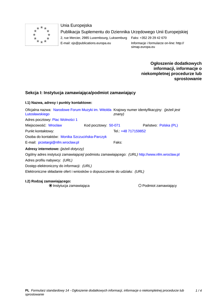 Unia Europejska Publikacja Suplementu do Dziennika Urzędowego Unii Europejskiej 2, rue Mercier, 2985 Luxembourg, Luksemburg Faks: +352 29 29 42 670 E-mail: [email protected] Informacje i formularze on-line: http:// simap.europa.eu Ogłoszenie dodatkowych informacji, informacje o niekompletnej procedurze lub sprostowanie Sekcja I: Instytucja zamawiająca/podmiot zamawiający I.1) Nazwa, adresy i punkty kontaktowe: Oficjalna nazwa: Narodowe Forum Muzyki im. Witolda Krajowy numer identyfikacyjny: (jeżeli jest Lutosławskiego znany) _____ Adres pocztowy: Plac Wolności 1 Miejscowość: Wrocław Kod pocztowy: 50-071 Punkt kontaktowy: _____ Państwo: Polska (PL) Tel.: +48 717159852 Osoba do kontaktów: Monika Szczucińska-Parczyk E-mail: [email protected] Faks: _____ Adresy internetowe: (jeżeli dotyczy) Ogólny adres instytucji zamawiającej/ podmiotu zamawiającego: (URL) http://www.nfm.wroclaw.pl Adres profilu nabywcy: (URL) _____ Dostęp elektroniczny do informacji: (URL) _____ Elektroniczne składanie ofert i wniosków o dopuszczenie do udziału: (URL) _____ I.2) Rodzaj zamawiającego: Instytucja zamawiająca Podmiot zamawiający PL Formularz standardowy 14 - Ogłoszenie dodatkowych informacji, informacje o niekompletnej procedurze lub sprostowanie 1/4 Sekcja II: Przedmiot zamówienia II.1.1) Nazwa nadana zamówieniu: Usługi sprzedaży(rezerwacja) biletów lotniczych na potrzeby Narodowego Forum Muzyki im. Witolda Lutosławskiego” II.1.2) Krótki opis zamówienia lub zakupu: (podano w pierwotnym ogłoszeniu) Usługi sprzedaży(rezerwacja) biletów lotniczych na potrzeby Narodowego Forum Muzyki im. Witolda Lutosławskiego” 350 biletów zagranicznych, 20 biletów krajowych II.1.3) Wspólny Słownik Zamówień (CPV) Główny przedmiot Słownik główny 63512000 Słownik uzupełniający (jeżeli dotyczy) PL Formularz standardowy 14 - Ogłoszenie dodatkowych informacji, informacje o niekompletnej procedurze lub sprostowanie 2/4 Sekcja IV: Procedura IV.1)Rodzaj procedury (podano w pierwotnym ogłoszeniu) Otwarta Ograniczona Ograniczona przyspieszona Negocjacyjna Negocjacyjna przyspieszona Dialog konkurencyjny Negocjacyjna z uprzednim ogłoszeniem Negocjacyjna bez uprzedniego ogłoszenia Negocjacyjna z publikacją ogłoszenia o zamówieniu Negocjacyjna bez publikacji ogłoszenia o zamówieniu Udzielenie zamówienia bez uprzedniej publikacji ogłoszenia o zamówieniu w Dzienniku Urzędowym Unii Europejskiej IV.2)Informacje administracyjne IV.2.1)Numer referencyjny: (podano w pierwotnym ogłoszeniu) ZP.PN.36.2016.NFM IV.2.2)Dane referencyjne ogłoszenia w przypadku ogłoszeń przesłanych drogą elektroniczną: Pierwotne ogłoszenie przesłane przez eNotices TED eSender Login: ENOTICES_ECAS_nszzucmo Dane referencyjne ogłoszenia: 2016-118271 rok i numer dokumentu IV.2.3)Ogłoszenie, którego dotyczy niniejsza publikacja: Numer ogłoszenia w Dz.U.: 2016/S 179-321594 z dnia: 16/09/2016 (dd/mm/rrrr) IV.2.4)Data wysłania pierwotnego ogłoszenia: 14/09/2016 (dd/mm/rrrr) PL Formularz standardowy 14 - Ogłoszenie dodatkowych informacji, informacje o niekompletnej procedurze lub sprostowanie 3/4 Sekcja VI: Informacje uzupełniające VI.1) Ogłoszenie dotyczy: Procedury niepełnej Sprostowania Informacji dodatkowych VI.2) Informacje na temat niepełnej procedury udzielenia zamówienia: Postępowanie o udzielenie zamówienia zostało przerwane Postępowanie o udzielenie zamówienia uznano za nieskuteczne Zamówienia nie udzielono Zamówienie może być przedmiotem ponownej publikacji VI.3) Informacje do poprawienia lub dodania : VI.3.1) Zmiana oryginalnej informacji podanej przez instytucję zamawiającą Publikacja w witrynie TED niezgodna z oryginalną informacją, przekazaną przez instytucję zamawiającą Oba przypadki VI.3.2) W ogłoszeniu pierwotnym W odpowiedniej dokumentacji przetargowej (więcej informacji w odpowiedniej dokumentacji przetargowej) W obu przypadkach (więcej informacji w odpowiedniej dokumentacji przetargowej) VI.3.3) Tekst, który należy poprawić w pierwotnym ogłoszeniu Miejsce, w którym znajduje się Zamiast: zmieniany tekst: Termin składania ofert IV.3.4) 20.9.2016-10:00 VI.3.4) Daty, które należy poprawić w pierwotnym ogłoszeniu Miejsce, w którym znajdują się Zamiast: zmieniane daty: Powinno być: Termin składania ofert 20.10.2016-10:00 Powinno być: VI.3.5) Adresy i punkty kontaktowe, które należy poprawić VI.3.6) Tekst, który należy dodać do pierwotnego ogłoszenia Miejsce, w którym należy dodać tekst: Tekst do dodania: VI.4) Inne dodatkowe informacje: _____ VI.5) Data wysłania niniejszego ogłoszenia: 19/09/2016 (dd/mm/rrrr) - ID:2016-119869 PL Formularz standardowy 14 - Ogłoszenie dodatkowych informacji, informacje o niekompletnej procedurze lub sprostowanie 4/4