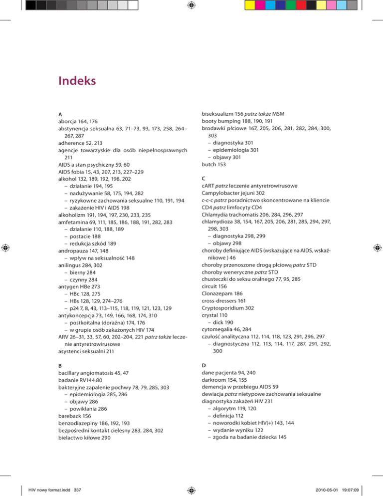 Indeks A aborcja 164, 176 abstynencja seksualna 63, 71–73, 93, 173, 258, 264– 267, 287 adherence 52, 213 agencje towarzyskie dla osób niepełnosprawnych 211 AIDS a stan psychiczny 59, 60 AIDS fobia 15, 43, 207, 213, 227–229 alkohol 132, 189, 192, 198, 202 – działanie 194, 195 – nadużywanie 58, 175, 194, 282 – ryzykowne zachowania seksualne 110, 191, 194 – zakażenie HIV i AIDS 198 alkoholizm 191, 194, 197, 230, 233, 235 amfetamina 69, 111, 185, 186, 188, 191, 282, 283 – działanie 110, 188, 189 – postacie 188 – redukcja szkód 189 andropauza 147, 148 – wpływ na seksualność 148 anilingus 284, 302 – bierny 284 – czynny 284 antygen HBe 273 – HBc 128, 275 – HBs 128, 129, 274–276 – p24 7, 8, 43, 113–115, 118, 119, 121, 123, 129 antykoncepcja 73, 149, 166, 168, 174, 310 – postkoitalna (doraźna) 174, 176 – w grupie osób zakażonych HIV 174 ARV 26–31, 33, 57, 60, 202–204, 221 patrz także leczenie antyretrowirusowe asystenci seksualni 211 biseksualizm 156 patrz także MSM booty bumping 188, 190, 191 brodawki płciowe 167, 205, 206, 281, 282, 284, 300, 303 – diagnostyka 301 – epidemiologia 301 – objawy 301 butch 153 B bacillary angiomatosis 45, 47 badanie RV144 80 bakteryjne zapalenie pochwy 78, 79, 285, 303 – epidemiologia 285, 286 – objawy 286 – powikłania 286 bareback 156 benzodiazepiny 186, 192, 193 bezpośredni kontakt cielesny 283, 284, 302 bielactwo kiłowe 290 D dane pacjenta 94, 240 darkroom 154, 155 demencja w przebiegu AIDS 59 dewiacja patrz nietypowe zachowania seksualne diagnostyka zakażeń HIV 231 – algorytm 119, 120 – definicja 112 – noworodki kobiet HIV(+) 143, 144 – wydanie wyniku 122 – zgoda na badanie dziecka 145 HIV nowy format.indd 337 C cART patrz leczenie antyretrowirusowe Campylobacter jejuni 302 c-c-c patrz poradnictwo skoncentrowane na kliencie CD4 patrz limfocyty CD4 Chlamydia trachomatis 206, 284, 296, 297 chlamydioza 38, 154, 167, 205, 206, 281, 285, 294, 297, 298, 303 – diagnostyka 298, 299 – objawy 298 choroby definiujące AIDS (wskazujące na AIDS, wskaźnikowe ) 46 choroby przenoszone drogą płciową patrz STD choroby weneryczne patrz STD chusteczki do seksu oralnego 77, 95, 285 circuit 156 Clonazepam 186 cross-dressers 161 Cryptosporidium 302 crystal 110 – dick 190 cytomegalia 46, 284 czułość analityczna 112, 114, 118, 123, 291, 296, 297 – diagnostyczna 112, 113, 114, 117, 287, 291, 292, 300 2010-05-01 19:07:09 338 – – małoletniego 145 diagnoza neuropsychologiczna 231 dirty seks 155 dostępność sterylnych igieł i strzykawek 242 drag kings 161 – queens 156, 161, 162 dry seks 165 dyslipidemia 55 dysplazja szyjki macicy 45, 47, 49 E edukacja seksualna 9, 15, 16, 25, 64, 72, 73, 98, 99, 149, 157, 171, 183, 200, 205, 210, 216, 242, 264, 269, 271, 281, 283, 305 EIA patrz test immunoenzymatyczny ekshibicjonizm 163 ekspozycja 73, 79, 103, 106, 110, 111, 126–129, 144, 213 – podstawowe czynności po 127, 129 – rodzaje 104 ekspozycje incydentalne 127 – kryminalne 127 – niezawodowe 103, 107, 127, 130 – zawodowe 92, 95, 103, 106, 128, 130, 203, 214 ekstazy 188–190 Entamoeba histolytica 302 epidemia HIV/AIDS 19, 25, 26, 28, 29, 31–33, 65, 72, 77, 78, 82, 84, 89, 92, 137, 154, 155, 158, 185, 219, 242, 245, 248, 262, 263, 283, 290, 306 – Afryka 20 – Ameryka Południowa 21 – Ameryka Środkowa 21 – Australia i Nowej Zelandia 22 – Azja 22 – Europa Wschodnia 22 – IDU 27 – Karaiby 21 – MSM 32, 155, 156 – Polska 23 – typy 20 – Unii Europejska 22 – USA 21 epidemiologia HIV 19, 21, 92, 168, 185, 203 – a seks turystyka 218, 219 – IDU 66, 158 – MSM 158, 159 – osoby w starszym wieku 150 – wojsko 205, 206 epidemiologia STD 281 Enterobius vermicularis 302 Escapelle 174 patrz także antykoncepcja postkoitalna HIV nowy format.indd 338 Indeks etyka zawodowa 240, 241 F fellatio 77, 283, 295, 302 – bierne 283, 284 – czynne 283, 284 femme 153 fenotypowanie 124 fist fucking 154, 155 fisting 105, 284, 285 – bierny lub wprowadzenie ciał obcych do odbytu 284 flunitrazepam 192, 193 patrz także Rohypnol, pigułki gwałtu FTA patrz odczyn immunofluorescencji krętków FTA-ABS patrz modyfikacja absorpcyjna odczynu immunofluorescencji krętków G gay bowel syndrome 282, 302 genotypowanie 29, 124, 129 GHB 192, 193 patrz także kwas gamma-hydroksymasłowy, pigułki gwałtu Giardia lamblia 302 GUD patrz owrzodzenia narządów płciowych gwałt 127, 131, 143, 164, 168, 174–177, 181, 192, 193, 200, 205, 271, 294 – na prostytutce 181 – ofiary 174, 176, 177 – – pomoc psychologiczna 177 H HAART patrz wysoce aktywna terapia antyretrowirusowa, patrz także leczenie antyretrowirusowe hasbians 153 HAV patrz wirusowe zapalenie wątroby typu A HBeAg 275 patrz także antygen HBe HBsAg 167, 207, 274, 275 patrz także antygen HBs HBV patrz wirusowe zapalenie wątroby typu B HBV DNA 275 HCV patrz wirusowe zapalenie wątroby typu C HCV RNA 278 HDV patrz wirusowe zapalenie wątroby typu D heroina 66, 185 – fazy uzależnienia 185 – objawy odstawienia 185 Herpes simplex 46, 299 hiperseksualność 164 HIV – badanie 10, 11, 24, 26, 29, 33, 72, 82, 83, 85, 88, 92, 94, 95, 112, 137, 161, 173, 176, 177, 183, 184, 187, 2010-05-01 19:07:10 Indeks 188, 194, 201, 209, 212, 216, 219, 220, 227, 237, 239, 244–249, 253, 255, 257–260, 262, 274, 307 – – u kobiety w ciąży – – – moment wykonania badania 140, 142 – – – wynik nieujemny 140 – – u partnera kobiety w ciąży 141 – częstość występowania w zakładach karnych 199 – faza bezobjawowa zakażenia a stan psychiczny 57, 58 – – objawowa zakażenia a stan psychiczny 59 – informacje w Internecie 250 – informowanie innych osób 138 – klasyfikacja stadiów zakażenia 47 – kobiety w czasie ciąży lub porodu 143 – konieczność poinformowania 137 – leczenie patrz leczenie antyretrowirusowe – materiał niezakaźny 35 – – zakaźny 35 – monitorowanie przebiegu zakażenia 1