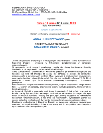 FILHARMONIA ŚWIĘTOKRZYSKA IM. OSKARA KOLBERGA w KIELCACH Ul. Żeromskiego 12, tel. (0-41) 365-54-99, 368-11-91 tel/fax www.filharmonia.kielce.com.pl zaprasza: Piątek, 12 lutego 2016, godz. 19.00 Sala Koncertowa KONCERT WALENTYNKOWY (Koncert symfoniczny oznaczony symbolem B – specjalny) ANNA JURKSZTOWICZ śpiew ORKIESTRA SYMFONICZNA FŚ KRZESIMIR DĘBSKI dyrygent Jedna z najbardziej znanych par w muzycznym show biznesie – Anna Jurksztowicz i Krzesimir Dębski – wystąpią w Filharmonii Świętokrzyskiej w koncercie walentynkowym. W programie, obok znanych przebojów, znajdą się utwory inspirowane filozofią Wschodu, a także piosenki z repertuaru Elvisa Presleya. Anna Jurksztowicz – piosenkarka i wokalistka jazzowa, po świetnie rozwijającej się karierze, na kilka lat zniknęła ze sceny, nie oznacza to jednak, że całkowicie zrezygnowała z zawodowych ambicji. Była wydawcą i producentem muzycznym, nagrywała dubbing i piosenki do seriali (kto nie zna czołówki z Rancza?!). W 2014 powróciła z nową płytą Poza czasem poświęconą kontemplacji i duchowym praktykom. Na koncertach, których ma bez liku w całej Polsce, chętnie przypomina swoje dawne hity. I … tworzy. W zanadrzu chowa nowe teksty, wymyśla programy, tłumaczy obce teksty piosenek… A Krzesimir Dębski – prywatnie mąż Anny Jurksztowicz? Jak mówi, pracował w każdej branży: był muzykiem rockowym, znakomitym skrzypkiem jazzowym, ale jego świat to muzyka poważna i cieszy się, gdy jego „utwory są grane na normalnych koncertach filharmonicznych, a nie tylko na festiwalach”. Tymczasem jednak na naszej estradzie wystąpi w roli dyrygenta, kompozytora i aranżera piosenek żony. Duet Anna Jurksztowicz i Krzesimir Dębski to gwarancja udanego muzycznego wieczoru, szczególnie takiego, który adresowany jest do wszystkich zakochanych – tych chwilowo solo i szczęśliwych par. ANNA JURKSZTOWICZ Wokalistka jazzowa i piosenkarka; jej kariera wokalna rozpoczęła się w wieku szkolnym w Szczecinie w amatorskim zespole wokalnym muzyki dawnej Musicus Poloniensis. Śpiewu klasycznego uczyła się w średniej Szkole Muzycznej w Szczecinie, porzuciła jednak belcanto w wyniku fascynacji jazzem i muzyką pop. W wieku 16 lat występowała już na estradach zawodowo obok największych gwiazd polskiej estrady. W 1985 zdobyła I nagrodę podczas Festiwalu w Opolu za piosenkę Diamentowy kolczyk. Reprezentowała polską piosenkę na festiwalach w Dreźnie (NRD) w 1986, Curaçao (Antyle Holenderskie) w 1988, Jurmala (Łotwa) w 1989, Karlshamn (Szwecja) w 1990, Siracusa (Włochy) i w Stambule (Turcja) w 1991oraz w Kairze (Egipt) w 1995. Nagrała piosenki do filmów i seriali TV, takich jak: Kingsajz, W pustyni i w puszczy, Czułość i kłamstwa, Matki, żony i kochanki, Na dobre i na złe, Więzy krwi, Ranczo. Występuje także z programami rozrywkowymi dla dzieci. W jej repertuarze znajdują się także utwory z kręgu muzyki spirituals & gospels, kantyczki karmelitańskie, hinduskie mantry oraz klasyczne i współczesne pieśni do tekstów wybitnych poetów. Obecnie publiczność filharmoniczna oklaskuje ją w programach z muzyką filmową, oraz w „Mozart Smooth Jazz” – projekcie zrealizowanym we współpracy z berlińskim pianistą Rolfem Zilke, zawierającym pieśni i arie W. A. Mozarta wykonywane w aranżacjach jazzowych w oryginalnym języku włoskim i niemieckim lub po polsku w autorskim przekładzie śpiewaczki. Jest wydawcą i producentem muzycznym. W serii płytowej poświęconej muzyce współczesnej Modern Classics from Poland jej firma wydawnicza Si Music promuje twórczość kompozytorów polskich. KRZESIMIR DĘBSKI Kompozytor, dyrygent, skrzypek jazzowy, aranżer i producent muzyczny; studiował kompozycję w klasie Andrzeja Koszewskiego oraz dyrygenturę pod kierunkiem Witolda Krzemieńskiego. Jest laureatem m. in. Światowego Konkursu Jazzowego w Hoeillart w Belgii, Konkursu Kompozytorskiego z okazji 25-lecia Festiwalu Polskiej Muzyki Współczesnej „Poznańska Wiosna Muzyczna", w latach 80. w ankietach magazynu Jazz Forum wielokrotnie zdobywał tytuł "Najlepszego Skrzypka", "Najlepszego Kompozytora" oraz "Najlepszego Aranżera Roku". W 1985 znalazł się na liście dziesięciu najlepszych skrzypków jazzowych amerykańskiego pisma Down Beat. Był nominowany do nagrody Genie Award (muzyka do filmu Young Magican) oraz do nagrody Emmy Award (film Maszyna zmian). Nagrał ponad 30 albumów ze swoimi kompozycjami. Od 1986 artysta ograniczył działalność koncertową, poświęcając się głównie twórczości kompozytorskiej (napisał ponad 50 utworów symfonicznych i kameralnych – 2 symfonie, operę, 4 oratoria, utwory religijne, 11 koncertów instrumentalnych). Tworzy również muzykę teatralną (ponad 40 premier), eksperymentalną i filmową (50 filmów). W 2000 otrzymał nagrodę Fryderyk w kategorii "Kompozytor Roku" oraz nagrodę Międzynarodowej Akademii Filmowej "Philip Award" za muzykę do filmu Ogniem i mieczem. W 2001 na Międzynarodowym Festiwalu Filmowym w Pyrgos w Grecji otrzymał nagrodę za muzykę do filmu W pustyni i w puszczy. W 2005 artysta otrzymał zamówienie od hollywoodzkiej wytwórni LimeLight Films na skomponowanie nowej muzyki do niemych filmów Charlie Chaplina z lat 1914-17. Ostatnio również dyryguje na koncertach z udziałem takich gwiazd, jak: Jose Carreras, Jose Cura, Ewa Małas–Godlewska, Adam Makowicz, Canadian Brass, Vadim Riepin, J. L. Ponty, Mark O’Connor, John Blake i Nigel Kennedy. Sponsorzy Filharmonii: MINISTERSTWO KULTURY I DZIEDZICTWA NARODOWEGO – dofinansowano ze środków Ministra Kultury i Dziedzictwa Narodowego AMBIENTE MZK Kielce KWIACIARNIA SZAROTKA Bilety w cenie: 35-normalny, 28-ulgowy – do nabycia w kasie Filharmonii w godz. od 9.00 do 17.00, a w dniu koncertu od godz. 9.00 do momentu rozpoczęcia koncertu. 15 stycznia, piątek, g. 19.00, sala koncertowa Z BATUTĄ I HUMOREM PO ŚWIECIE MILENA LANGE sopran ADAM SZERSZEŃ 