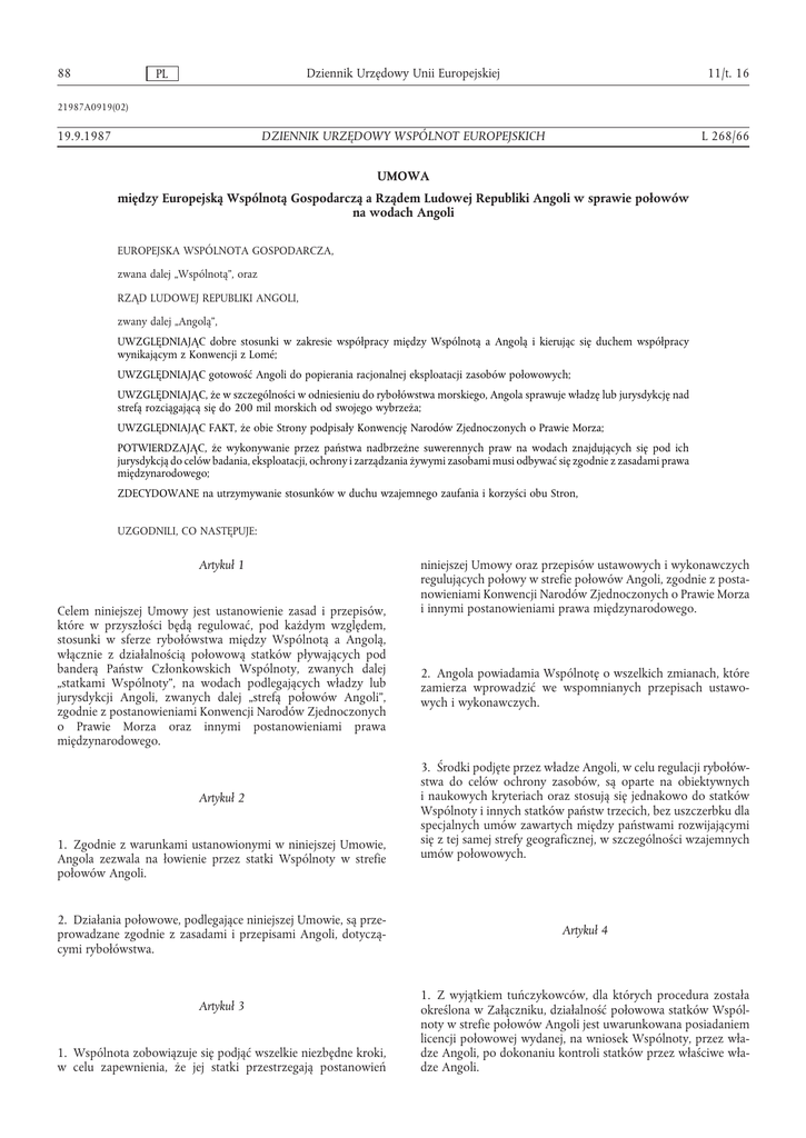 88 Dziennik Urzędowy Unii Europejskiej 11/t. 16 DZIENNIK URZĘDOWY WSPÓLNOT EUROPEJSKICH L 268/66 PL 21987A0919(02) 19.9.1987 UMOWA między Europejską Wspólnotą Gospodarczą a Rządem Ludowej Republiki Angoli w sprawie połowów na wodach Angoli EUROPEJSKA WSPÓLNOTA GOSPODARCZA, zwana dalej „Wspólnotą”, oraz RZĄD LUDOWEJ REPUBLIKI ANGOLI, zwany dalej „Angolą”, UWZGLĘDNIAJĄC dobre stosunki w zakresie współpracy między Wspólnotą a Angolą i kierując się duchem współpracy wynikającym z Konwencji z Lomé; UWZGLĘDNIAJĄC gotowość Angoli do popierania racjonalnej eksploatacji zasobów połowowych; UWZGLĘDNIAJĄC, że w szczególności w odniesieniu do rybołówstwa morskiego, Angola sprawuje władzę lub jurysdykcję nad strefą rozciągającą się do 200 mil morskich od swojego wybrzeża; UWZGLĘDNIAJĄC FAKT, że obie Strony podpisały Konwencję Narodów Zjednoczonych o Prawie Morza; POTWIERDZAJĄC, że wykonywanie przez państwa nadbrzeżne suwerennych praw na wodach znajdujących się pod ich jurysdykcją do celów badania, eksploatacji, ochrony i zarządzania żywymi zasobami musi odbywać się zgodnie z zasadami prawa międzynarodowego; ZDECYDOWANE na utrzymywanie stosunków w duchu wzajemnego zaufania i korzyści obu Stron, UZGODNILI, CO NASTĘPUJE: Artykuł 1 Celem niniejszej Umowy jest ustanowienie zasad i przepisów, które w przyszłości będą regulować, pod każdym względem, stosunki w sferze rybołówstwa między Wspólnotą a Angolą, włącznie z działalnością połowową statków pływających pod banderą Państw Członkowskich Wspólnoty, zwanych dalej „statkami Wspólnoty”, na wodach podlegających władzy lub jurysdykcji Angoli, zwanych dalej „strefą połowów Angoli”, zgodnie z postanowieniami Konwencji Narodów Zjednoczonych o Prawie Morza oraz innymi postanowieniami prawa międzynarodowego. Artykuł 2 1. Zgodnie z warunkami ustanowionymi w niniejszej Umowie, Angola zezwala na łowienie przez statki Wspólnoty w strefie połowów Angoli. 2. Działania połowowe, podlegające niniejszej Umowie, są przeprowadzane zgodnie z zasadami i przepisami Angoli, dotyczącymi rybołówstwa. Artykuł 3 1. Wspólnota zobowiązuje się podjąć wszelkie niezbędne kroki, w celu zapewnienia, że jej statki przestrzegają postanowień niniejszej Umowy oraz przepisów ustawowych i wykonawczych regulujących połowy w strefie połowów Angoli, zgodnie z postanowieniami Konwencji Narodów Zjednoczonych o Prawie Morza i innymi postanowieniami prawa międzynarodowego. 2. Angola powiadamia Wspólnotę o wszelkich zmianach, które zamierza wprowadzić we wspomnianych przepisach ustawowych i wykonawczych. 3. Środki podjęte przez władze Angoli, w celu regulacji rybołówstwa do celów ochrony zasobów, są oparte na obiektywnych i naukowych kryteriach oraz stosują się jednakowo do statków Wspólnoty i innych statków państw trzecich, bez uszczerbku dla specjalnych umów zawartych między państwami rozwijającymi się z tej samej strefy geograficznej, w szczególności wzajemnych umów połowowych. Artykuł 4 1. Z wyjątkiem tuńczykowców, dla których procedura została określona w Załączniku, działalność połowowa statków Wspólnoty w strefie połowów Angoli jest uwarunkowana posiadaniem licencji połowowej wydanej, na wniosek Wspólnoty, przez władze Angoli, po dokonaniu kontroli statków przez właściwe władze Angoli. 11/t. 16 Dziennik Urzędowy Unii Europejskiej PL 2. Wydanie licencji jest uzależnione od wniesienia stosownej opłaty przez danego właściciela statku. 3. Procedura składania wniosków o wydanie licencji, wysokość opłaty i tryb płatności zostały określone w Załączniku. 89 Artykuł 10 Jeżeli władze Angoli zadecydują w skutek rozwoju stanu zasobów o podjęciu środków ochronnych, które mają wpływ na działalność statków Wspólnoty, należy przeprowadzić konsultacje między Stronami w celu przyjęcia Załącznika i Protokołu do niniejszej Umowy, uwzględniając rekompensatę finansową dotychczas wypłaconą przez Wspólnotę. Artykuł 5 Strony zobowiązują się do przeprowadzania wzajemnych konsultacji, bądź bezpośrednio bądź w ramach organizacji międzynarodowych, w celu zapewnienia ochrony i zarządzania żywymi zasobami w Oceanie Atlantyckim. Strony dokładają wszelkich starań w celu ustanowienia współpracy między rybackimi instytutami badawczymi w Angoli i w Państwach Członkowskich Wspólnoty w odniesieniu do programów badawczych i wymiany informacji. Artykuł 6 Statki uprawnione do prowadzenia połowów w strefie połowów Angoli, w ramach niniejszej Umowy przekazują właściwym władzom Angoli raporty połowowe, zgodnie z procedurą przewidzianą w Załączniku. Artykuł 7 W zamian za możliwości połowowych przyznanych na mocy artykułu 2, Wspólnota wypłaca Angoli, zgodnie z warunkami i ustaleniami zastrzeżonymi w Protokole załączonym do niniejszej Umowy, rekompensatę finansową, bez uszczerbku dla finansowania otrzymywanego przez Angolę na mocy Konwencji z Lomé. Artykuł 8 Strony zgadzają się rozpocząć konsultacje w przypadku sporów dotyczących wykładni lub stosowania niniejszej Umowy. Artykuł 11 Żadne postanowienie niniejszej Umowy nie może w jakikolwiek sposób wpływać ani naruszać stanowiska którejkolwiek ze Stron w odniesieniu do kwestii związanych z prawem morza. Artykuł 12 Niniejszą Umowę stosuje się, z jednej strony na terytorium Ludowej Republiki Angoli oraz z drugiej strony, na terytoriach, na których ma zastosowanie Traktat ustanawiający Europejską Wspólnotę Gospodarczą i na warunkach określonych w tym Traktacie. Artykuł 13 Załącznik i Protokół stanowią integralną część niniejszej Umowy oraz każde odniesienie do niniejszej Umowy stanowi również odniesienie do Załącznika i Protokołu. Artykuł 14 Niniejsza Umowa zostaje zawarta na wstępny okres trzech lat od dnia jej wejścia w życie. O ile jedna ze Stron 
