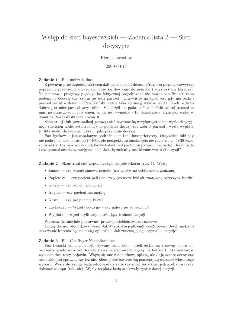 Wstęp do sieci bayesowskich — Zadania lista 2 — Sieci decyzyjne Piersa Jarosław 2009-03-17 Zadanie 1 Plik umbrella.dne. Z pewnym prawdopodobieństwem dziś będzie padał deszcz. Prognoza pogody zazwyczaj poprawnie przewiduje ulewę, ale może się dowolnie źle pomylić (patrz system Lorenza). Na podstawie prognozy pogody (bo faktycznej pogody znać nie może) pan Iksiński rano podejmuje decyzję czy zabrać ze sobą parasol. Oczywiście najlepiej jest gdy nie pada i parasol został w domu — Pan Iksiński ocenia taką wytuację wysoko +100. Jeżeli pada to dobrze jest mieć parasol przy sobie +80. Jeżeli nie pada, a Pan Iksiński zabrał parasol to musi go nosić ze sobą cały dzień, co nie jest wygodne +10. Jeżeli pada, a parasol został w domu to Pan Iksiński przemoknie 0. Skonstruuj (lub przeanalizuj gotową) sieć bayesowską z wykorzystaniem węzła decyzyjnego (decision node, action node) do podjęcia decyzji czy zabrać parasol i węzła wypłaty (utility node) do liczenia „zysku” jaką przyniesie decyzja. Pan Igerkowski jest zapalonym podróżnikiem i ma inne priorytety. Oczywiście lubi gdy nie pada i nie nosi parasolki (+100), ale perspektywa zmoknięcia nie przeraża go (+20 jeżeli zmoknie) aż tak bardzo jak dodatkowy balast (+0 jeżeli nosi parasol i nie pada). Jeżeli pada i ma parasol ocenia sytuację na +40. Jak się zmieniły oczekiwane wartości decyzji? Zadanie 2 Skonstruuj sieć wspomagającą decyzje lekarza (rys. 1). Węzły: • Zimno — czy panuje zimowa pogoda (ma wpływ na osłabienie organizmu) • Papierosy — czy pacjent pali papierosy (co może być alternatywną przyczyną kaszlu) • Grypa — czy pacjent ma grypę • Angina — czy pacjent ma anginę • Kaszel — czy pacjent ma kaszel • CzyLeczyć — Węzeł decyzyjny - czy należy pojąć leczenie? • Wypłata — węzeł utylitarny określający trafność decyzji Wybierz „intuicyjnie poprawne” prawdopodobieństwa warunkowe. Dodaj do sieci dodatkowy węzeł JakWysokoPacjentCeniSwojeZdrowie. Jeżeli nisko to stosowanie leczenia będzie mniej opłacalne. Jak zmieniają się optymalne decyzje? Zadanie 3 Plik Car Buyer Neapolitan.dne. Pan Iksiński zamierza kupić używany samochód. Jeżeli będzie on sprawny sporo zaoszczędzi, jeżeli okaże się złomem straci na naprawach więcej niż był wart. Ma możliwość wykonać dwa testy pojazdu. Wiązą się one z dodatkową opłatą, ale dają szansę oceny czy samochód jest sprawny czy też nie. Zbuduj sieć bayesowską pomagającą dokonać właściwego wyboru. Węzły decyzyjne będą odpowiadały za to czy robić testy (nie, jeden, oba) oraz czy dokonać zakupu (tak, nie). Węzły wypłaty będą szacowały zysk z danej decyzji. 1 Rysunek 1: Przykładowa sieć do zadania 2. Zadanie 4 Przebuduj sieci do zadań Monty Halla z poprzedniej listy tak by wykorzystywały węzły decyzyjne i utylitarne Zadanie programistyczne Zaimplementuj algorytm ważonego próbkowania logicznego. Program powinien działać na sieci bayesowskiej ustalonej na stałe, wczytanej z pliku konfiguracyjnego, wylosowanej, wyklikanej w edytorze sieci etc. Wymagana jest możliwość edycji tabel prawdopodobieństw warunkowych (np. poprzez plik konfiguracyjny albo specjalne okno w programie) oraz możliwość wprowadzenia wiedzy E do sieci (poprzez wiedzę rozumiemy możliwość ustalenia przyjętego stanu dla każdego węzła w każdym niepełnym podzbiorze węzłów sieci). Dla określonego przez użytkownika węzła A (lub dla każdego węzła), który nie zawiera wiedzy E, program wyświetli rozkład prawdopodobieństwa stanów przyjmowanych przez A pod waunkiem wiedzy E tj. ∀i P(A = ai |E) Mile widziane są dodatkowe opcje np. edytor sieci, tryb „piaskownicy”, połączenie z poprzednim zadaniem, praktyczne zastosowanie (np. wirtualny lekarz pytający się o symptomy i wystawiający diagnozę) itp. Punktacja — 1 punkt. Język programowania — dowolny, ale proszę nie korzystać z gotowych bibliotek dla sieci bayesowskich. Termin oddawania — 2009.04.21. Algorytm Dane: sieć bayesowska, wiedza E, węzeł sieci X ∈ / E. Wynik: Pozkład prawdopodobieństwa P(X = xi |E) 1. Powtarzaj dla j = 1..m razy: • Przypisz wagaj := 1; 2 • Umieść w liściach losowe wartości zgdnie z prawdopodobieństwami apriori. Jeżeli w liściu jest wiedza przypisz wartość wiedzy bez losowania i przemnóż wage przez prawdopodobieństwo, że liść przyjmie dany stan (wynikający z wiedzy) • Rekurencyjnie wylosuj wartości węzłów dla kolejnych pokoleń. Jeżeli w danym węźle jest wiedza to przypisz wartość wynikającą z wiedzy bez losowania i przemnóż wagej przez prawdopodobieńswo, że węzeł przyjmnie stan wynikający z wiedzy pod warunkiem wartości przyjętych przez jego rodziców (ustaleni w poprzednich krokach). Można odczytać z tabeli prawdopodobieństw warunkowych. • Zapamiętaj wyniki razem z wagą (aj1 , ..., ajn , wagaj ). 2. Dla danego węzła X, który nie zawiera wiedzy E prawdopodobieństwo, że X przyjmuje stan xi jest średnią ważoną przypadków, w których wartość węzła X została przyjęta jako xi z wagą w Pm j j=1 1ajk =xi · waga Pm P(X = xi |E) = j j=1 waga jeżeli ak opisuje stan węzła X. UWAGA: jeżeli wiedza jest sprzeczna to mianownik będzie zerowy. 3