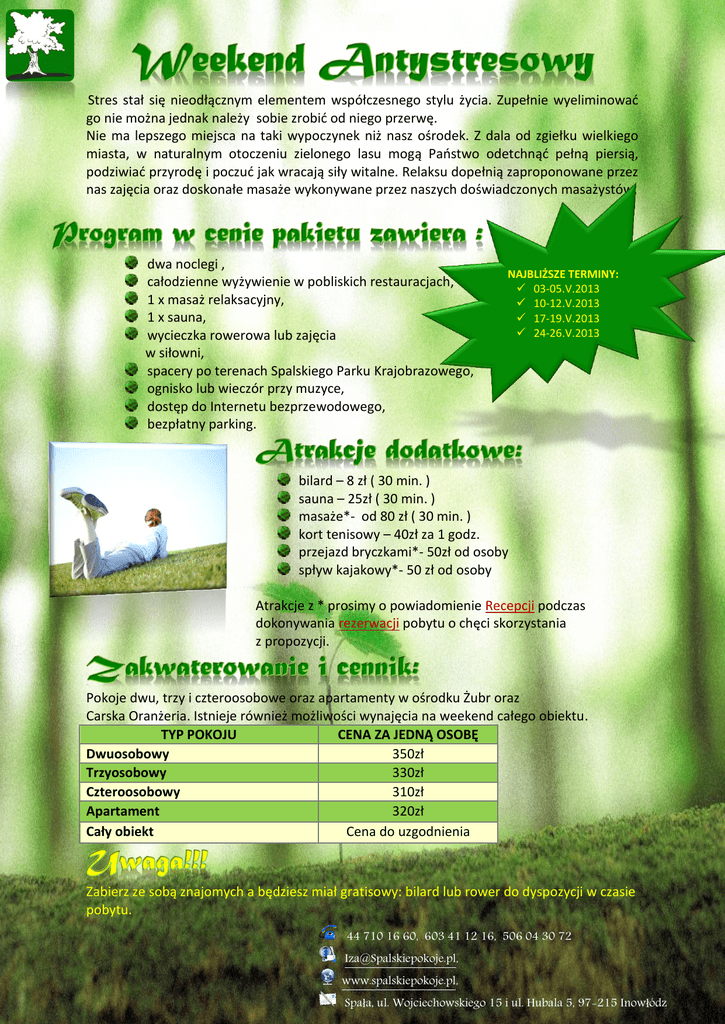 Stres stał się nieodłącznym elementem współczesnego stylu życia. Zupełnie wyeliminować go nie można jednak należy sobie zrobić od niego przerwę. Nie ma lepszego miejsca na taki wypoczynek niż nasz ośrodek. Z dala od zgiełku wielkiego miasta, w naturalnym otoczeniu zielonego lasu mogą Państwo odetchnąć pełną piersią, podziwiać przyrodę i poczuć jak wracają siły witalne. Relaksu dopełnią zaproponowane przez nas zajęcia oraz doskonałe masaże wykonywane przez naszych doświadczonych masażystów. dwa noclegi , całodzienne wyżywienie w pobliskich restauracjach, 1 x masaż relaksacyjny, 1 x sauna, wycieczka rowerowa lub zajęcia w siłowni, spacery po terenach Spalskiego Parku Krajobrazowego, ognisko lub wieczór przy muzyce, dostęp do Internetu bezprzewodowego, bezpłatny parking. NAJBLIŻSZE TERMINY: 03-05.V.2013 10-12.V.2013 17-19.V.2013 24-26.V.2013 bilard – 8 zł ( 30 min. ) sauna – 25zł ( 30 min. ) masaże*- od 80 zł ( 30 min. ) kort tenisowy – 40zł za 1 godz. przejazd bryczkami*- 50zł od osoby spływ kajakowy*- 50 zł od osoby Atrakcje z * prosimy o powiadomienie Recepcji podczas dokonywania rezerwacji pobytu o chęci skorzystania z propozycji. Pokoje dwu, trzy i czteroosobowe oraz apartamenty w ośrodku Żubr oraz Carska Oranżeria. Istnieje również możliwości wynajęcia na weekend całego obiektu. TYP POKOJU CENA ZA JEDNĄ OSOBĘ Dwuosobowy 350zł Trzyosobowy 330zł Czteroosobowy 310zł Apartament 320zł Cały obiekt Cena do uzgodnienia Zabierz ze sobą znajomych a będziesz miał gratisowy: bilard lub rower do dyspozycji w czasie pobytu. 44 710 16 60, 603 41 12 16, 506 04 30 72 [email protected], www.spalskiepokoje.pl, Spała, ul. Wojciechowskiego 15 i ul. Hubala 5, 97-215 Inowłódz