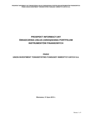 PROSPEKT INFORMACYJNY ŚWIADCZENIA USŁUG ZARZĄDZANIA PORTFELEM INSTRUMENTÓW FINANSOWYCH PRZEZ UNION INVESTMENT TOWARZYSTWO FUNDUSZY INWESTYCYJNYCH S.A. PROSPEKT INFORMACYJNY ŚWIADCZENIA USŁUG ZARZĄDZANIA PORTFELEM INSTRUMENTÓW FINANSOWYCH PRZEZ UNION INVESTMENT TOWARZYSTWO FUNDUSZY INWESTYCYJNYCH S.A. Warszawa, 31 lipca 2013 r. Strona 1 z 9 PROSPEKT INFORMACYJNY ŚWIADCZENIA USŁUG ZARZĄDZANIA PORTFELEM INSTRUMENTÓW FINANSOWYCH PRZEZ UNION INVESTMENT TOWARZYSTWO FUNDUSZY INWESTYCYJNYCH S.A. Niniejszy dokument zawiera informacje dotyczące Union Investment Towarzystwa Funduszy Inwestycyjnych Spółki Akcyjnej (dalej: „Towarzystwo”) oraz usług zarządzania portfelami, w skład których wchodzi jeden lub większa liczba instrumentów finansowych (dalej: „zarządzanie portfelami”). Niniejszy dokument udostępniany jest Klientom Towarzystwa przed zawarciem z Klientami umowy o zarządzanie portfelem. Klient, przed zawarciem umowy o zarządzanie portfelem z Towarzystwem powinien zapoznać się również z postanowieniami Regulaminu świadczenia usług zarządzania portfelami instrumentów finansowych przez Union Investment Towarzystwo Funduszy Inwestycyjnych S.A. (dalej: „Regulamin”) określającego szczegółowe zasady świadczenia usługi zarządzania portfelem. FIRMA TOWARZYSTWA. INFORMACJE O TOWARZYSTWIE. Towarzystwo działa pod firmą Union Investment Towarzystwo Funduszy Inwestycyjnych S.A. Towarzystwo jest częścią Grupy Union Investment funkcjonującej od 1956 roku. Właścicielem 100% Towarzystwa jest europejska spółka inwestycyjna Union Asset Management Holding AG z siedzibą we Frankfurcie nad Menem. Towarzystwo działa na podstawie przepisów ustawy z dnia 27 maja 2004 r. o funduszach inwestycyjnych (Dz. U. Nr 146, poz. 1546, ze zm.), aktów wykonawczych do tej ustawy oraz innych obowiązujących przepisów prawa. Towarzystwo prowadzi działalność w zakresie: tworzenia funduszy inwestycyjnych i zarządzania nimi, zarządzania portfelami, doradztwa inwestycyjnego, pośrednictwa w zbywaniu i odkupywaniu jednostek uczestnictwa funduszy inwestycyjnych utworzonych przez inne towarzystwa lub tytułów uczestnictwa funduszy zagranicznych, pełnienia funkcji przedstawiciela funduszy zagranicznych. ZEZWOLENIE NA PROWADZENIE DZIAŁALNOŚCI Union Investment Towarzystwo Funduszy Inwestycyjnych S.A. prowadzi działalność na podstawie decyzji Komisji Papierów Wartościowych i Giełd (obecnie: Komisja Nadzoru Finansowego) z dnia 1 czerwca 1995 r. (nr decyzji KPW-4073-1\ 95). W dniu 29 października 2004 r. (nr decyzji DFI/W/4030-7-6-4503/04) Towarzystwo uzyskało zezwolenie Komisji Papierów Wartościowych i Giełd (obecnie: Komisja Nadzoru Finansowego) na rozszerzenie przedmiotu działalności o zarządzanie cudzym pakietem papierów wartościowych na zlecenie (obecnie: działalność polegająca na zarządzaniu portfelami, w skład których wchodzi jeden lub większa liczba instrumentów finansowych). Towarzystwo podlega bieżącemu nadzorowi Komisji Nadzoru Finansowego. SPOSOBY KOMUNIKACJI Z TOWARZYSTWEM. DANE TELEADRESOWE Dane teleadresowe Towarzystwa (siedziba Towarzystwa): Union Investment TFI S.A. Dział Klientów Instytucjonalnych ul. Polna 11 00-633 Warszawa z dopiskiem: Asset Management tel. 022 449 04 82; 449 04 92; fax 022 449 04 70 e-mail: [email protected] Klient, w zakresie świadczonej usługi zarządzania portfelami, może komunikować się z Towarzystwem podczas spotkań bezpośrednich, po wcześniejszym ich ustaleniu, telefonicznie Strona 2 z 9 PROSPEKT INFORMACYJNY ŚWIADCZENIA USŁUG ZARZĄDZANIA PORTFELEM INSTRUMENTÓW FINANSOWYCH PRZEZ UNION INVESTMENT TOWARZYSTWO FUNDUSZY INWESTYCYJNYCH S.A. oraz za pośrednictwem poczty elektronicznej (e-mail). W kontaktach z Klientami, pracownicy Towarzystwa używają języka polskiego i angielskiego. Dokumenty i informacje przeznaczone dla Klientów sporządzane są w języku polskim, chyba że Towarzystwo z Klientem ustalą inaczej. OPIS POLITYKI DZIAŁANIA TOWARZYSTWA W NAJLEPIEJ POJĘTYM INTERESIE KLIENTA Mając na uwadze przepisy rozporządzenia Ministra Finansów z dnia 30 kwietnia 2013 r. w sprawie sposobu, trybu oraz warunków prowadzenia działalności przez towarzystwa funduszy inwestycyjnych (Dz. U. z 2013 r. poz. 538), Towarzystwo wprowadziło politykę działania w najlepiej pojętym interesie Klienta, którą kierować się będzie świadcząc usługi zarządzania portfelem. Przy zarządzaniu portfelem, Towarzystwo nie wykorzystuje własnego systemu transakcyjnego i nie posiada bezpośredniego dostępu do systemów giełdowych mających znaczenie dla Towarzystwa. Z tego powodu w procesie przetwarzania zleceń, zarządzanie portfelem, zasadniczo opiera się na usługach świadczonych przez pośredników. W ramach zarządzania portfelem, Towarzystwo, w dobrej wierze przekazuje zlecenia pośrednikom, od których oczekuje się ich najlepszej realizacji. W tym kontekście, pośrednikami są podmioty prowadzące działalność maklerską w zakresie wykonywania zleceń (banki oraz firmy inwestycyjne). Przy ich pomocy transakcje są realizowane „na najlepszych warunkach”. W tym znaczeniu, zasady działania w najlepiej pojętym interesie Klienta regulują składanie zleceń i opisują procesy oraz czynniki mające decydujące znaczenie dla „przekazywania zleceń pośrednikom” tak, aby ci ostatni działali w interesie zarządzania portfelem na „najlepszych warunkach”. Z punktu widzenia zarządzania portfelem przez Towarzystwo, „najlepsza realizacja” oznacza działanie w najlepiej pojętym interesie Klientów oraz zachowywanie niezbędnej ostrożności tak, aby biorąc pod uwagę dominujące warunki rynkowe w każdym przypadku maksymalizować wartość portfela. Zarządzanie portfelem przez Towarzystwo jest ściśle powiązane z maksymalizacją wartości portfela instrumentów finansowych w interesie Klientów, zgodnie z zasadami określonymi w ramach odpowiednich strategii inwestycyjnych.