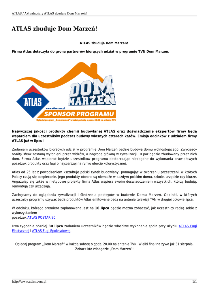 ATLAS / Aktualności / ATLAS zbuduje Dom Marzeń! ATLAS zbuduje Dom Marzeń! ATLAS zbuduje Dom Marzeń! Firma Atlas dołączyła do grona partnerów biorących udział w programie TVN Dom Marzeń. Najwyższej jakości produkty chemii budowlanej ATLAS oraz doświadczenie ekspertów firmy będą wsparciem dla uczestników podczas budowy własnych czterech kątów. Emisja odcinków z udziałem firmy ATLAS już w lipcu! Zadaniem uczestników biorących udział w programie Dom Marzeń będzie budowa domu wolnostojącego. Zwycięzcy reality show zostaną wyłonieni przez widzów, a nagrodą główną w rywalizacji 10 par będzie zbudowany przez nich dom. Firma Atlas wspierać będzie uczestników programu dostarczając niezbędne do wykonania prawidłowych posadzek produkty oraz fugi o najszerszej na rynku ofercie kolorystycznej. Atlas od 25 lat z powodzeniem kształtuje polski rynek budowlany, pomagając w tworzeniu przestrzeni, w których Polacy czują się bezpiecznie. Jego produkty obecne są niemalże w każdym polskim domu, szkole, urzędzie czy biurze. Angażując się także w nietypowe projekty firma Atlas wspiera swoim doświadczeniem wszystkich, którzy budują, remontują czy urządzają. Zachęcamy do oglądania rywalizacji i śledzenia postępów w budowie Domu Marzeń. Odcinki, w których uczestnicy programu używać będą produktów Atlas emitowane będą na antenie telewizji TVN w drugiej połowie lipca. W odcinku, którego premiera zaplanowana jest na 16 lipca będzie można zobaczyć, jak uczestnicy radzą sobie z wykorzystaniem posadzek ATLAS POSTAR 80. Dwa tygodnie później 30 lipca zadaniem uczestników będzie właściwe wykonanie spoin przy użyciu ATLAS Fugi Elastycznej i ATLAS Fugi Epoksydowej. Oglądaj program „Dom Marzeń” w każdą sobotę o godz. 20.00 na antenie TVN. Wielki finał na żywo już 31 sierpnia. Zobacz kto zdobędzie „Dom Marzeń”! http://www.atlas.com.pl 1/1