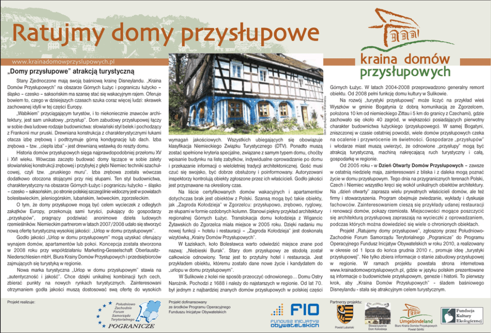 Ratujmy domy przysłupowe www.krainadomowprzyslupowych.pl Stany Zjednoczone mają swoją baśniową krainę Disneylandu. „Kraina Domów Przysłupowych” na obszarze Górnych Łużyc i pograniczu łużycko – śląsko – czesko – saksońskim ma szansę stać się wakacyjnym rajem. Oferuje bowiem to, czego w dzisiejszych czasach szuka coraz więcej ludzi: skrawek zachowanej idylli w tej części Europy. „Wabikiem” przyciągającym turystów, i to niekoniecznie znawców architektury, jest sam unikatowy „przysłup”. Dom zabudowy przysłupowej łączy w sobie dwa ludowe rodzaje budownictwa: słowiański styl belek i pochodzący z Frankonii mur pruski. Drewniana konstrukcja z charakterystycznymi łukami otacza izbę zrębową i podtrzymuje górną kondygnację lub dach. Izba zrębowa – tzw. „ciepła izba” - jest drewnianą wstawką do reszty domu. Historia domów przysłupowych sięga najprawdopodobniej przełomu XV i XVI wieku. Wówczas zaczęto budować domy łączące w sobie zalety słowiańskiej konstrukcji zrębowej i przybyłej z głębi Niemiec techniki szachulcowej, czyli tzw. „pruskiego muru”. Izba zrębowa została wówczas dodatkowo otoczona stojącymi przy niej słupami. Ten styl budownictwa, charakterystyczny na obszarze Górnych Łużyc i pograniczu łużycko – śląsko – czesko – saksońskim, po stronie polskiej szczególnie widoczny jest w powiatach bolesławieckim, jeleniogórskim, lubańskim, lwóweckim, zgorzeleckim. O tym, że domy przysłupowe mogą być celem wycieczek z odległych zakątków Europy, przekonują sami turyści, pukający do gospodarzy „przysłupów”, pragnący podziwiać anonimowe dzieła ludowych rzemieślników. Niemieckim partnerom w latach 2007/2008 udało się stworzyć nową ofertę turystyczną wysokiej jakości: „Urlop w domu przysłupowym”. Godło jakości „Urlop w domu przysłupowym” mogą uzyskać oferujący wynajem domów, apartamentów lub pokoi. Koncepcja została stworzona w 2008 roku przy współdziałaniu Marketing-Gesselschaft OberlausitzNiederschlesien mbH, Biura Krainy Domów Przysłupowych i przedsiębiorców zajmujących się turystyką w regionie. Nowa marka turystyczna „Urlop w domu przysłupowym” stawia na „autentyczność i jakość”. Chce dzięki unikalnej kombinacji tych cech, zbierać punkty na nowych rynkach turystycznych. Zainteresowani otrzymaniem godła jakości muszą dostosować swą ofertę do wysokich Projekt realizuje: Dom przysłupowy w Wolimierzu „Domy przysłupowe” atrakcją turystyczną wymagań jakościowych. Wszystkich ubiegających się obowiązuje klasyfikacja Niemieckiego Związku Turystycznego (DTV). Ponadto muszą zostać spełnione kryteria specjalne, związane z samym typem domu, choćby wpisanie budynku na listę zabytków, indywidualne oprowadzanie po domu i przekazanie informacji o wieloletniej tradycji architektonicznej. Gość musi czuć się swojsko, być dobrze obsłużony i poinformowany. Autoryzowani inspektorzy kontrolują obiekty zgłoszone przez ich właścicieli. Godło jakości jest przyznawane na określony czas. Na liście certyfikowanych domów wakacyjnych i apartamentów dotychczas brak jest obiektów z Polski. Szansą mogą być takie obiekty, jak „Zagroda Kołodzieja” w Zgorzelcu: przysłupowo, zrębowo, ryglowy, ze słupami w formie ozdobnych kolumn. Stanowi piękny przykład architektury regionalnej Górnych Łużyc. Translokacja domu kołodzieja z Wigancic Żytawskich do Zgorzelca miała miejsce w 2005 roku. Dzięki nadaniu mu nowej funkcji – hotelu i restauracji – „Zagroda Kołodzieja” jest doskonałą wizytówką „Krainy Domów Przysłupowych”. W Łaziskach, koło Bolesławca warto odwiedzić miejsce znane pod nazwą: „Niebieski Burak”. Stary dom przysłupowy ze stodołą został całkowicie odnowiony. Teraz jest to przytulny hotel i restauracja. Jest przykładem obiektu, któremu zostało dane nowe życie i kandydatem do „urlopu w domu przysłupowym”. W Sulikowie z kolei nie sposób przeoczyć odnowionego… Domu Ostry Narożnik. Pochodzi z 1688 i należy do najstarszych w regionie. Od lat 70. był jednym z najbardziej znanych domów przysłupowych w polskiej części Projekt dofinansowany ze środków Programu Operacyjnego Funduszu Inicjatyw Obywatelskich Górnych Łużyc. W latach 2004-2008 przeprowadzono generalny remont obiektu. Od 2008 pełni funkcję domu kultury w Sulikowie. Na rozwój „turystyki przysłupowej” może liczyć na przykład wieś Wyszków w gminie Bogatynia (z dobrą komunikacją ze Zgorzelcem, położona 10 km od niemieckiego Zittau i 5 km do granicy z Czechami), gdzie zachowało się około 40 zagród, w większości posiadających pierwotny charakter budownictwa łużyckiego (przysłupowego). W samej Bogatyni, zniszczonej w czasie ostatniej powodzi, wiele domów przysłupowych czeka na ocalenie i przywrócenie im świetności. Gospodarze „przysłupów” i włodarze miast muszą uwierzyć, że odnowione „przysłupy” mogą być atrakcją turystyczną, machiną nakręcającą ruch turystyczny i całą, gospodarkę w regionie. Od 2005 roku - w Dzień Otwarty Domów Przysłupowych – zawsze w ostatnią niedzielę maja, zainteresowani z bliska i z daleka mogą poznać życie w domu przysłupowym. Tego dnia na przygranicznych terenach Polski, Czech i Niemiec wszystko kręci się wokół unikalnych obiektów architektury. Na „dzień otwarty” zaprasza wielu prywatnych właścicieli domów, ale też firmy i stowarzyszenia. Program obejmuje zwiedzanie, wykłady i dyskusje fachowców. Zainteresowaniem cieszą się przykłady udanej restauracji i renowacji domów, pokazy rzemiosła. Miejscowości mogące poszczycić się architekturą przysłupową zapraszają na wycieczki z oprowadzaniem, podczas których można dowiedzieć się wiele o chronionych obiektach. Projekt „Ratujemy domy przysłupowe”, zgłoszony przez PołudniowoZachodnie Forum Samorządu Terytorialnego „Po