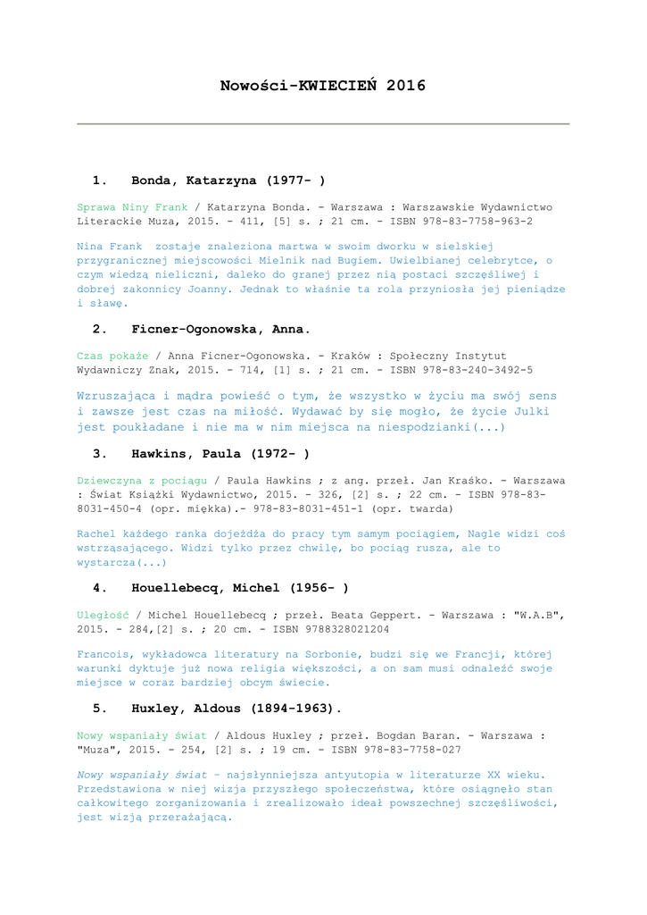 Nowości-KWIECIEŃ 2016 1. Bonda, Katarzyna (1977- ) Sprawa Niny Frank / Katarzyna Bonda. - Warszawa : Warszawskie Wydawnictwo Literackie Muza, 2015. - 411, [5] s. ; 21 cm. - ISBN 978-83-7758-963-2 Nina Frank zostaje znaleziona martwa w swoim dworku w sielskiej przygranicznej miejscowości Mielnik nad Bugiem. Uwielbianej celebrytce, o czym wiedzą nieliczni, daleko do granej przez nią postaci szczęśliwej i dobrej zakonnicy Joanny. Jednak to właśnie ta rola przyniosła jej pieniądze i sławę. 2. Ficner-Ogonowska, Anna. Czas pokaże / Anna Ficner-Ogonowska. - Kraków : Społeczny Instytut Wydawniczy Znak, 2015. - 714, [1] s. ; 21 cm. - ISBN 978-83-240-3492-5 Wzruszająca i mądra powieść o tym, że wszystko w życiu ma swój sens i zawsze jest czas na miłość. Wydawać by się mogło, że życie Julki jest poukładane i nie ma w nim miejsca na niespodzianki(...) 3. Hawkins, Paula (1972- ) Dziewczyna z pociągu / Paula Hawkins ; z ang. przeł. Jan Kraśko. - Warszawa : Świat Książki Wydawnictwo, 2015. - 326, [2] s. ; 22 cm. - ISBN 978-838031-450-4 (opr. miękka).- 978-83-8031-451-1 (opr. twarda) Rachel każdego ranka dojeżdża do pracy tym samym pociągiem, Nagle widzi coś wstrząsającego. Widzi tylko przez chwilę, bo pociąg rusza, ale to wystarcza(...) 4. Houellebecq, Michel (1956- ) Uległość / Michel Houellebecq ; przeł. Beata Geppert. - Warszawa : "W.A.B", 2015. - 284,[2] s. ; 20 cm. - ISBN 9788328021204 Francois, wykładowca literatury na Sorbonie, budzi się we Francji, której warunki dyktuje już nowa religia większości, a on sam musi odnaleźć swoje miejsce w coraz bardziej obcym świecie. 5. Huxley, Aldous (1894-1963). Nowy wspaniały świat / Aldous Huxley ; przeł. Bogdan Baran. - Warszawa : "Muza", 2015. - 254, [2] s. ; 19 cm. - ISBN 978-83-7758-027 Nowy wspaniały świat – najsłynniejsza antyutopia w literaturze XX wieku. Przedstawiona w niej wizja przyszłego społeczeństwa, które osiągnęło stan całkowitego zorganizowania i zrealizowało ideał powszechnej szczęśliwości, jest wizją przerażającą. 6. Lee, Harper (1926-2016) Zabić drozda / Harper Lee ; przeł. Maciej Szymański. - Wyd. 2. - Poznań : Dom Wydawniczy Rebis, 2015. - 420, [1] s. ; 20 cm. - ISBN 978-83-7818-792-9 Lata trzydzieste XX wieku, małe miasteczko na południu USA. Atticus Finch, adwokat i głowa rodziny , broni młodego Murzyna oskarżonego o zgwałcenie biednej białej dziewczyny Mayelli Ewell. Poruszająca opowieść odwołuje się do tego, co w życiu człowieka najcenniejsze: miłości, współczucia i dobroci. 7. Lee, Linda Francis. Emily i Einstein / Linda Francis Lee ; z ang. przeł. Anna Dobrzańska. Warszawa : Wydawnictwo Albatros A. Kuryłowicz, 2014. - 397, [1] s. ; 20 cm. - ISBN 978-83-7885-664-1 Pełna humoru i ciepła opowieść o nadziei i drugiej szansie, którą czasami daje nam życie. Po części komedia obyczajowa, po części melodramat utrzymany w klimacie słynnego filmu Uwierz w ducha. 8. McEwan, Ian (1948- ). Dziecko w czasie / Ian McEwan ; z ang. przeł. Marek Fedyszak. - Wyd. 4. Warszawa : Wydawnictwo Albatros A. Kuryłowicz, 2013. - 270, [1] s. ; 20 cm. - Tyt. oryg.: "The child in time" 1987. - ISBN 978-83-7885-796-9 Jedna chwila nieuwagi w supermarkecie i trzyletnia Kate zostaje porwana, niemal na oczach swojego ojca (…). 9. Meacham, Leila (1938- ). Jak liście na wietrze / Leila Meacham ; z jęz. ang. przeł. Alina SiewiorKuś. - Katowice : Wydawnictwo Sonia Draga, 2014. - 487, [1] s. ; 21 cm. ISBN 978-83-7508-883-0 Miłość, przyjaźń, strata i poczucie winy – historia trojga przyjaciół rozgrywająca się na przestrzeni niemal trzydziestu lat. 10. Olczak-Ronikier, Joanna (1934- ) Wtedy : o powojennym Krakowie / Joanna Olczak-Ronikier. - Kraków : Społeczny Instytut Wydawniczy Znak, 2015. - 345, [2] s. : il. ; 21 cm. ISBN 978-83-240-389-5 Marzec 1945. Janina Mortkowiczowa, współtwórczyni słynnej oficyny wydawniczej, i jej córka Hanna Mortkowicz- Olczakowa- pisarka, po okupacyjnych przejściach znajdują przystań w Krakowie(…). 11. Orbitowski, Łukasz (1977- ). Inna dusza / Łukasz Orbitowski. - Warszawa : od DEski do Deski, 2015. 427,[5] s. ; 21 cm. - ISBN 978-83-65157-00-3 Miasto. Zniszczone, obdrapane i brudne kamienice. Zmęczeni ludzie. pewnego dnia miasto zatrzyma się przerażone zbrodnią. 12. Orłoś, Kazimierz (1935- ). Historia leśnych kochanków i inne opowiadania / Kazimierz Orłoś. - Kraków : Wydawnictwo Literackie, 2013. - 272, [1] s. ; 21 cm. - ISBN 978-83-0805224-2 Piękne, liryczne, okrutne historie ludzi- wszystko co zostaje w oczach. 13. Rusinek, Michał (1972- ) Nic zwyczajnego : o Wisławie Szymborskiej / Michał Rusinek. - Kraków : Społeczny Instytut Wydawniczy Znak, 2016. - 313, [2] s. : il. (gł. kolor.) ; 22 cm. - ISBN 978-83-240-4091-9 Tylko w tej książce spotykamy Wisławę Szymborską, jakiej do tej pory nie znaliśmy. To portret osoby nieprzeciętnej, damy o niezwykłym poczuciu humoru. Portret, który pozwala zbliżyć się do niej i istoty jej poezji. 14. Sabahattin, Ali (1907-1948) Madonna w futrze / Sabahattin Ali ; przeł. Piotr Beza. - Warszawa : Dom Wydawniczy Rebis, 2015. - 246, [1] s. ; 21 cm. - ISBN 978-83-7818-714-1 Fascynująca i tragiczna historia miłosna człowieka nieprzystosowanego do życia w społeczeństwie. 15. Siedlecka, Joanna (1949- ). Biografie odtajnione : z archiwów literackich bezpieki / Joanna Siedlecka. - Poznań : Zysk i S-ka Wydawnictwo, 2015. - 427,[5]s. : fot. ; 23 cm. - ISBN 9788377857731 Autorka przedstawia dramatyczne losy pisarzy rangi Gombrowicza, Broniewskiego i innych, którym machina totalitarnego państwa zrujnowała nie tylko kariery, ale przede wszystkim życie osobiste i prywatne. Zniszczyła zdrowie, rozbiła rodziny, wdarła się głęboko w cztery ściany ich domów, które nie były przystanią, ale nafaszerowaną podsłuchami pułapką. 16. Tomasiewicz, Jacek. Zaprzyjaźnij się z algorytmami : przewodnik dla początkujących i śred