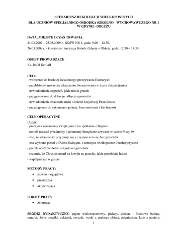 SCENARIUSZ REKOLEKCJI WIELKOPOSTNYCH DLA UCZNIÓW SPECJALNEGO OŚRODKA SZKOLNO - WYCHOWAWCZEGO NR 1 W GDYNII - OBŁUŻU DATA, MIEJSCE I CZAS TRWANIA: 24.03.2009 – 25.03.2009 r., SOSW NR 1, godz. 9.00 – 12.30, 26.03.2009 r. - kościół św. Andrzeja Boboli, Gdynia – Obłuże, godz. 12.30 – 14.30 OSOBY PROWADZĄCE Ks. Rafał Dettlaff CELE - wdrożenie do bardziej świadomego przeżywania Eucharystii - przybliżenie znaczenia sakramentu bierzmowania w życiu chrześcijanina - uświadomienie zagrożeń, jakie niesie grzech - przygotowanie do dobrego odbycia spowiedzi - uświadomienie znaczenia męki i śmierci krzyżowej Pana Jezusa - przystąpienie do sakramentu pokuty, bierzmowania i Eucharystii CELE OPERACYJNE Uczeń: - przeżywa sakramenty święte jako czas spotkania z Bogiem - potrafi nazwać przedmioty i paramenty liturgiczne używane w czasie Mszy św. - wie, że sakramenty przyjmuje się z czystym sercem, bez grzechów - zna wybrane pieśni o Duchu Świętym, o tematyce wielkopostne i eucharystyczne - potrafi odróżnić dobre uczynki od grzechów - rozumie, że Chrystus umarł na krzyżu za grzechy, jakie popełniają ludzie - współpracuje w grupie METODY PRACY: • słowno – oglądowa • praktyczna • aktywizująca FORMY PRACY: • zbiorowa ŚRODKI DYDAKTYCZNE: papier wielowarstwowy, plakaty, zielone i fioletowe balony, sznurki, żółte wstążki, cukierki, szyszki, worki z grubego płótna, pogniecione kule z papieru, 1 taczka, kartony, płomienie z czerwonego papieru, kościół z papieru z otwieranymi witrażami, konfesjonał, stuła, ornat, komża, alba, naczynia liturgiczne, dzwonki i gong, prześcieradła, śpiewnik, suche gałęzie, żywy kwiat, winogrona, napoje z winogron, chleby, niszczarka do papieru, wentylator, świeca, koperty, obrazki: z dobrymi uczynkami, ze złymi uczynkami, z darami Ducha Świętego, kolorowe kartki, brystol, świeca, dary ołtarza, magnetofon, płyta z piosenkami, symbole Męki Pańskiej: belka, korona cierniowa, gwoździe, młotek, bicz, prezentacje multimedialne, klej, tablica korkowa, kartki z zadaniami, kolorowe farby plakatowe, talerzyk, krzyże i pamiątki dla bierzmowanych, karty bierzmowania, ceremoniał Mszy św. PRZEBIEG ZAJĘĆ: wtorek, 24.03.2009 r., DZIEŃ SAKRAMENTU EUCHARYSTII i BIERZMOWANIA 1. Wstęp – wspólny śpiew: pieśni przygotowujące do Eucharystii z udzieleniem sakramentu bierzmowania (Załącznik nr 1). Po śpiewie następuje przerwa. 2. Powitanie. Wyjaśnienie czym są rekolekcje i do jakich wydarzeń przygotowują. Wprowadzenie do sakramentów św.: wycięty w brystolu zarys kościoła z otwieranymi witrażami. Uczniowie po kolei otwierają kolejne okna odkrywając 7 sakramentów świętych. Przedstawienie tematu rekolekcji: ponieważ uczniowie Ośrodka przystąpią na zakończenie rekolekcji do 3 sakramentów świętych: Eucharystii, Bierzmowania i Pokuty, to w kolejnych dniach zajmiemy się ich omówieniem. Część I – SAKRAMENT EUCHARYSTII 3. Ostatnia Wieczerza – pierwsza Msza Święta. Prezentacja multimedialna – omówienie malowidła Leonarda da Vinci „Ostatnia Wieczerza”. Wyjaśnienie co oznacza słowo wieczerza i dlaczego obraz nosi tytuł „Ostatnia Wieczerza”. 12 uczniów losuje kartki z imionami 12 Apostołów i Pana Jezusa. Zasiadają za przygotowanym stołem podobnie jak na malowidle Leonarda da Vinci. Na stole leżą bochenki chleba, winogrona oraz sok z winogron. Rekolekcjonista opowiada historię spotkania Jezusa z Apostołami w Wieczerniku. „Jezus” łamie chleb i podaje uczniom, później nalewa sok z winogron. Biorący udział w rekolekcjach powtarzają słowa Jezusa „BIERZCIE I JEDZCIE Z TEGO WSZYSCU, TO JEST BOWIEM CIAŁO MOJE, KTÓRE ZA WAS BĘDZIE WYDANE” oraz „BIERZCIE I PIJCIE Z NIEGO WSZYSCY, TO JEST BOWIEM KIELICH KRWI MOJEJ NOWEGO I WIECZNEGO PRZYMIERZA, KTÓRA ZA WAS I ZA WIELU BĘDZIE PRZELANA NA ODPUSZCZENIE GRZECHÓW. TO CZYŃCIE NA MOJĄ PAMIĄTKĘ”. Pan Jezus chciał, by to co się wydarzyło w Wieczerniku Apostołowie CZYNILI NA JEGO PAMIĄTJKĘ, czyli powtarzali. Do dziś to wydarzenie codziennie się powtarza 2 i nazywamy je Mszą Świętą, albo inaczej EUCHARYSTIĄ. Można więc powiedzieć, że Ostatnia Wieczerza była pierwszą Mszą Świętą. Uczniowie wracają na miejsca. 4. Obowiązek udziału w Eucharystii. Przypomnienie III Przykazania Bożego „Pamiętaj abyś dzień święty święcił” i wyjaśnienie na czym ma polegać aktywny udział w Mszy św. Przypomnienie, że do Komunii przystępujemy tylko z sercem czystym, bez grzechów. 5. Kościół – miejsce sprawowania Eucharystii. Prezentacja multimedialna: jak wygląda mój kościół, ważne miejsca w kościele. Rekolekcjonista objaśnia nazwy przedstawionych na ilustracjach części i element wyposażenia kościoła. 6. Naczynia i paramenty liturgiczne. Przedstawienie naczyń i paramentów używanych w czasie sprawowania Eucharystii (kielich, patena, korporał, palka, ampułki, dzwonki, gong). Dwie klasy biorą udział w konkursie: metodą origami wykonują z kółek - jedna grupa monstrancje, a druga kielich. Uczniowie klas młodszych z pomocą wychowawców sklejają kielichy z wielowarstwowego papieru. Prace zostają umieszczone na tablicy korkowej. 7. Szaty liturgiczne. Pokaz i omówienie strojów używanych w liturgii oraz tego, kto jakie szaty ubiera. Wyznaczeni uczniowie ubierają stój ministranta. Biorący udział w rekolekcjach powtarzają nazwy strojów oglądając je na prezentacji multimedialnej. Wszyscy uczestnicy rekolekcji przygotowują ornat, jaki będzie używany do sprawowania Mszy św. szkolnej. Na białym płótnie ornatu odbijają kształty dłoni umoczone wcześniej w kolorowych farbach. Następuje przerwa. 8. Emblematy Eucharystyczne. Rekolekcjonista wywołuje chętnych do kolejnego zadania: na sali w kształcie kiści winogron umieszczono nadmuchane balony, a w nich elementy składające się na emblemat eucharystyczny. Kolejni uczniowie przebijaj