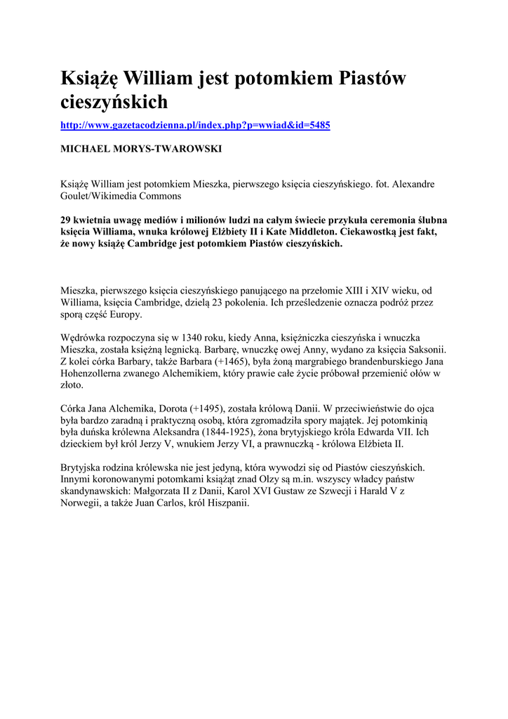 Książę William jest potomkiem Piastów cieszyńskich http://www.gazetacodzienna.pl/index.php?p=wwiad&id=5485 MICHAEL MORYS-TWAROWSKI Książę William jest potomkiem Mieszka, pierwszego księcia cieszyńskiego. fot. Alexandre Goulet/Wikimedia Commons 29 kwietnia uwagę mediów i milionów ludzi na całym świecie przykuła ceremonia ślubna księcia Williama, wnuka królowej Elżbiety II i Kate Middleton. Ciekawostką jest fakt, że nowy książę Cambridge jest potomkiem Piastów cieszyńskich. Mieszka, pierwszego księcia cieszyńskiego panującego na przełomie XIII i XIV wieku, od Williama, księcia Cambridge, dzielą 23 pokolenia. Ich prześledzenie oznacza podróż przez sporą część Europy. Wędrówka rozpoczyna się w 1340 roku, kiedy Anna, księżniczka cieszyńska i wnuczka Mieszka, została księżną legnicką. Barbarę, wnuczkę owej Anny, wydano za księcia Saksonii. Z kolei córka Barbary, także Barbara (+1465), była żoną margrabiego brandenburskiego Jana Hohenzollerna zwanego Alchemikiem, który prawie całe życie próbował przemienić ołów w złoto. Córka Jana Alchemika, Dorota (+1495), została królową Danii. W przeciwieństwie do ojca była bardzo zaradną i praktyczną osobą, która zgromadziła spory majątek. Jej potomkinią była duńska królewna Aleksandra (1844-1925), żona brytyjskiego króla Edwarda VII. Ich dzieckiem był król Jerzy V, wnukiem Jerzy VI, a prawnuczką - królowa Elżbieta II. Brytyjska rodzina królewska nie jest jedyną, która wywodzi się od Piastów cieszyńskich. Innymi koronowanymi potomkami książąt znad Olzy są m.in. wszyscy władcy państw skandynawskich: Małgorzata II z Danii, Karol XVI Gustaw ze Szwecji i Harald V z Norwegii, a także Juan Carlos, król Hiszpanii.