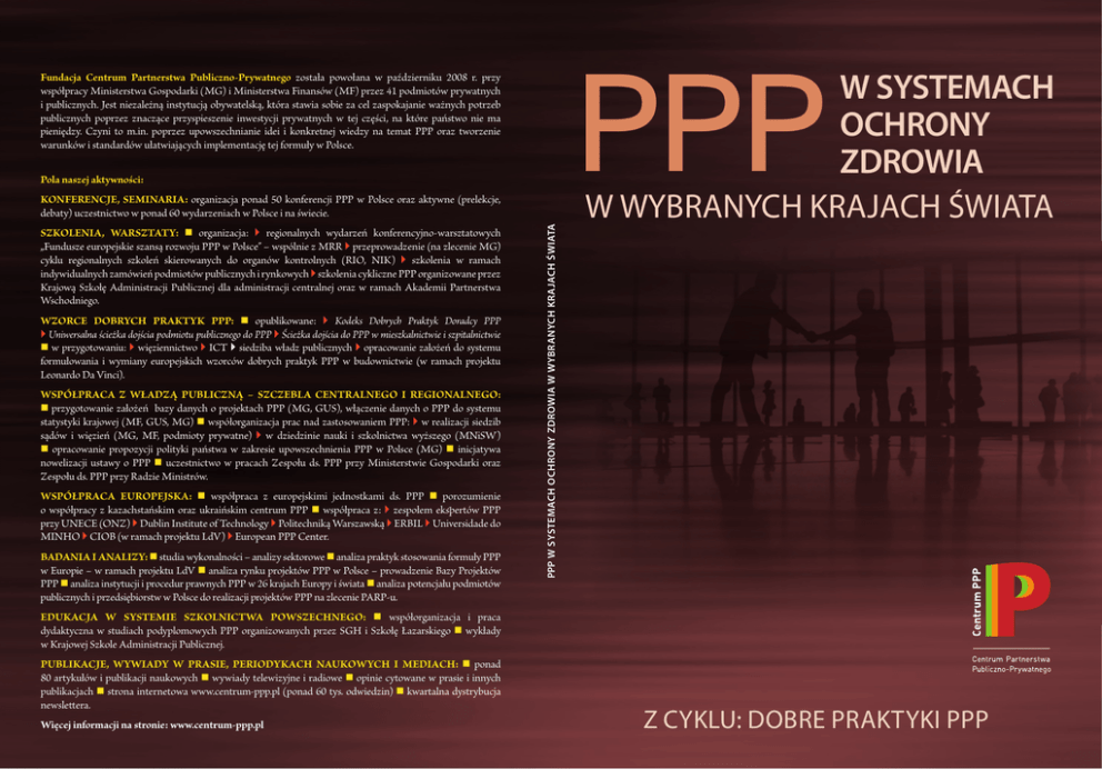 PPP Fundacja Centrum Partnerstwa Publiczno-Prywatnego została powołana w październiku 2008 r. przy współpracy Ministerstwa Gospodarki (MG) i Ministerstwa Finansów (MF) przez 41 podmiotów prywatnych i publicznych. Jest niezależną instytucją obywatelską, która stawia sobie za cel zaspokajanie ważnych potrzeb publicznych poprzez znaczące przyspieszenie inwestycji prywatnych w tej części, na które państwo nie ma pieniędzy. Czyni to m.in. poprzez upowszechnianie idei i konkretnej wiedzy na temat PPP oraz tworzenie warunków i standardów ułatwiających implementację tej formuły w Polsce. Pola naszej aktywności: SZKOLENIA, WARSZTATY: organizacja: regionalnych wydarzeń konferencyjno-warsztatowych „Fundusze europejskie szansą rozwoju PPP w Polsce” – wspólnie z MRR przeprowadzenie (na zlecenie MG) cyklu regionalnych szkoleń skierowanych do organów kontrolnych (RIO, NIK) szkolenia w ramach indywidualnych zamówień podmiotów publicznych i rynkowych szkolenia cykliczne PPP organizowane przez Krajową Szkołę Administracji Publicznej dla administracji centralnej oraz w ramach Akademii Partnerstwa Wschodniego. WZORCE DOBRYCH PRAKTYK PPP: opublikowane: Kodeks Dobrych Praktyk Doradcy PPP Uniwersalna ścieżka dojścia podmiotu publicznego do PPP Ścieżka dojścia do PPP w mieszkalnictwie i szpitalnictwie w przygotowaniu: więziennictwo ICT siedziba władz publicznych opracowanie założeń do systemu formułowania i wymiany europejskich wzorców dobrych praktyk PPP w budownictwie (w ramach projektu Leonardo Da Vinci). WSPÓŁPRACA Z WŁADZĄ PUBLICZNĄ – SZCZEBLA CENTRALNEGO I REGIONALNEGO: przygotowanie założeń bazy danych o projektach PPP (MG, GUS), włączenie danych o PPP do systemu statystyki krajowej (MF, GUS, MG) współorganizacja prac nad zastosowaniem PPP: w realizacji siedzib sądów i więzień (MG, MF, podmioty prywatne) w dziedzinie nauki i szkolnictwa wyższego (MNiSW) opracowanie propozycji polityki państwa w zakresie upowszechnienia PPP w Polsce (MG) inicjatywa nowelizacji ustawy o PPP uczestnictwo w pracach Zespołu ds. PPP przy Ministerstwie Gospodarki oraz Zespołu ds. PPP przy Radzie Ministrów. WSPÓŁPRACA EUROPEJSKA: współpraca z europejskimi jednostkami ds. PPP porozumienie o współpracy z kazachstańskim oraz ukraińskim centrum PPP współpraca z: zespołem ekspertów PPP przy UNECE (ONZ) Dublin Institute of Technology Politechniką Warszawską ERBIL Universidade do MINHO CIOB (w ramach projektu LdV) European PPP Center. BADANIA I ANALIZY: studia wykonalności – analizy sektorowe analiza praktyk stosowania formuły PPP w Europie – w ramach projektu LdV analiza rynku projektów PPP w Polsce – prowadzenie Bazy Projektów PPP analiza instytucji i procedur prawnych PPP w 26 krajach Europy i świata analiza potencjału podmiotów publicznych i przedsiębiorstw w Polsce do realizacji projektów PPP na zlecenie PARP-u. PPP W SYSTEMACH OCHRONY ZDROWIA W WYBRANYCH KRAJACH ŚWIATA KONFERENCJE, SEMINARIA: organizacja ponad 50 konferencji PPP w Polsce oraz aktywne (prelekcje, debaty) uczestnictwo w ponad 60 wydarzeniach w Polsce i na świecie. W SYSTEMACH OCHRONY ZDROWIA W WYBRANYCH KRAJACH ŚWIATA EDUKACJA W SYSTEMIE SZKOLNICTWA POWSZECHNEGO: współorganizacja i praca dydaktyczna w studiach podyplomowych PPP organizowanych przez SGH i Szkołę Łazarskiego wykłady w Krajowej Szkole Administracji Publicznej. PUBLIKACJE, WYWIADY W PRASIE, PERIODYKACH NAUKOWYCH I MEDIACH: ponad 80 artykułów i publikacji naukowych wywiady telewizyjne i radiowe opinie cytowane w prasie i innych publikacjach strona internetowa www.centrum-ppp.pl (ponad 60 tys. odwiedzin) kwartalna dystrybucja newslettera. Więcej informacji na stronie: www.centrum-ppp.pl Z CYKLU: DOBRE PRAKTYKI PPP Praca zbiorowa pod redakcją Jolanty Kalecińskiej i dr Ireny Herbst Autorzy: dr Irena Herbst,Przemysław Zaremba, Bartosz Mysiorski; Fundacja Centrum PPP Jolanta Kalecińska; White & Case W. Daniłowicz, W. Jurcewicz i Wspólnicy – Kancelaria Prawna sp.k. Jur Gruszczyński; Baker & McKenzie Gruszczyński i Wspólnicy Kancelaria Prawna sp.k. Lilianna Bogusz; PwC Wadim Kurpias, Maciej Ziółkowski, Paul Smith, Simon Hayes; CMS Cameron McKenna Jan Kozak; niezależny ekspert Jarosław Dąbrowski, Patryk Darowski; Deloitte Mirosława Blank; Związek Polskiego Leasingu (BRE Leasing Sp. z o.o.) Agata Jaździk; niezależny ekspert Paweł Pajchel, Tadeusz Blecha; Bovis Lend Lease Sp z o. o. Niniejsza publikacja została przygotowana przez Fundację Centrum PPP, wyłącznie w celach informacyjnych i nie stanowi profesjonalnego doradztwa w tym zakresie. Wyłączną odpowiedzialność za decyzje, podjęte lub zaniechane na podstawie niniejszej publikacji lub z wykorzystaniem wniosków w nim zawartych, ponosi odbiorca. Właścicielem majątkowych praw autorskich jest Fundacja Centrum PPP. Osoby, które przygotowały powyższy materiał, niniejszym oświadczają, że zawiera on poglądy odzwierciedlające ich osobistą wiedzę na ten temat. Fundacja Centrum PPP dołożyła należytej staranności przy sporządzaniu publikacji, w celu zapewnienia, iż zawarte w niej informacje nie są błędne lub nieprawdziwe w dniu ich publikacji. Fundacja Centrum PPP nie ponosi odpowiedzialności za ich prawdziwość i kompletność, jak również nie odpowiada za jakiekolwiek szkody powstałe w wyniku wykorzystywania niniejszej publikacji lub zawartych w niej informacji. Żadna część, jak i całość utworu zawarta w niniejszej publikacji nie może być powielana i rozpowszechniania (w tym także w sposób elektroniczny lub mechaniczny) na wszelkich polach eksploatacji włącznie z kopiowaniem, szeroko pojętą digitalizacją, fotokopiowaniem lub kopiowaniem, w tym także zamieszczaniem w internecie – bez pisemnej zgody Fundacji Centrum PPP. Jakiekolwiek użycie lub wykorzystanie utworu w całości lub w części bez zgody Fundacji Centrum PPP lub autorów z naruszeniem prawa jest zabronione pod 