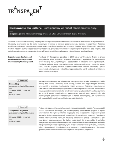 Sieciowanie dla kultury. Profesjonalny warsztat dla liderów kultury. —— miejsce: galeria Mieszkanie Gepperta / ul. Ofiar Oświęcimskich 1/2 / Wrocław Działanie „Sieciowanie dla kultury” to program, którego celem jest zbliżenie i współdziałanie przedstawicieli różnych sektorów. Warsztaty skierowane są do osób związanych z kulturą z sektora pozarządowego, biznesu i urzędników. Podczas sześciotygodniowego, intensywnego projektu skupimy się na wzajemnym poznaniu (analiza sytuacji i potrzeb), określimy możliwe wspólne punkty współpracy i współdziałania, przepracujemy możliwe wspólne przedsięwzięcia. Ideą projektu jest wyjście poza branżowe przyzwyczajenia, rozwój kreatywności i synergii poprzez intersektorowe współdziałanie. Organizatorem działania jest wrocławska Fundacja Sztuki Współczesnej Art Transparent. 1. Warsztat Networking prowadzenie: Agata Makowska —— 12 maja 2016 / czwartek —— 9:00 — 15:00 2. Warsztat Zarządzanie projektem prowadzenie: Agata Makowska —— 19 maja 2016 / czwartek —— 9:00 — 15:00 Fundacja Art Transparent powstała w 2005 roku we Wrocławiu. Tworzy ją grupa specjalistów wielu dziedzin: artystów, kuratorów i wykładowców związanych z wrocławską ASP, psychologów i specjalistów w obszarze nauk społecznych. Fundacja realizuje swoje cele, związane ze sztuką współczesną i tematyką społeczną, poprzez projekty lokalne i ogólnopolskie oraz oddolne inicjatywy i próby konsolidacji artystycznego i intelektualnego środowiska wokół bieżących problemów społeczno-artystycznych. Na warsztacie dowiemy się od podstaw, na czym polega sztuka networkingu i jakie zasady nim rządzą. Zbadamy, które zasoby, własne oraz organizacyjne, możemy uruchomić w procesie budowania relacji wymiany. Poznamy standardowe i poszukamy niestandardowych sposobów skutecznego networkowania, potrenujemy nawiązywanie relacji oraz sztukę ich utrzymywania i pogłębiania. Ponadto przyjrzymy się sobie i swoim organizacjom z perspektywy potrzeb oraz atrakcyjności dla potencjalnych partnerów biznesowych, a także zaplanujemy, jak wprowadzić lub wesprzeć aktywność networkingową w organizacjach. Project management to morze koncepcji, narzędzi, sposobów i zasad. Poznamy część z nich, uprzednio definiując jak najprecyzyjniej podstawowe pojęcia i reguły uniwersalne. Na tym spotkaniu przyjrzymy się zarządzaniu projektami przez soczewkę kultury organizacyjnej, komunikacji i zarządzania grupami. Poszukamy metod, które pozwolą nam jak najlepiej zaplanować pracę i zarządzać z jak najwyższym poszanowaniem dla kultury organizacji, jej pracowników i wartości. Jednym z ważnych tematów wewnątrz tych rozważań będzie komunikacja na poziomie interpersonalnym oraz organizacyjnym. W celu urozmaicenia spotkania, poznamy kilka interesujących i funkcjonalnych narzędzi – metodologicznych i technologicznych, które skutecznie ułatwią nam proces zarządzania projektem. 3. Warsztat Fundraising i współpraca NGOs z biznesem prowadzenie: Martyna Żak —— 3 czerwca 2016 / piątek —— 9:00 — 15:00 Szkolenie z fundraisingu biznesowego wprowadzi uczestników projektu do tematu współpracy NGOs z firmami. Podczas 6–godzinnych warsztatów poznamy twarde narzędzia do nawiązania pierwszej współpracy, takie jak: Matryca sponsorska ® oraz Technika elewator pitch. Ponadto warsztaty przygotują uczestników do pierwszego spotkania z biznesem oraz budowania długotrwałych relacji po podpisaniu pierwszej umowy. 4. Podsumowanie projektu Spotkanie uczestników warsztatów podczas Przeglądu Sztuki SURVIVAL (wydarzenia organizowanego przez Fundację Art Transparent) —— 27 czerwca 2016 / poniedziałek / 12:00 —— miejsce: Fabryka Automatów Tokarskich FAT HACO, ul. Grabiszyńska 281, Wrocław Osoby zainteresowane udziałem w warsztatach prosimy o wypełnienie ankiety zgłoszeniowej do 8 maja: http://goo.gl/forms/64eFzcEj2G Autorzy programu: Karolina Bieniek Menadżerka kultury, aktywistka, doktor nauk społecznych. Współtwórczyni galerii Mieszkanie Gepperta i członkini Zarządu Fundacji Art Transparent. Współautorka aplikacji Wrocławia w konkursie o tytuł Europejskiej Stolicy Kultury. Pasjonuje się zarządzaniem, odnajdywaniem nowych dróg, poszukiwaniem nietypowych rozwiązań. Aktywnie zajmuje się optymalizacją procesów. Wszystkie te umiejętności wciela w życie będąc mamą 2-letniej Niny. Jan Wais Niderlandysta i germanista, absolwent Uniwersytetu Wrocławskiego, studiował również komunikację międzykulturową w Belgii i w Holandii. Od ponad 10 lat w Biurze Współpracy z Zagranicą zajmuje się projektami międzynarodowymi (edukacja europejska, przedsięwzięcia kulturalne, wystawy, konferencje itp.). Był członkiem ekipy starającej się o pozyskanie przez Wrocław tytułu Europejskiej Stolicy Kultury 2016. Fan amerykańskich wysokobudżetowych produkcji filmowych głównego nurtu i literatury charakteryzującej się jak najprostszym stylem. Trenerki Agata Makowska Psycholożka, trenerka, PRówka i producentka, zaangażowana w sferę kultury, a szczególnie sztuki współczesnej. Przez dekadę pracowała dla i współprowadziła dwie Fundacje: Art Transparent i All That Art!, współorganizowała Przegląd Sztuki SURVIVAL, Europejski Kongres Kultury we Wrocławiu oraz współprowadziła galerie sztuki współczesnej: Mieszkanie Gepperta i mia ART GALLERY we Wrocławiu. W pracy zespołowej wierzy, że komunikacja to kamień milowy sukcesu. Drugą połowę jej życia od zawsze pochłaniał ruch – również tancerka, choreograf, trenerka Pilates i Jogi. Od ponad 10 lat prowadzi własny biznes – studio ruchu, który rozwija i transformuje w oparciu o sieć przyjacielskich kontaktów biznesowych i długoterminowe relacje z klientami. Wyznawczyni ruchu slow, rowerzystka i wegetarianka. Od półtora roku również mama. Martyna Żak Założycielka Instytutu Fundraisingu